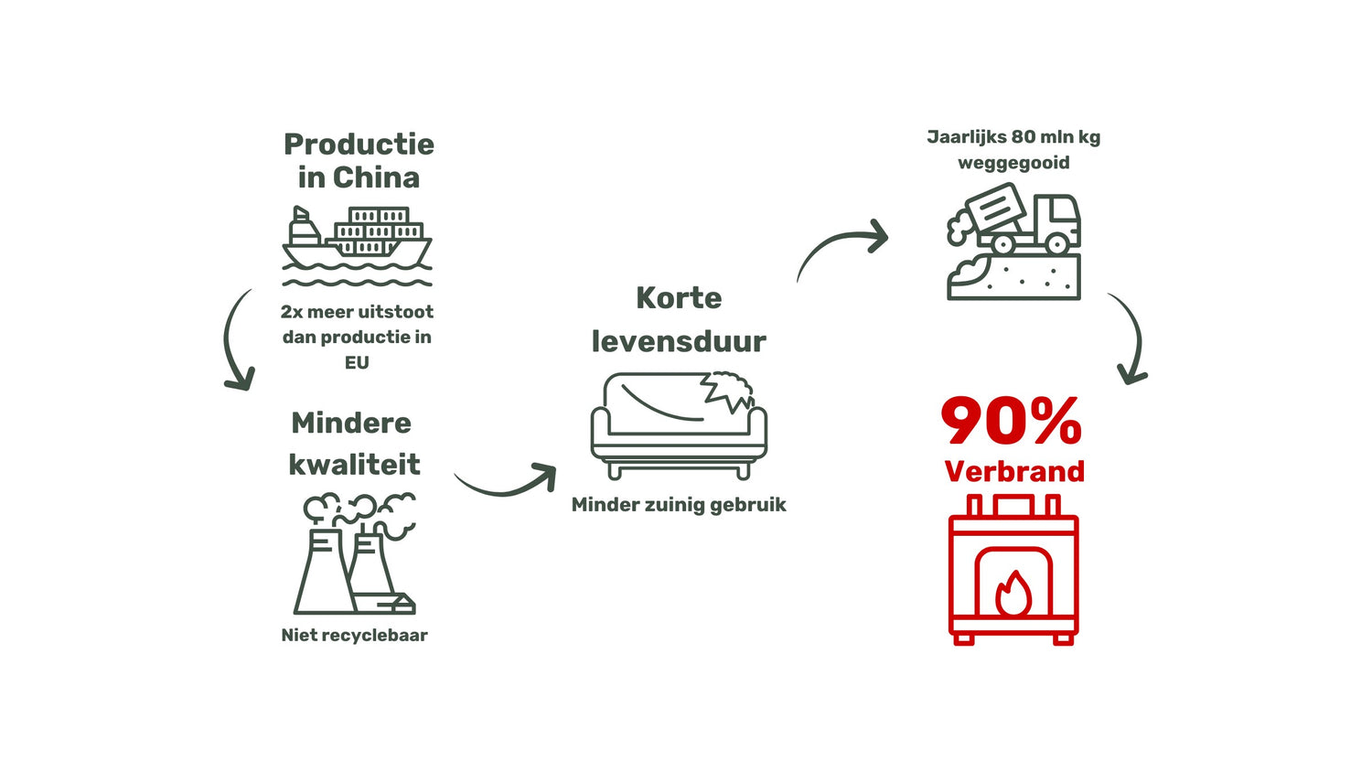 Doordat hergebruik erg onaantrekkelijk is kiezen we eerder voor 'fast furniture": Goedkoop maar van matige kwaliteit. Waardoor de bank snel weer bij de stort terechtkomt.