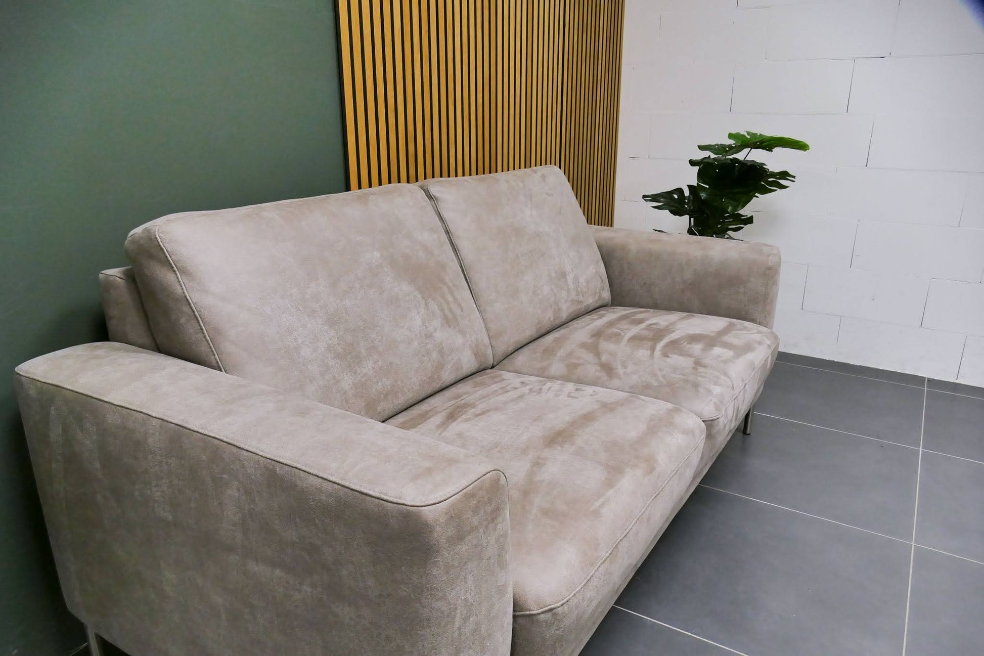 2,5-zits rechte bank in grijs microvezel met industriële uitstraling en strakke lijnen. Comfortabele zit met een rustige, tijdloze vormgeving. Opgevuld voor langdurig zitcomfort.
