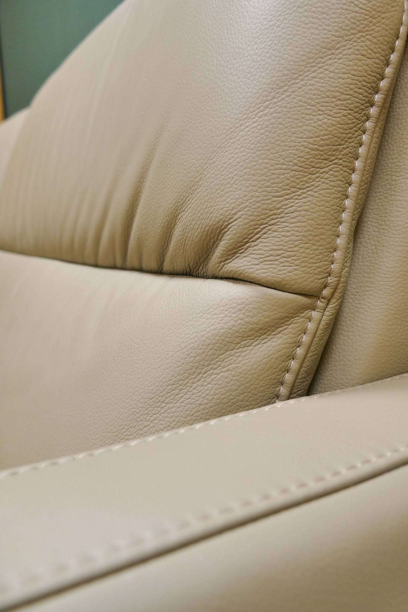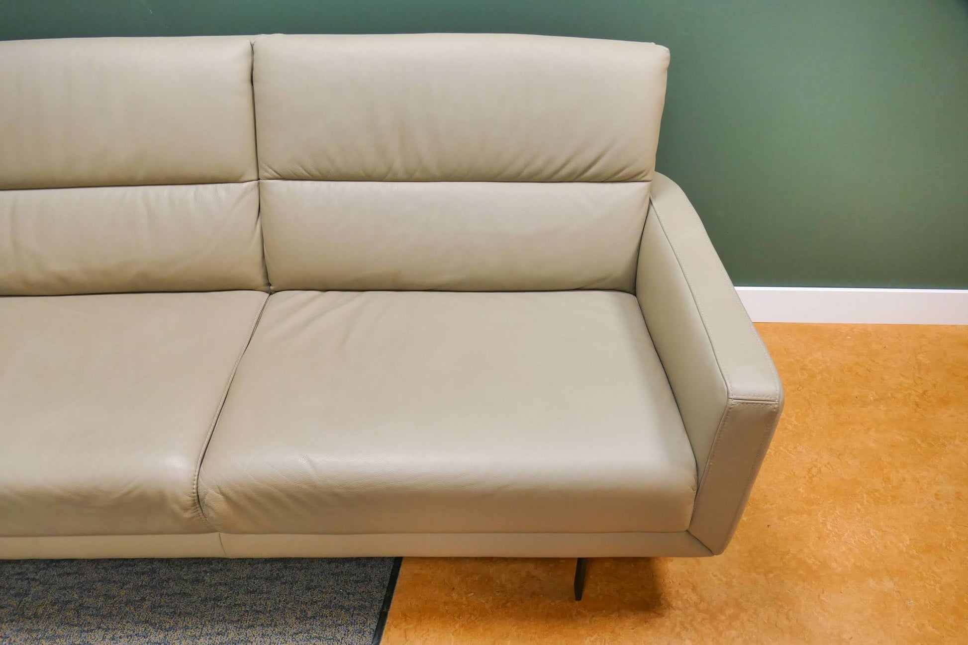 Prominent T501 rechte bank in beige analine leer met vaste zit- en rugkussens en hoge rugleuning. Tijdloos model met comfortabele en stevige zit. Opgevuld voor langdurig zitcomfort.