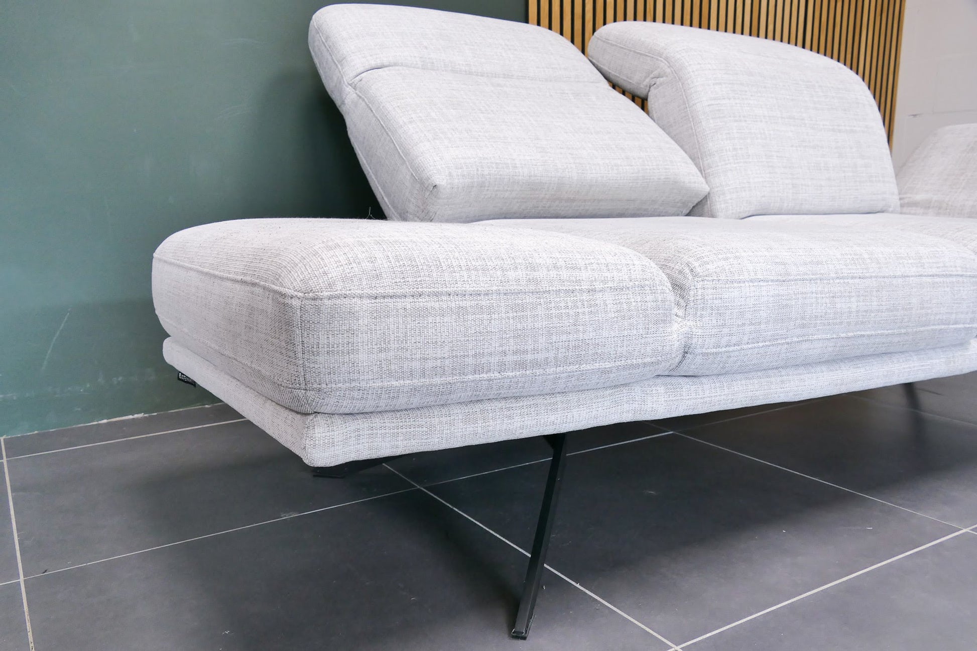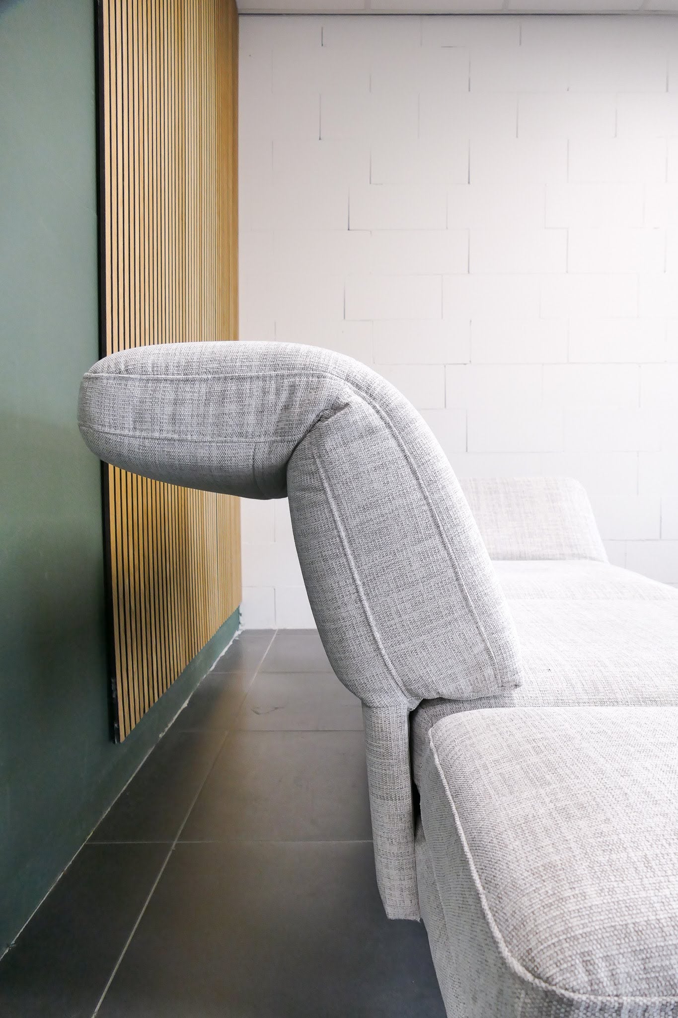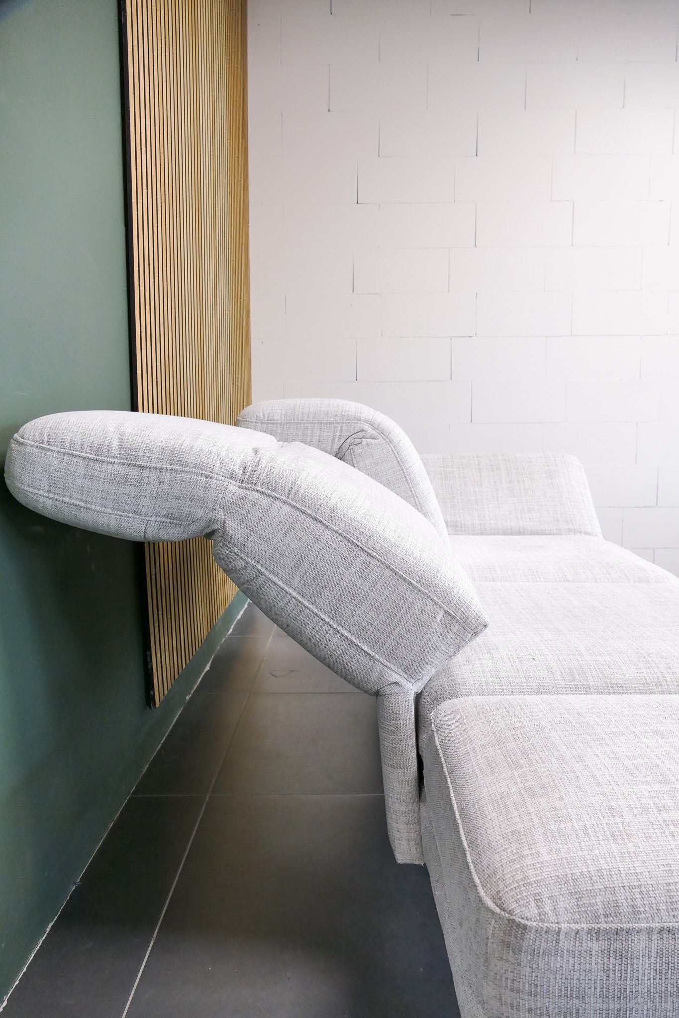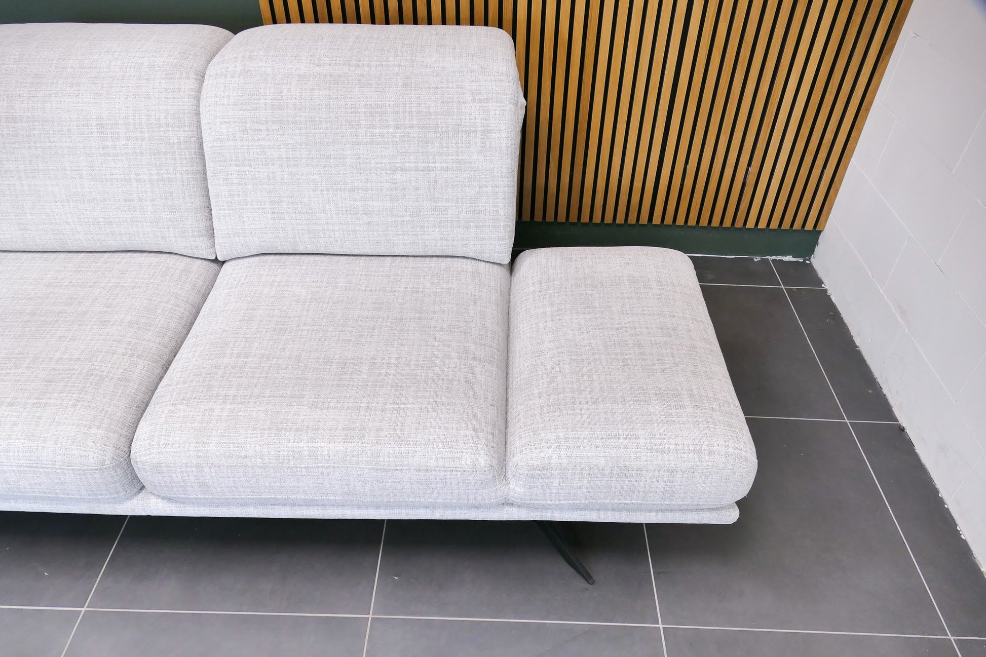 Exclusieve rechte bank van Baenks in een wit-grijze gemêleerde stof. De Stafford onderscheidt zich door zijn verstelbare arm- en hoofdsteunen en een draaibaar zitgedeelte dat extra comfort en flexibiliteit biedt. De bank verkeert in uitstekende staat en voelt als nieuw aan – ideaal voor een modern interieur dat luxe en comfort combineert.