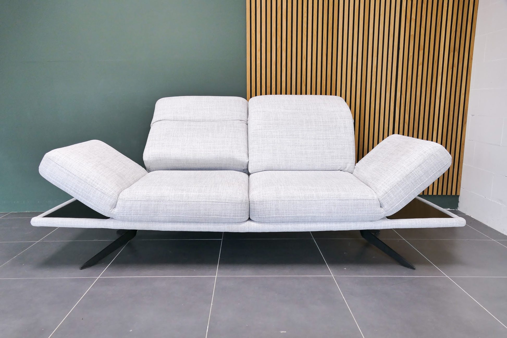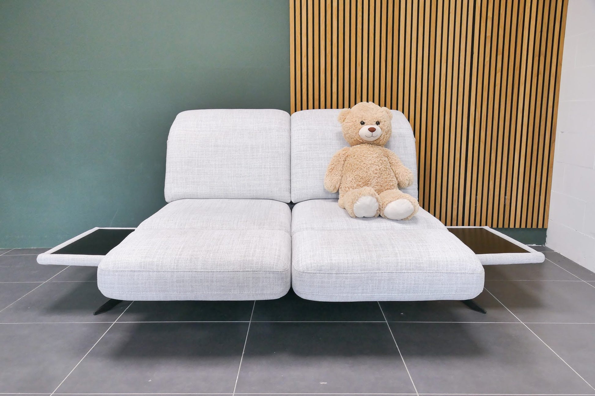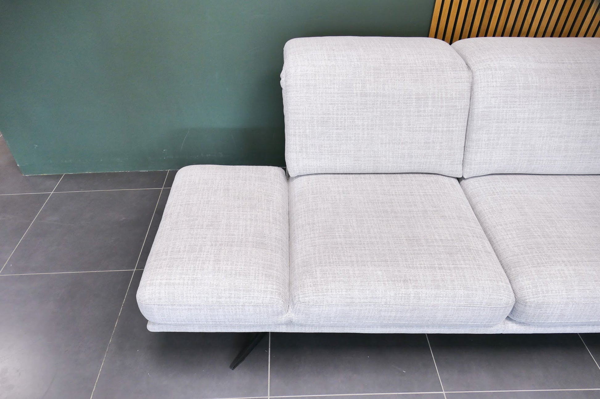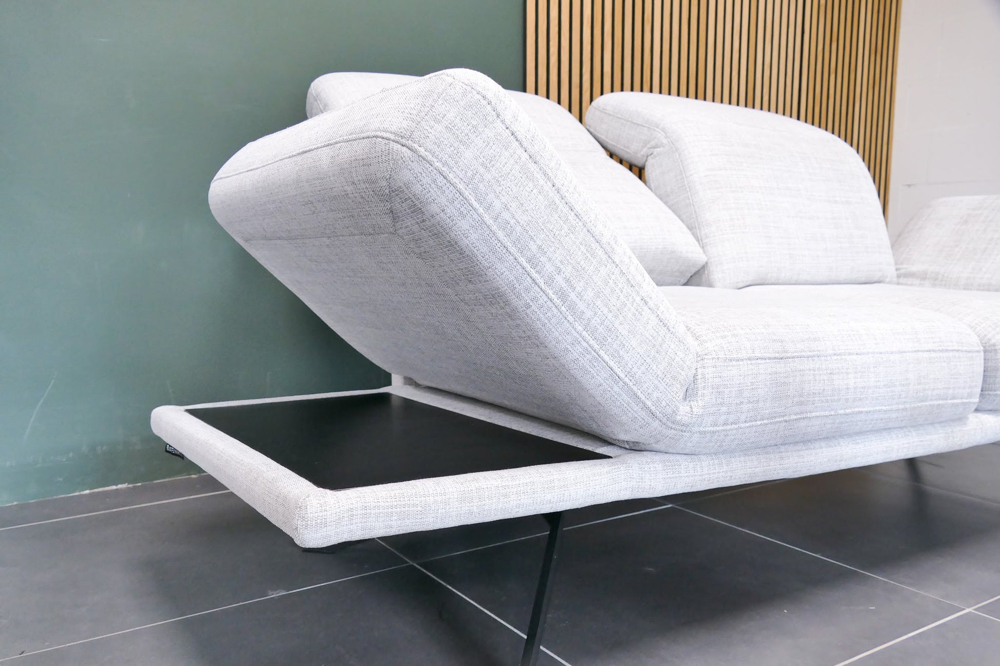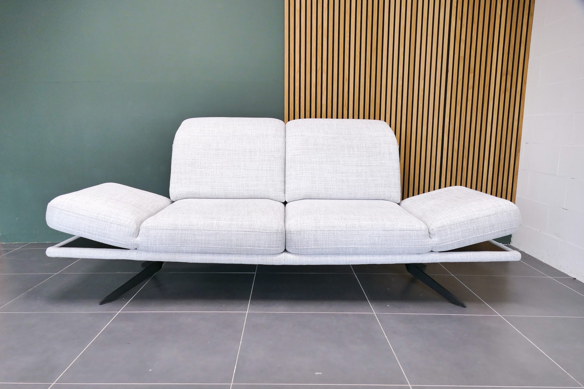 Exclusieve rechte bank van Baenks in een wit-grijze gemêleerde stof. De Stafford onderscheidt zich door zijn verstelbare arm- en hoofdsteunen en een draaibaar zitgedeelte dat extra comfort en flexibiliteit biedt. De bank verkeert in uitstekende staat en voelt als nieuw aan – ideaal voor een modern interieur dat luxe en comfort combineert.