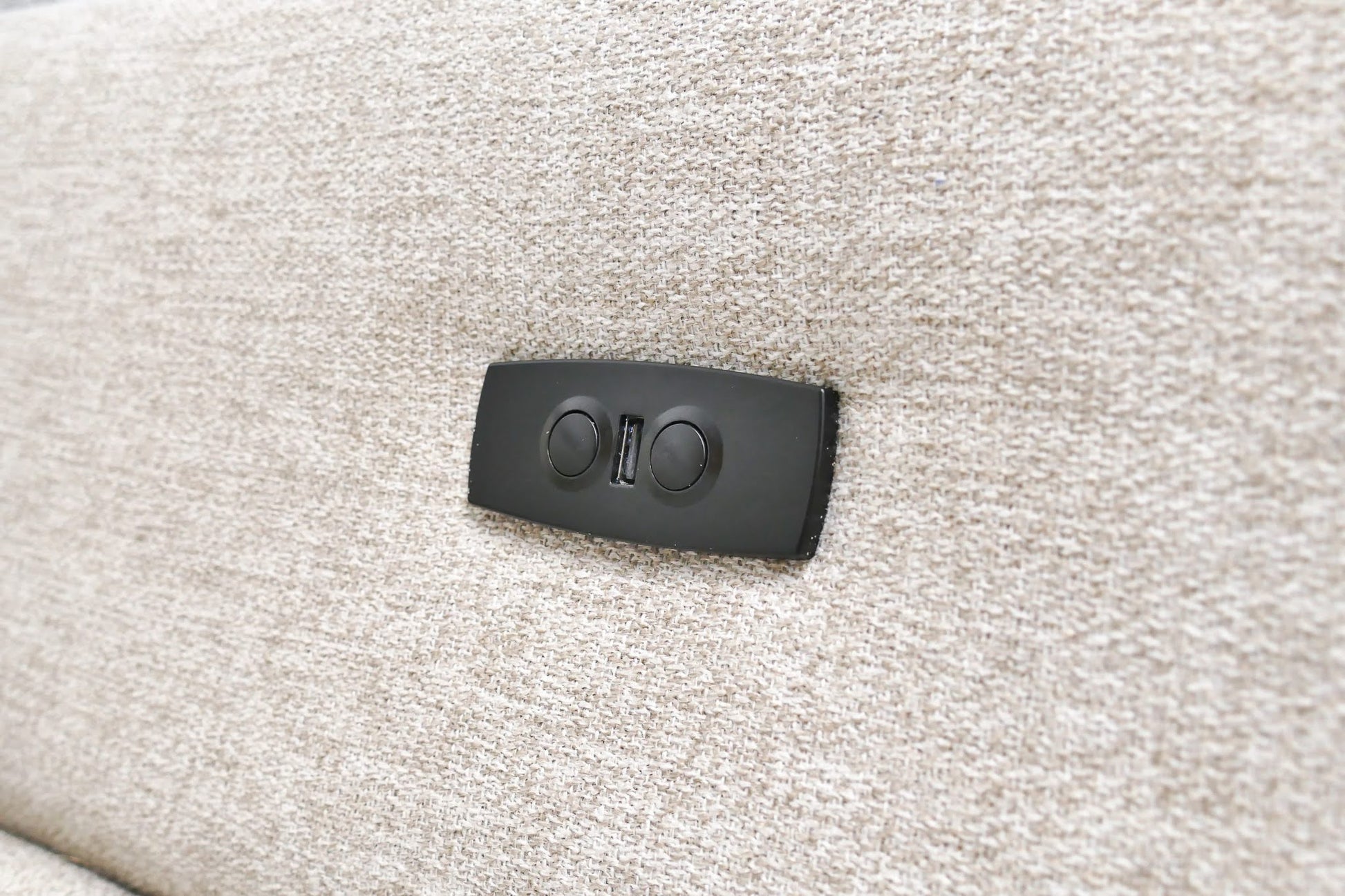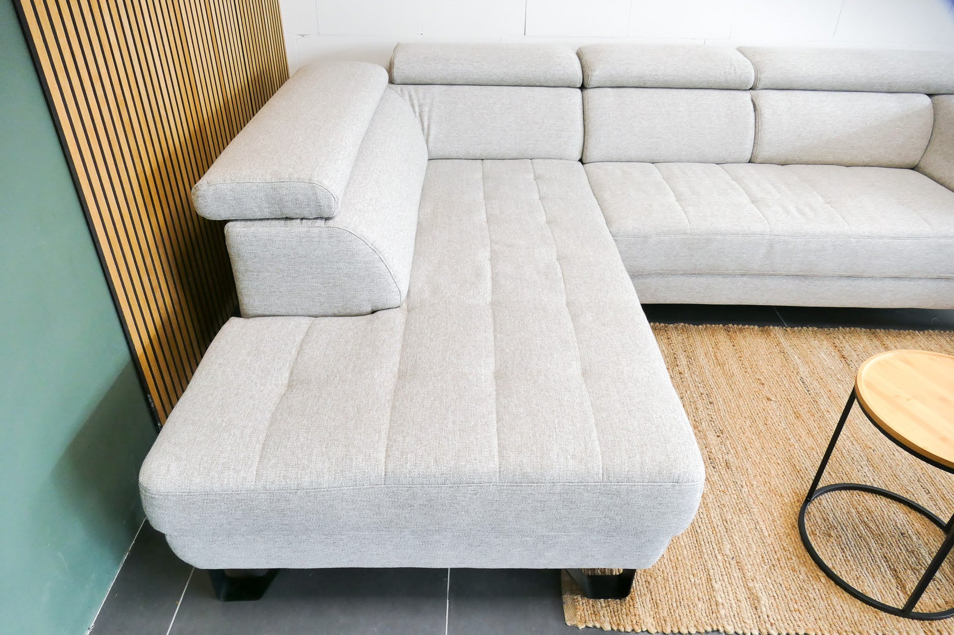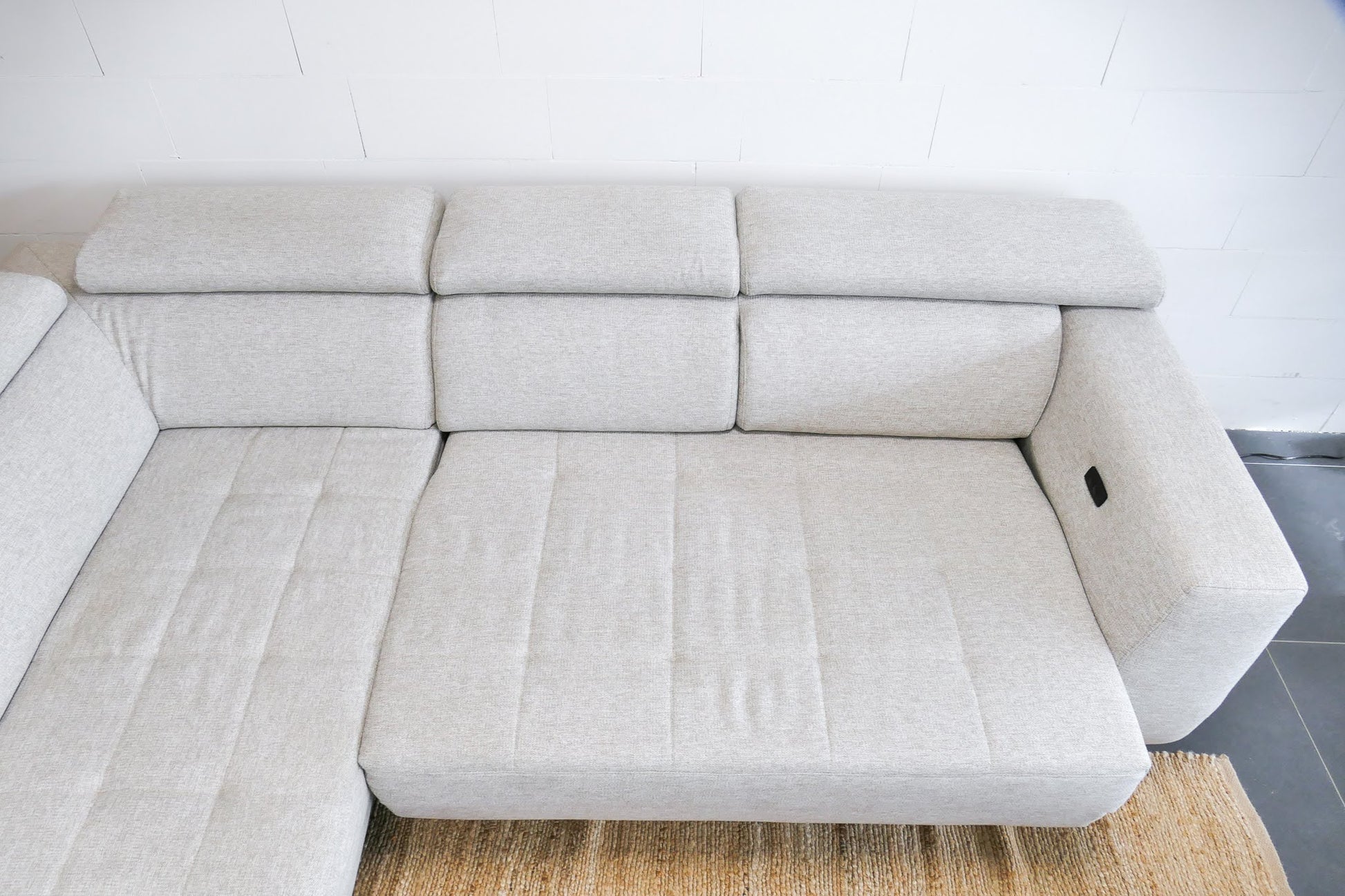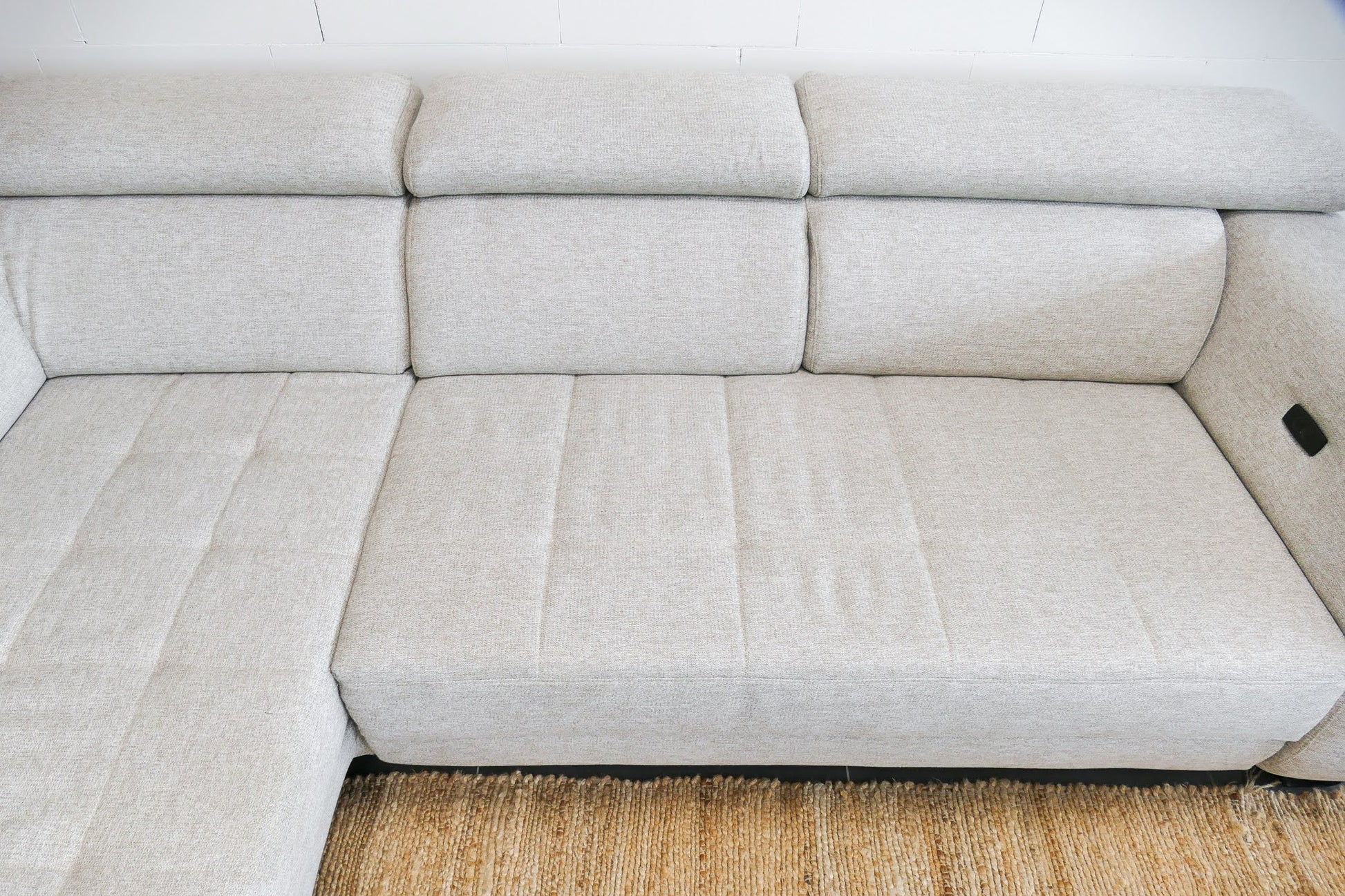 Beige hoekbank met elektrisch verstelbare functies, verstelbare rug- en hoofdsteunen en uitschuifbaar zitgedeelte. De bank verkeert in uitstekende staat en kan tevens gebruikt worden als bedbank.