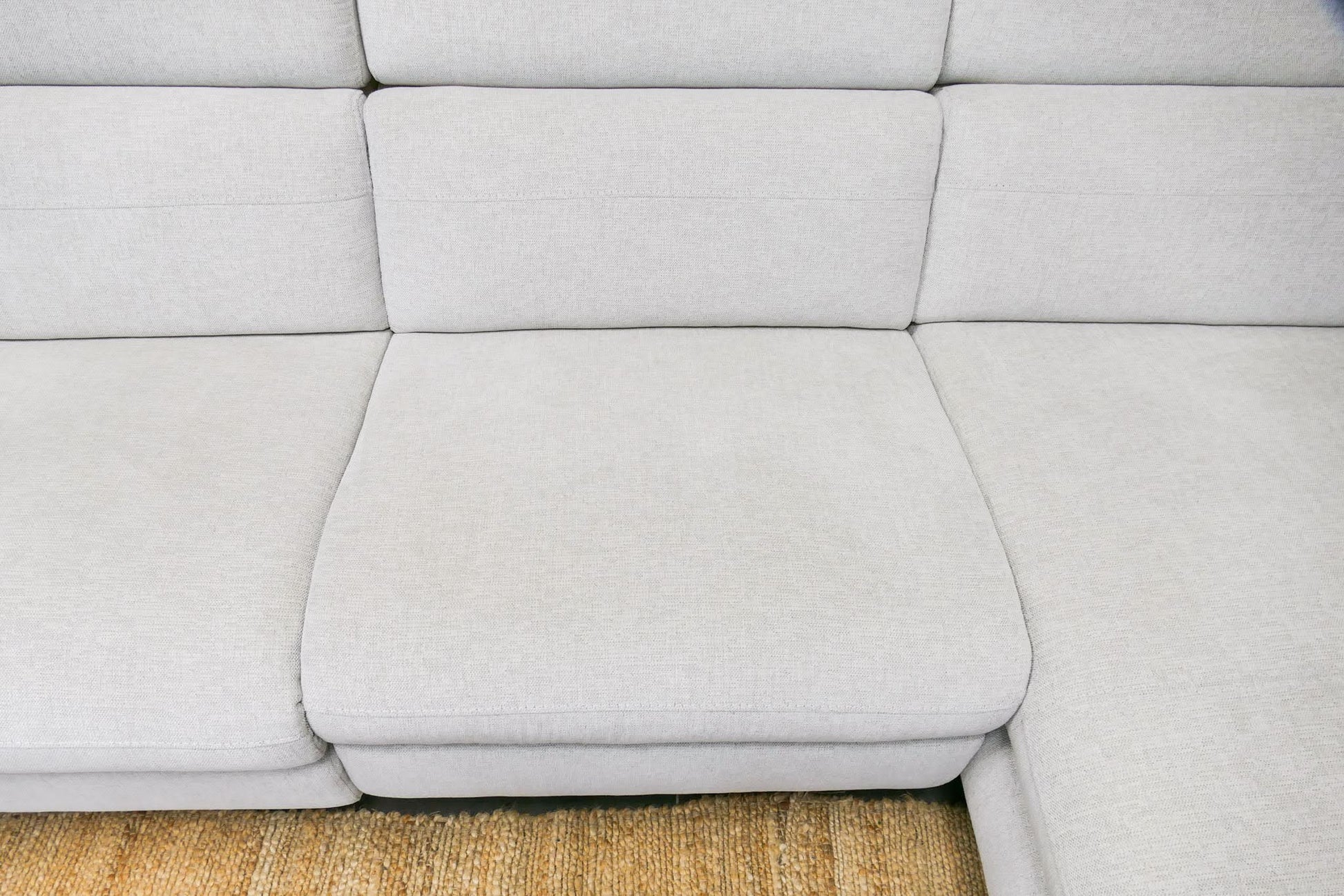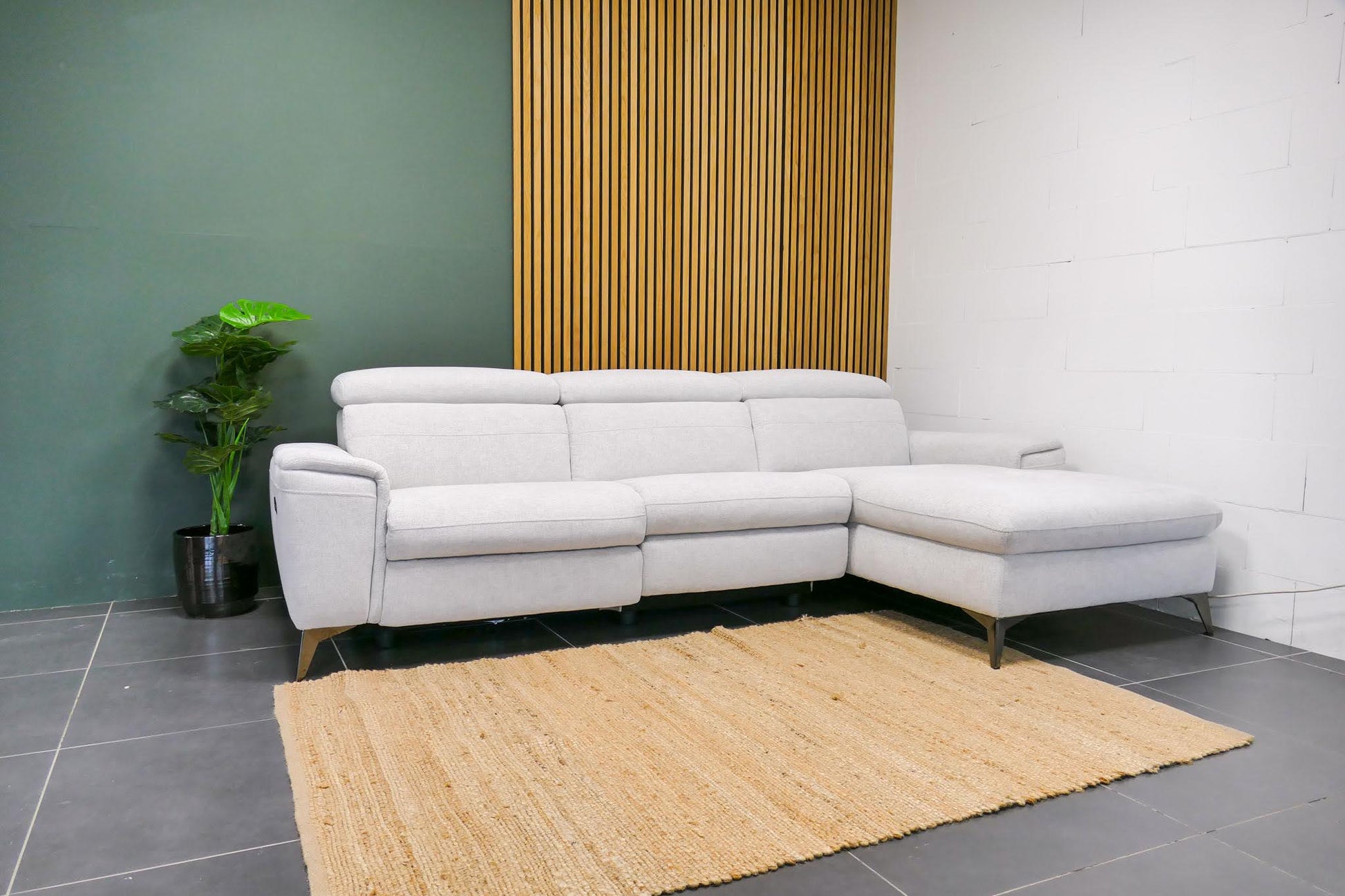 Compacte chaise longue in gebroken wit/beige met verstelbare rug- en hoofdsteunen en elektrisch zitgedeelte. De bank heeft vaste zit- en rugkussens en verkeert in uitstekende staat, zonder noemenswaardige gebruikerssporen.