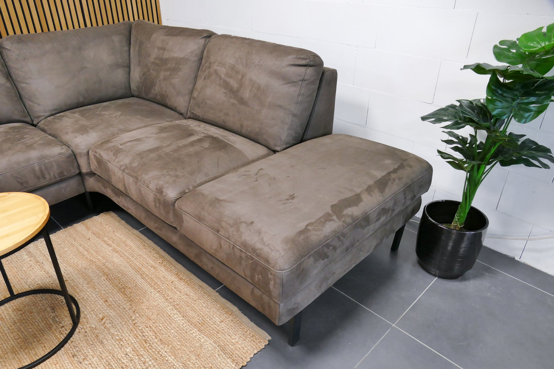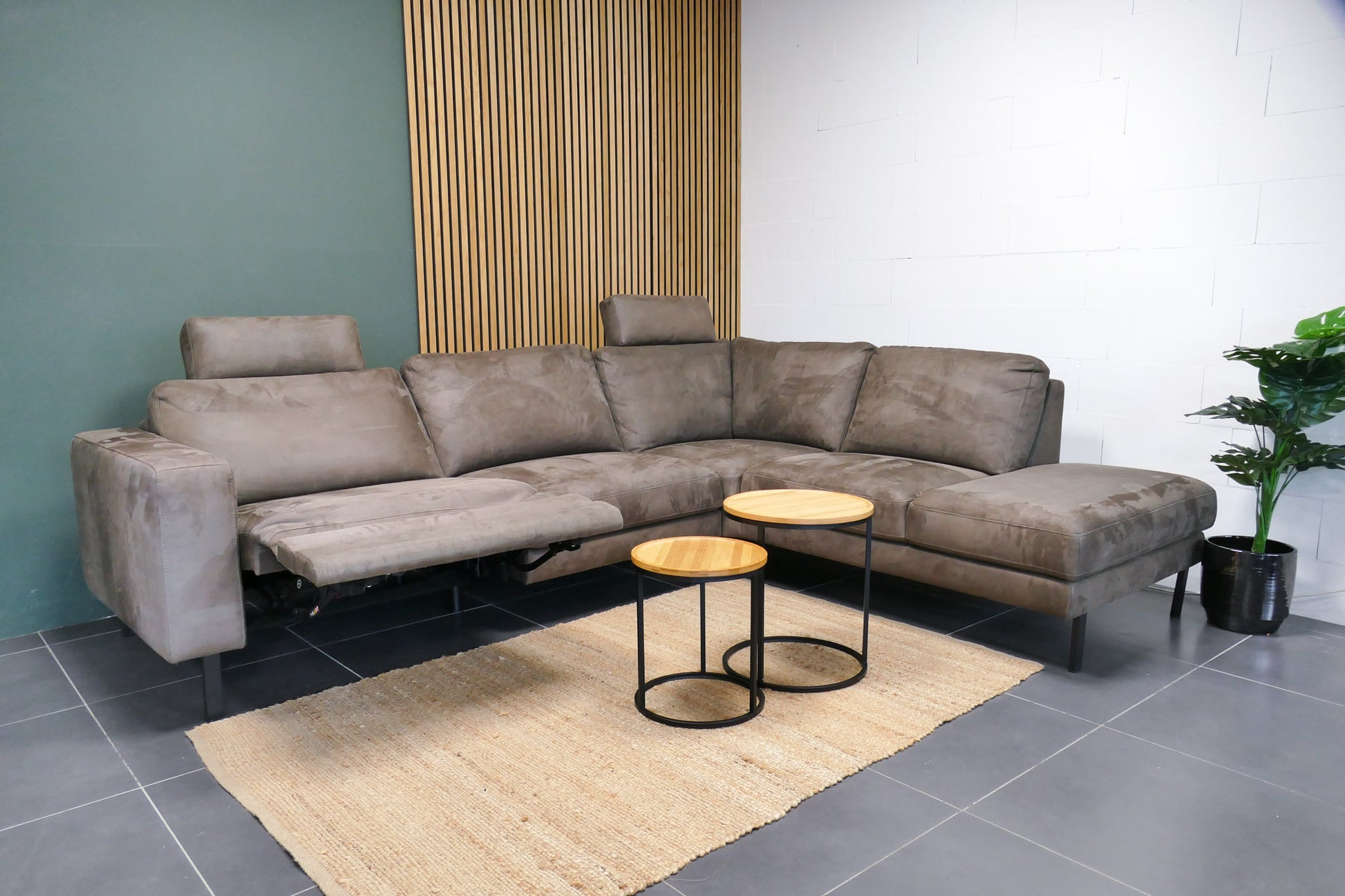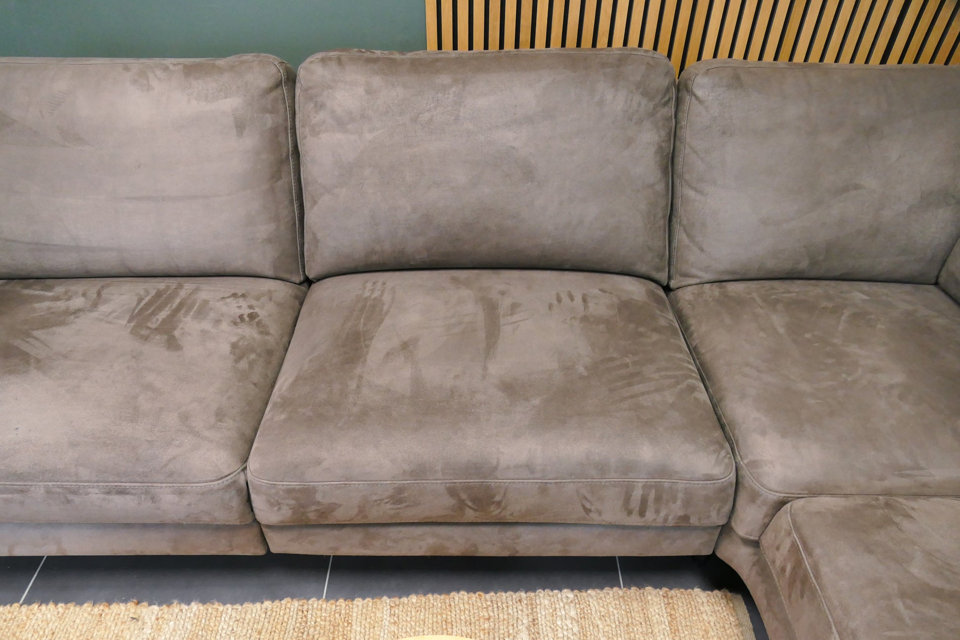 Bruine Feelings Cadiz hoekbank met elektrisch verstelbaar zitgedeelte en vaste rugkussens. De bank is opgevuld voor langdurig ondersteunend zitcomfort en voorzien van zitvlakken van kwalitatief koudschuim. Enkele kleine zwarte puntjes op het elektrisch deel, verder in zeer goede staat.