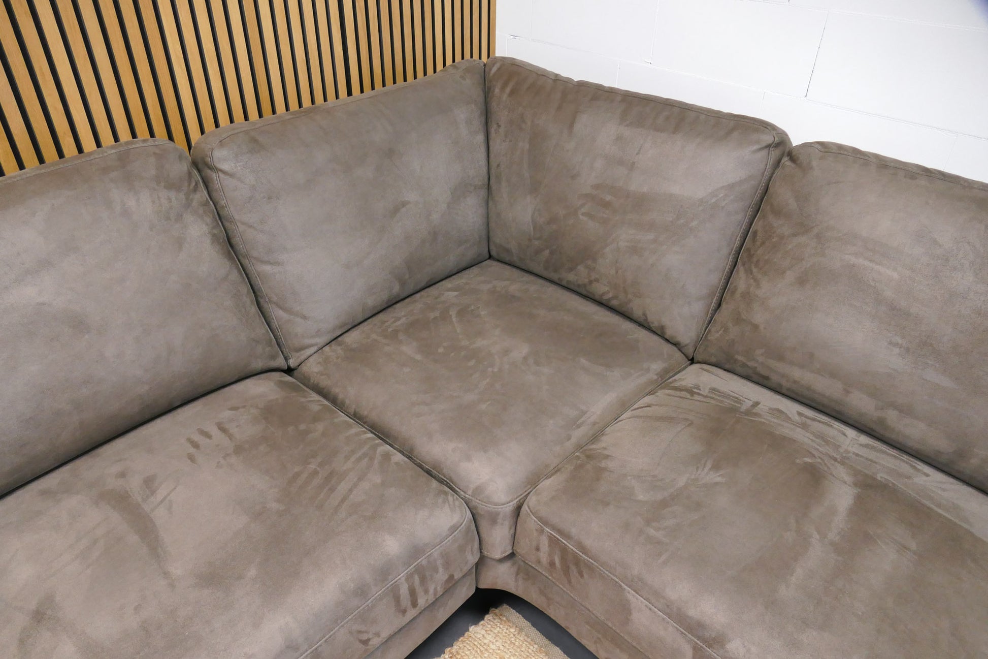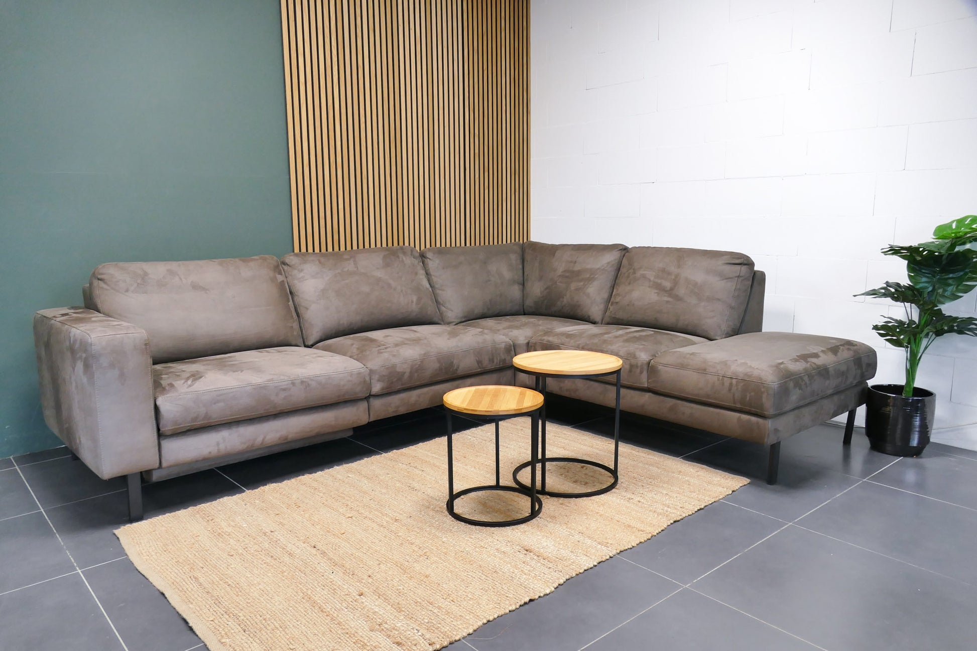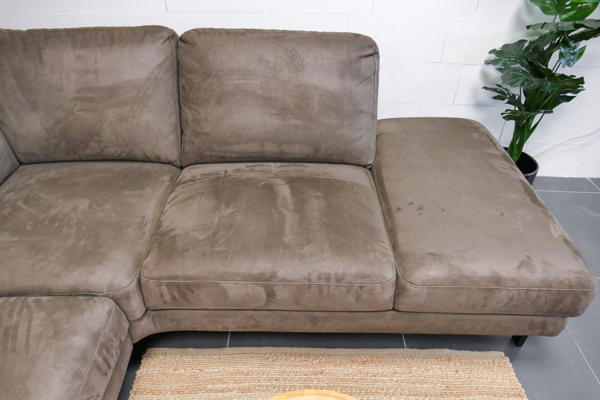 Bruine Feelings Cadiz hoekbank met elektrisch verstelbaar zitgedeelte en vaste rugkussens. De bank is opgevuld voor langdurig ondersteunend zitcomfort en voorzien van zitvlakken van kwalitatief koudschuim. Enkele kleine zwarte puntjes op het elektrisch deel, verder in zeer goede staat.