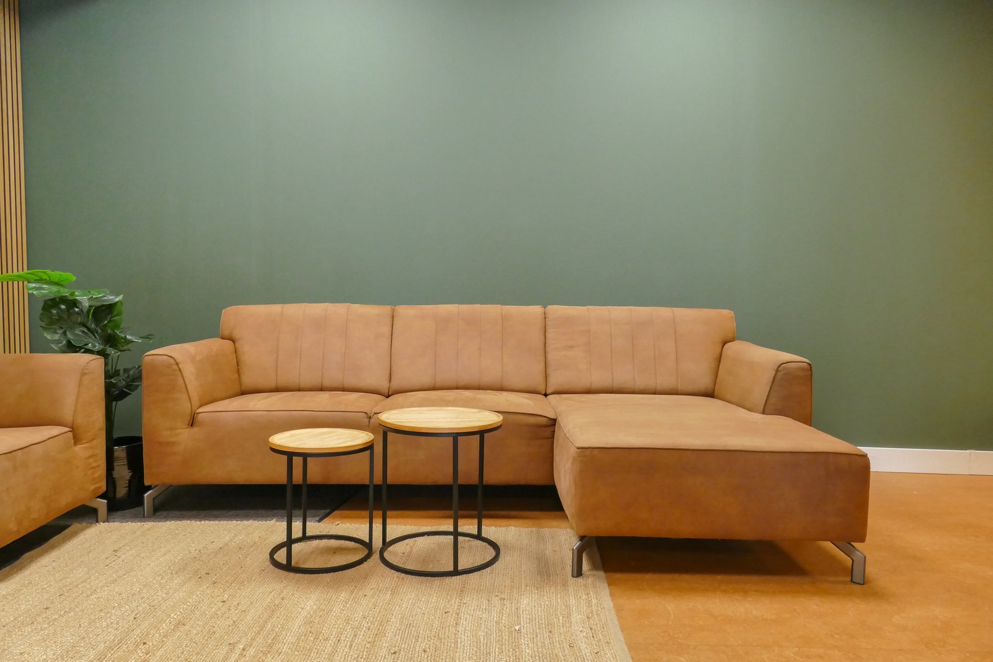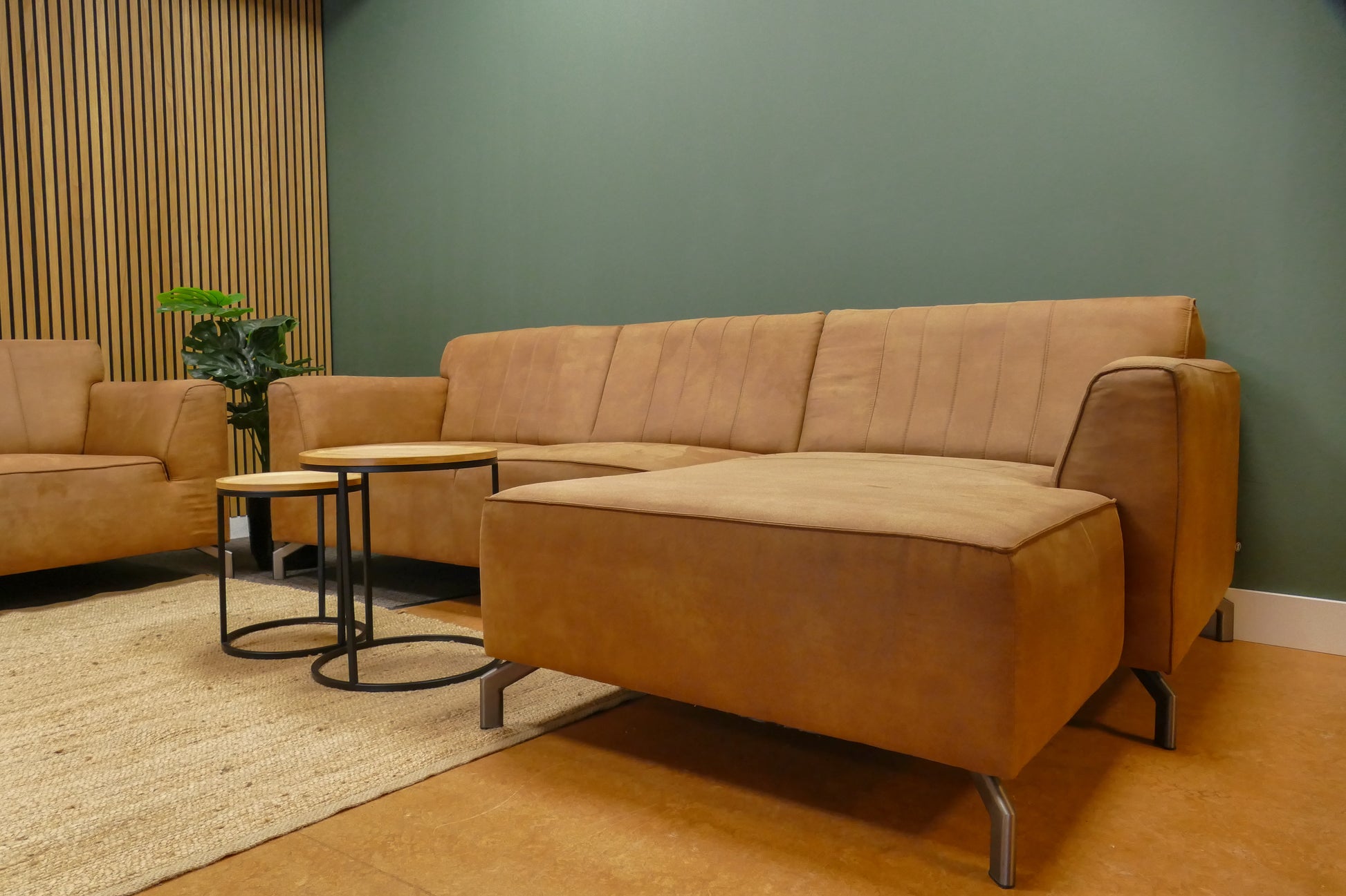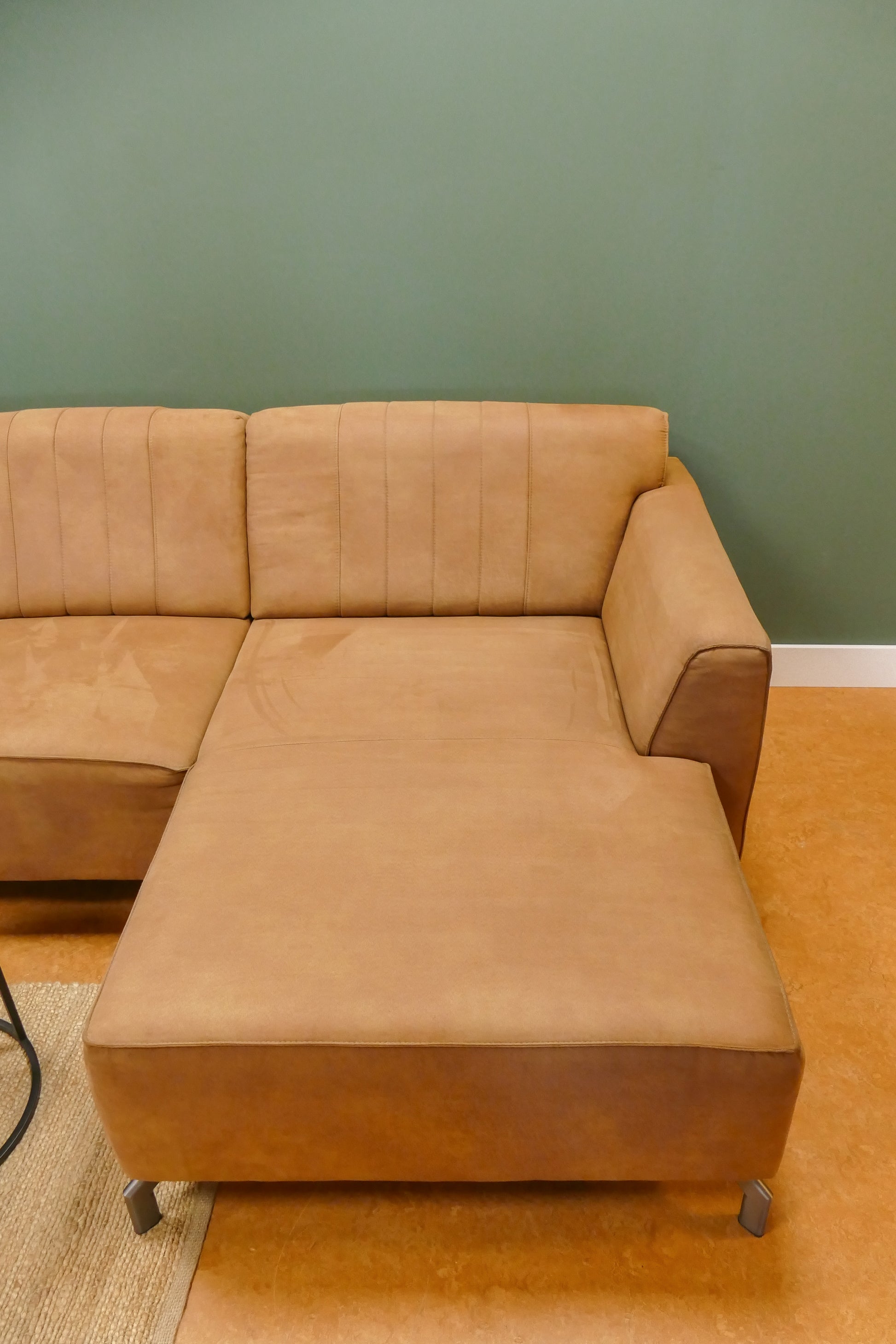 Henders en Hazel 2,5 zits + chaise longue in cognackleurige microvezel met vaste rugkussens. Comfortabele zit met een moderne, industriële uitstraling. Opgevuld voor langdurig zitcomfort.