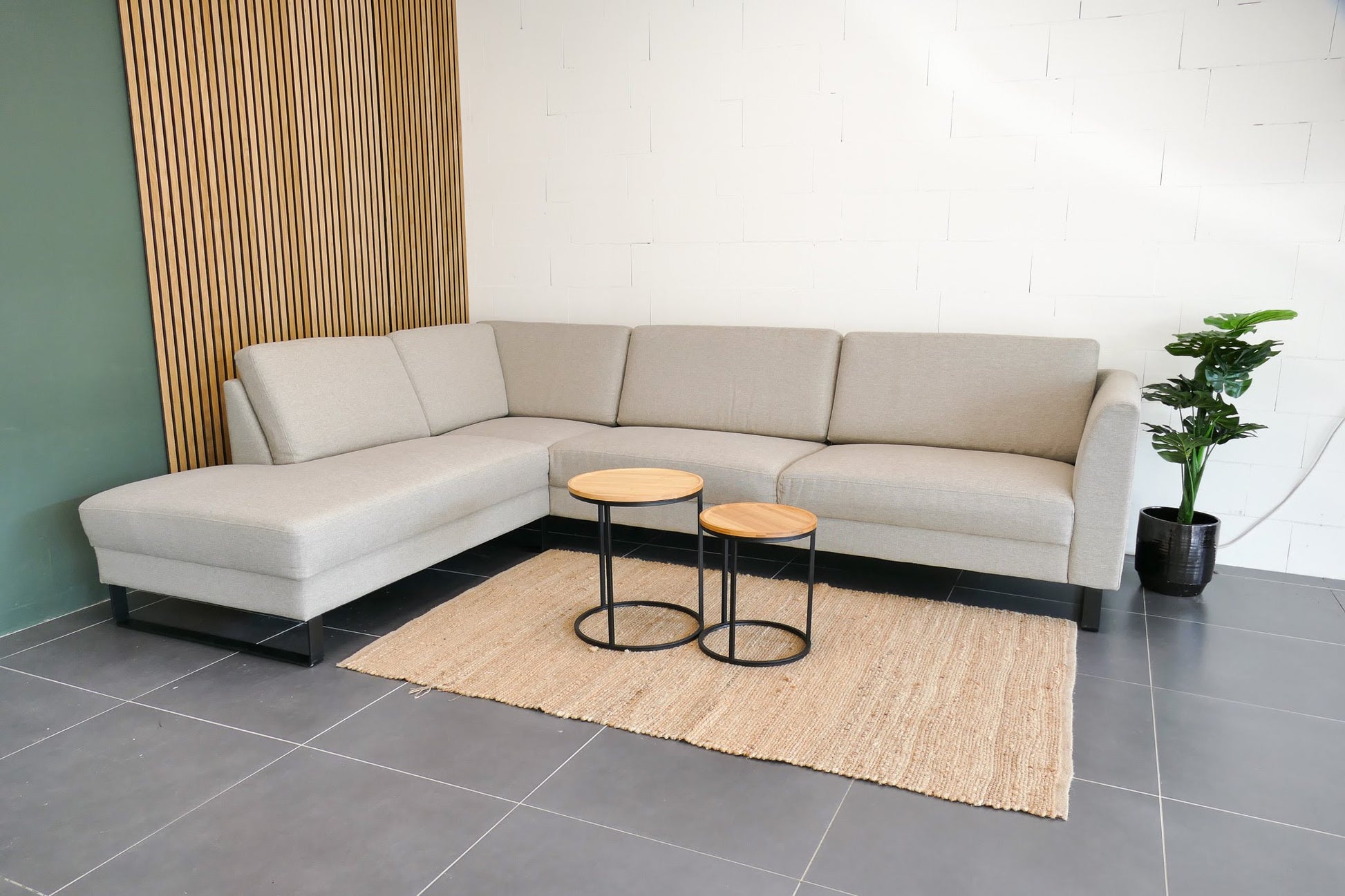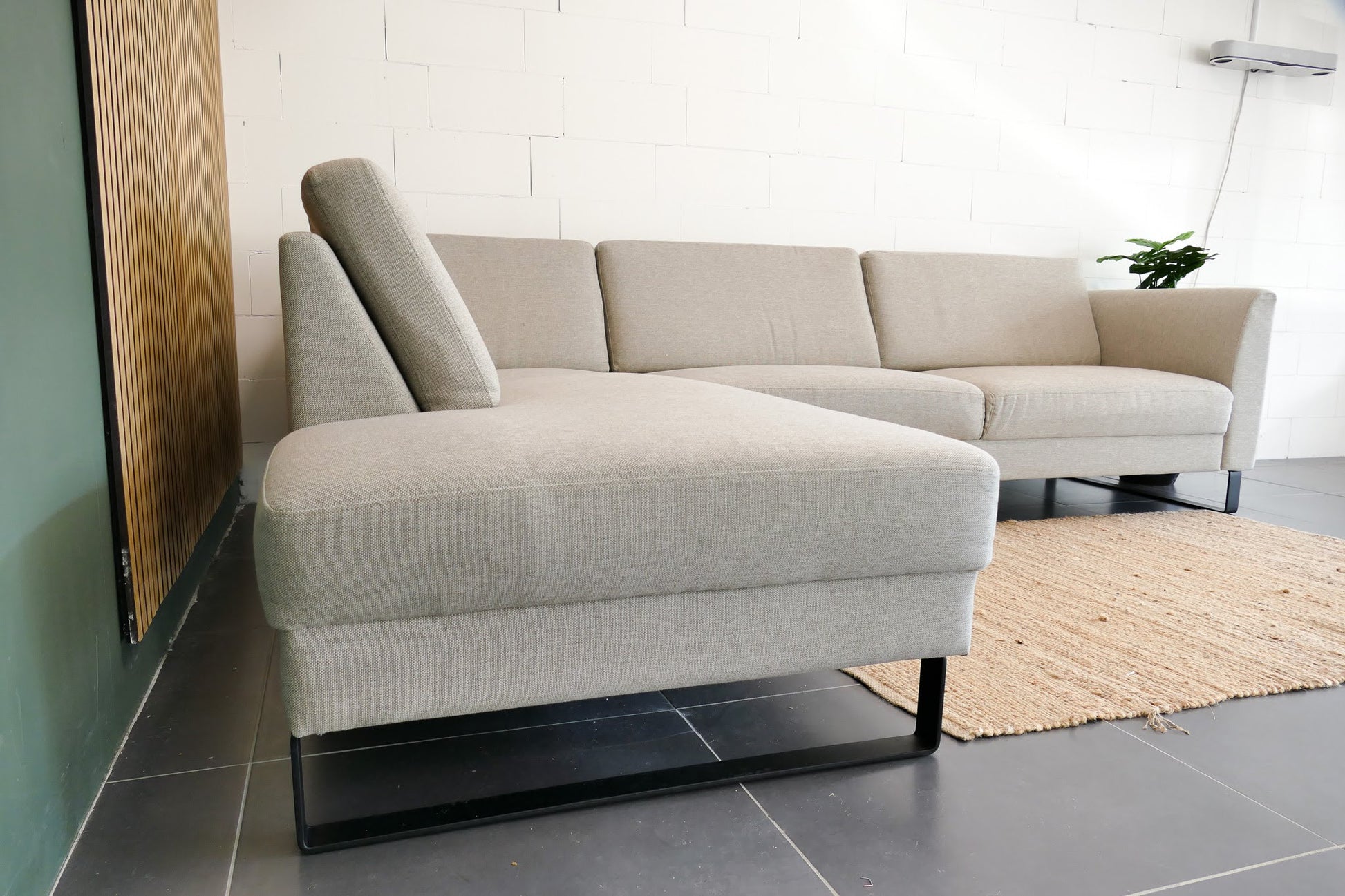 Stijlvolle beige hoekbank met industriële en natuurlijke uitstraling. Uitgevoerd met afneembare rugkussens en een comfortabele zit. De bank verkeert in uitstekende staat en is nauwelijks van nieuw te onderscheiden.