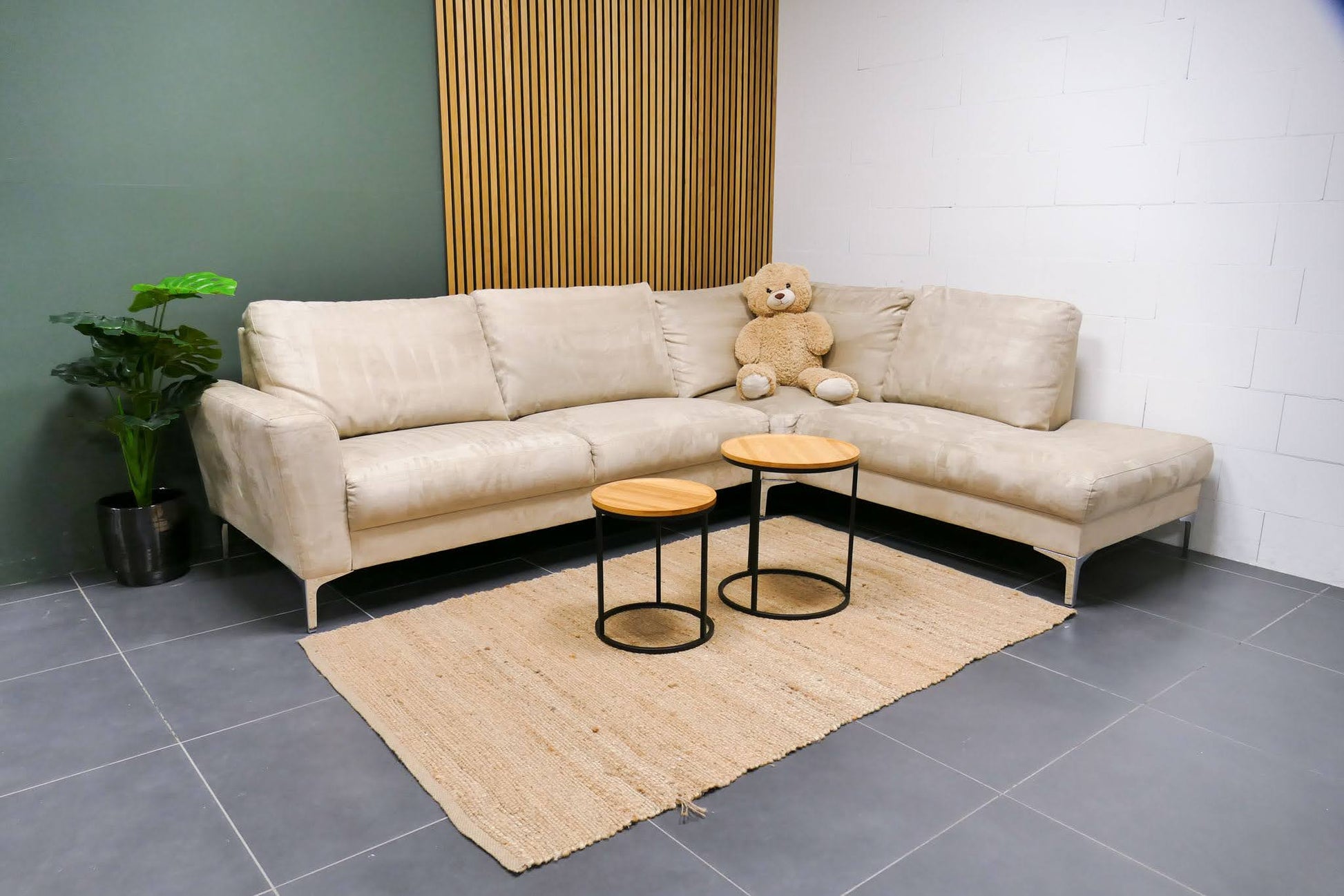 Moderne hoekbank in beige microvezel met rustige Japandi uitstraling en vaste zitkussens. Comfortabele zit en praktische stof voor dagelijks gebruik. Opgevuld voor langdurig zitcomfort.