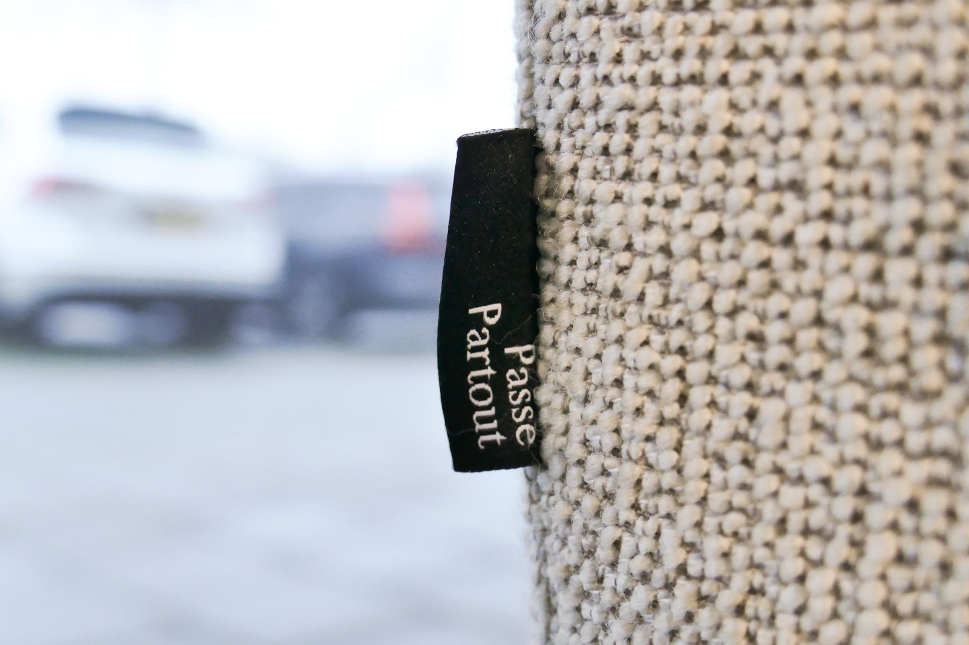 Beige Passe Partout hoekbank in bouclé/teddy stof met afneembare rugkussens die zijn bevestigd met ritsen. De bank is extra opgevuld voor langdurig zitcomfort en verkeert in uitstekende staat.