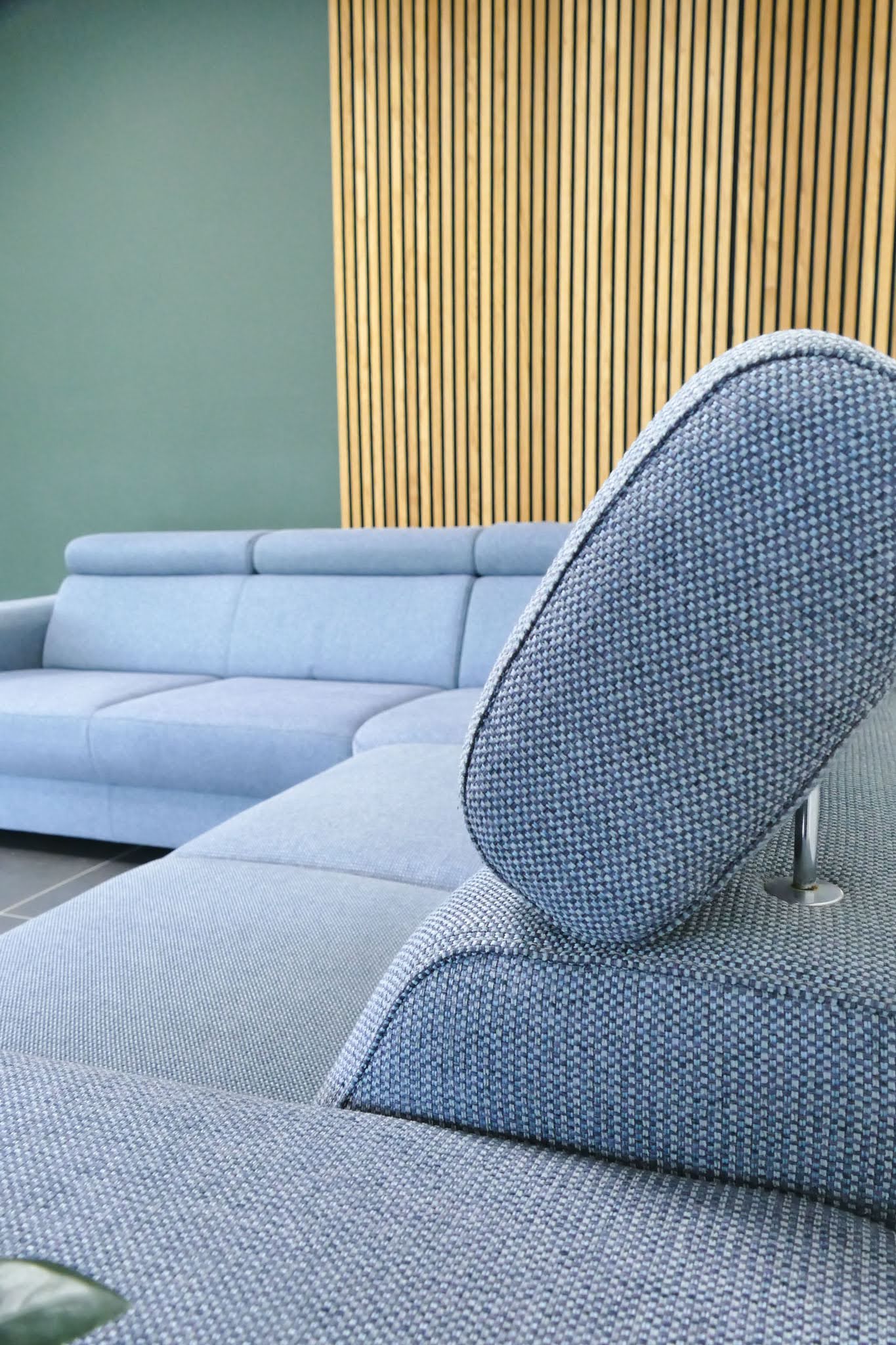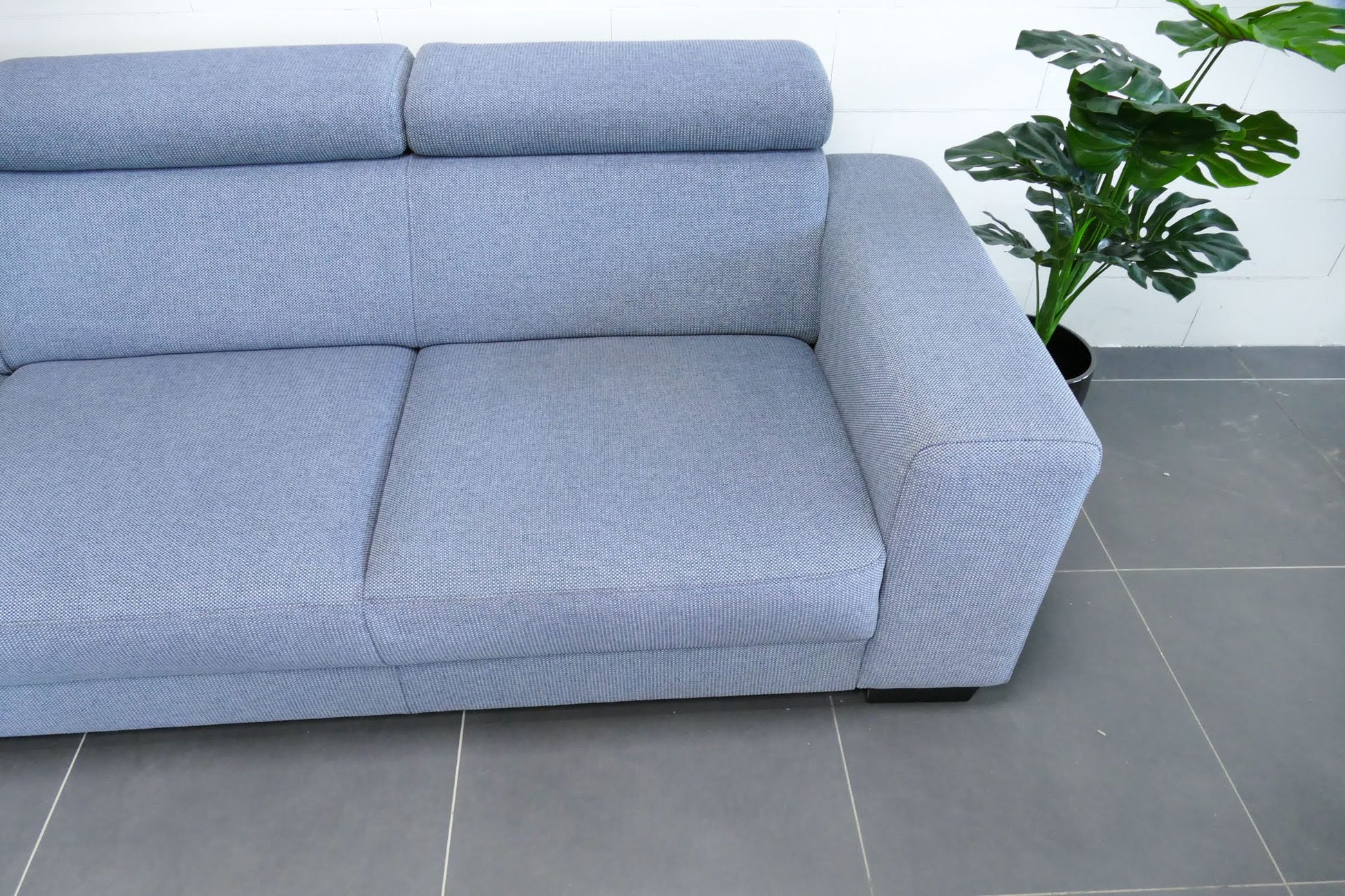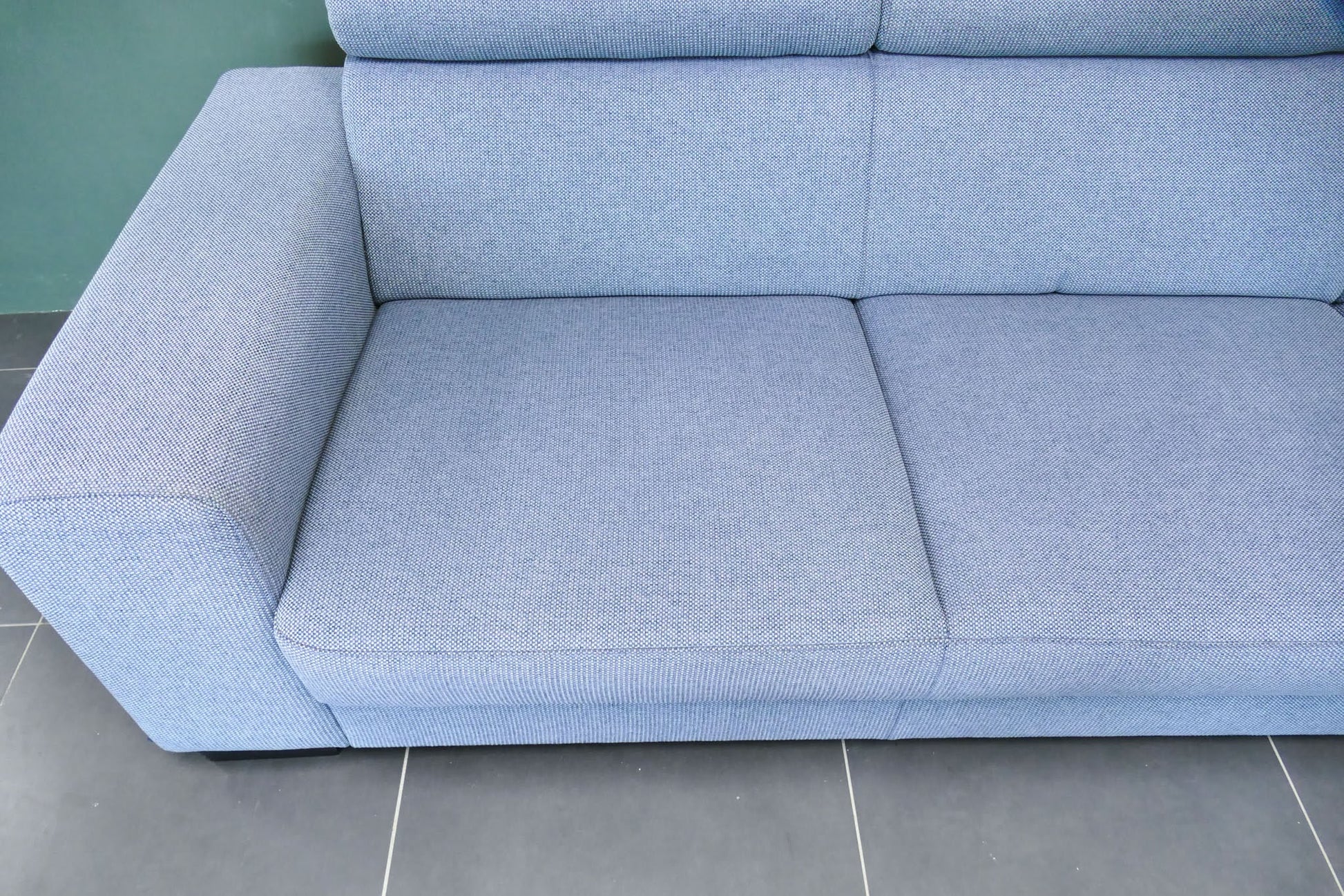 Grijsblauwe hoekbank van De Bommel met verstelbare rug- en hoofdsteunen voor extra comfort. De bank verkeert in zeer goede staat.