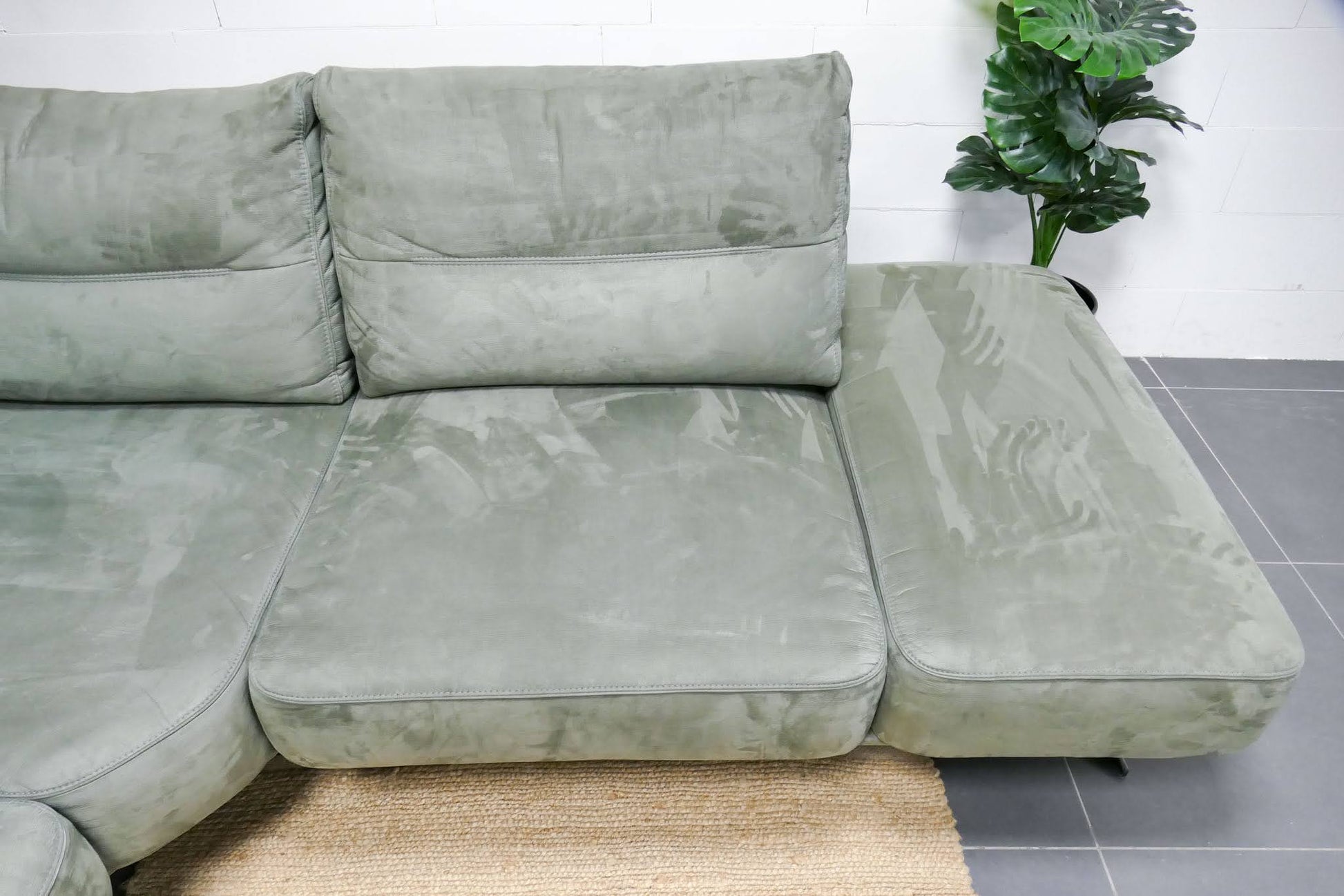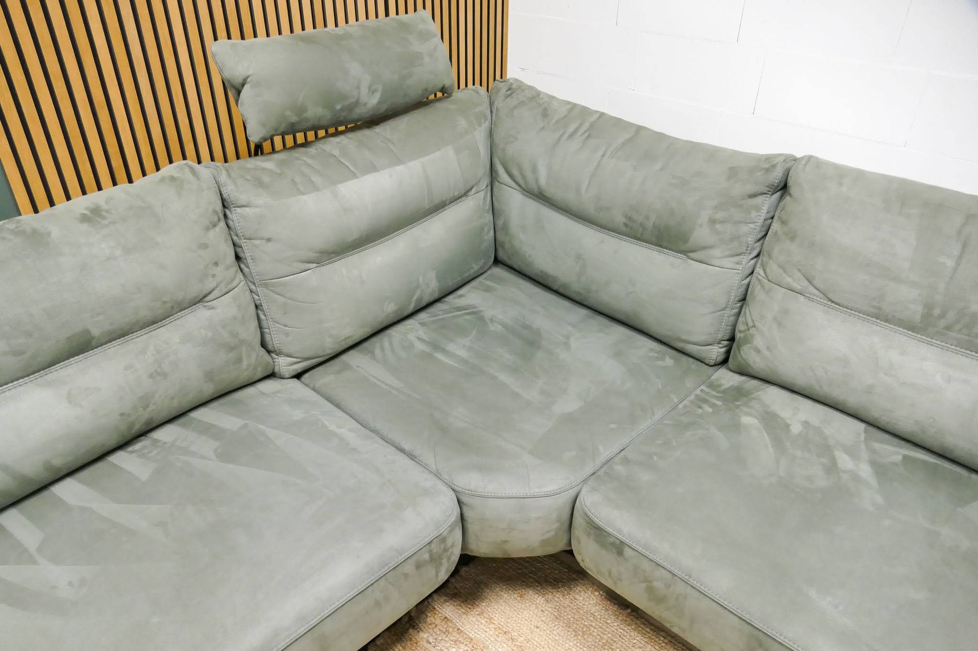 Royale groene hoekbank van Henders Hazel in microvezel, met afneembare hoofdsteunen en vaste zitkussens. Uitgevoerd met unieke poten en handige ritsbevestiging voor de rugkussens.