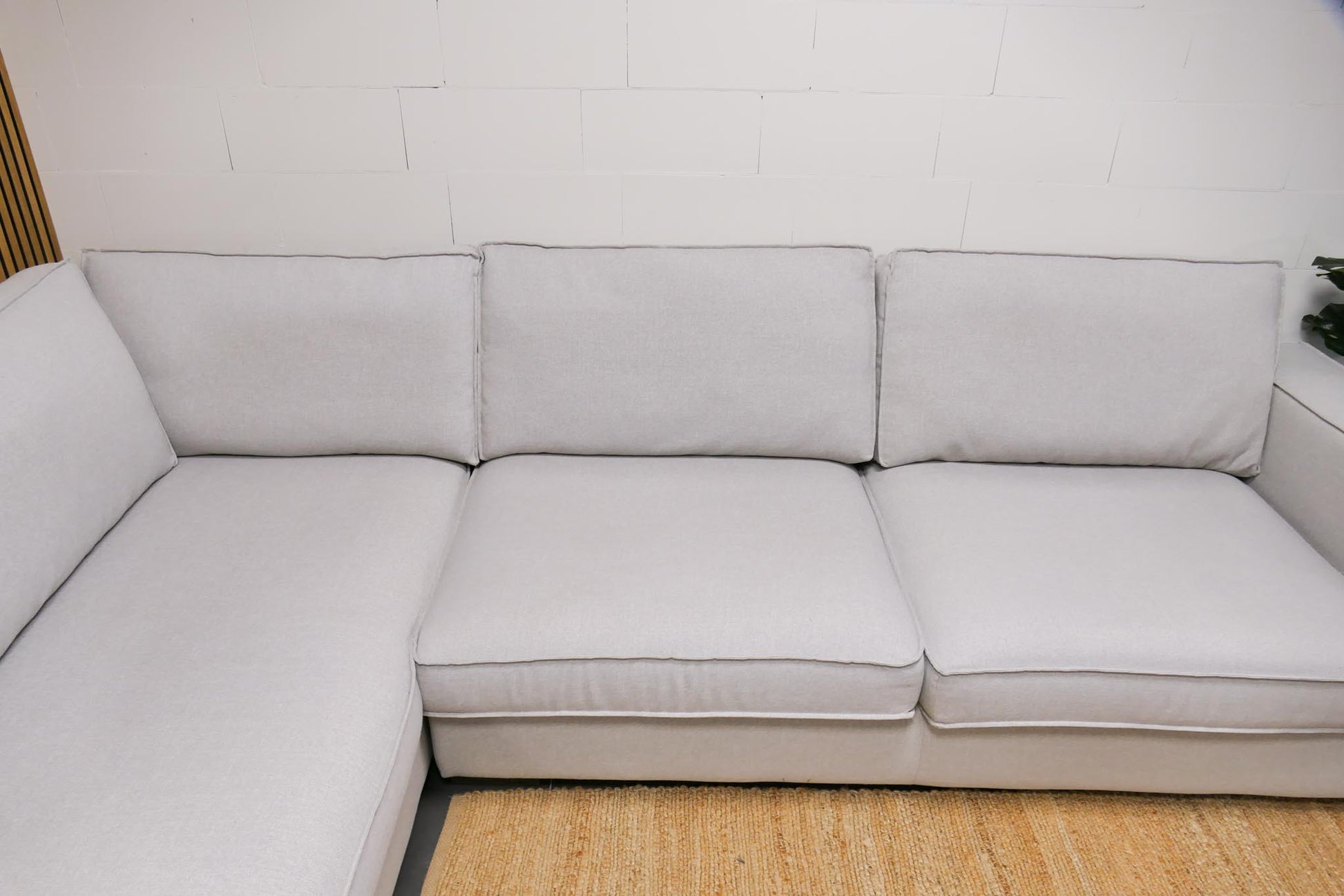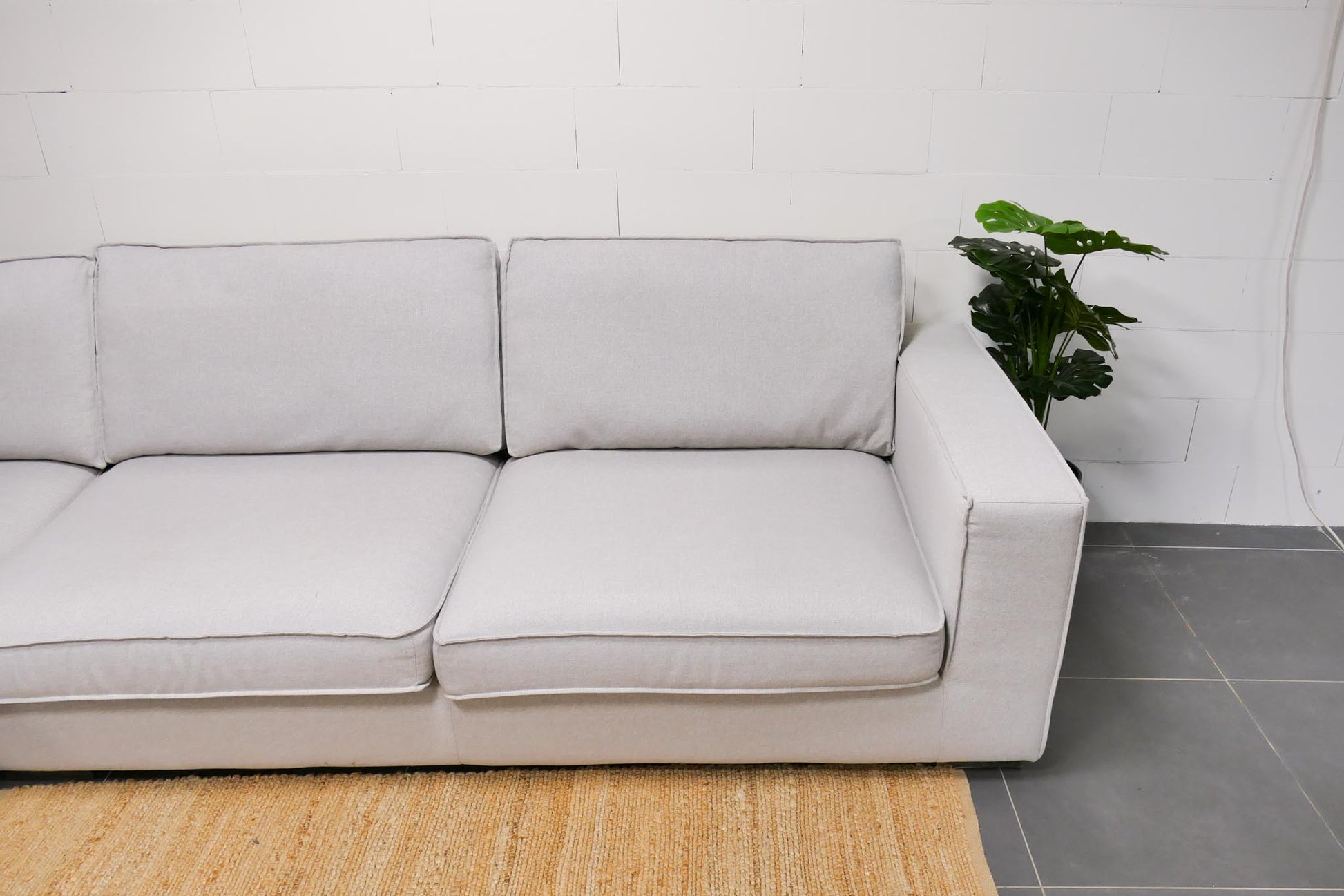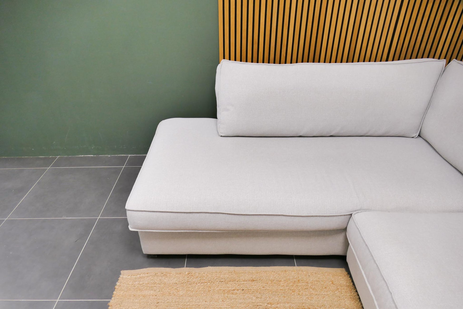 Lichtgrijze lounge hoekbank met afneembare rugkussens en een comfortabele, diepe zit. De bank verkeert in zeer goede staat met lichte verkleuring aan de linkerkant.