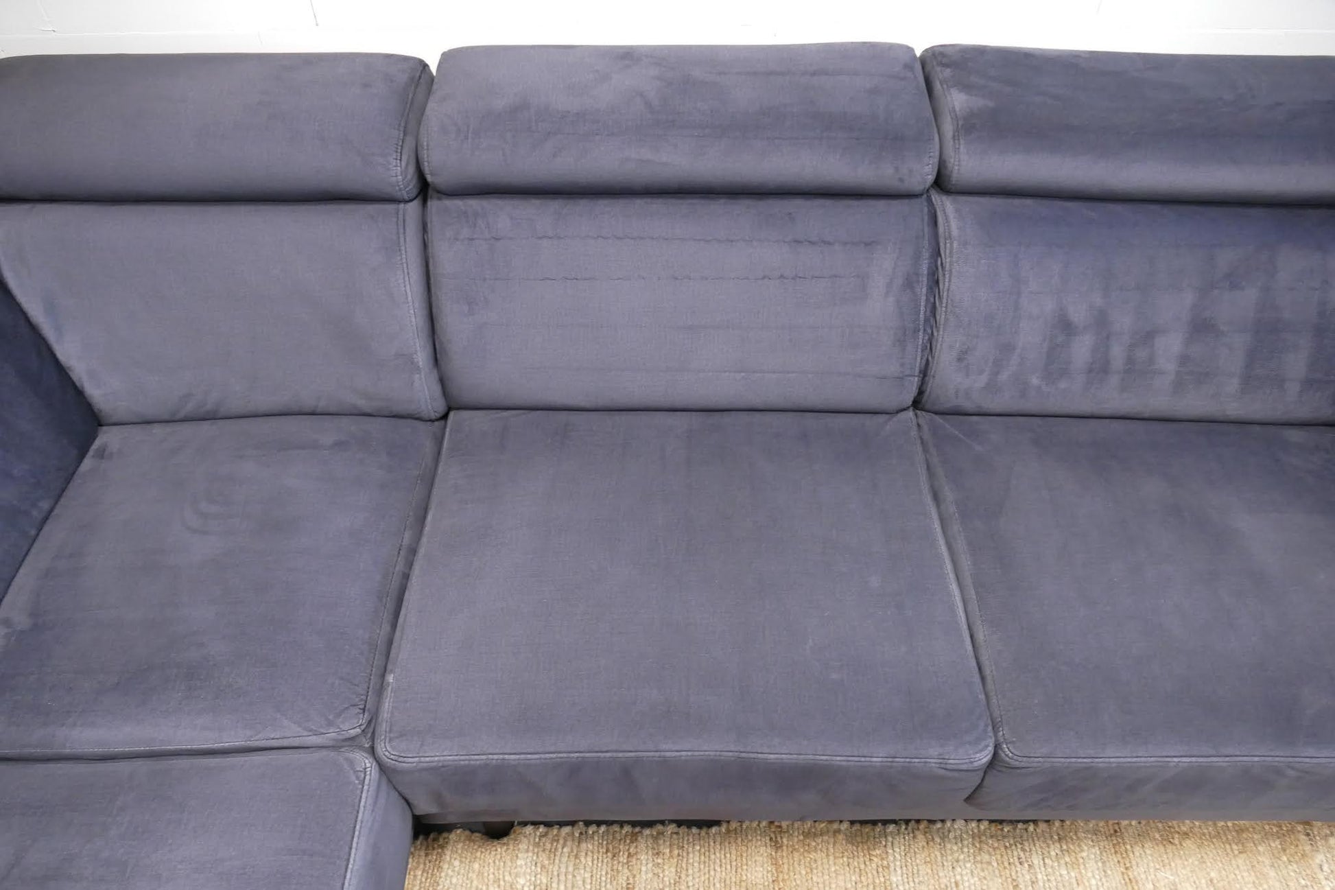 Prachtige hoekbank met een moderne uitstraling en stevige bouw. De bank is uitgerust met verstelbare rug- en hoofdsteunen en vaste rugkussens. De stof verkeert in zeer goede staat, alleen de achterkant van de hoofdsteunen is iets verkleurd.