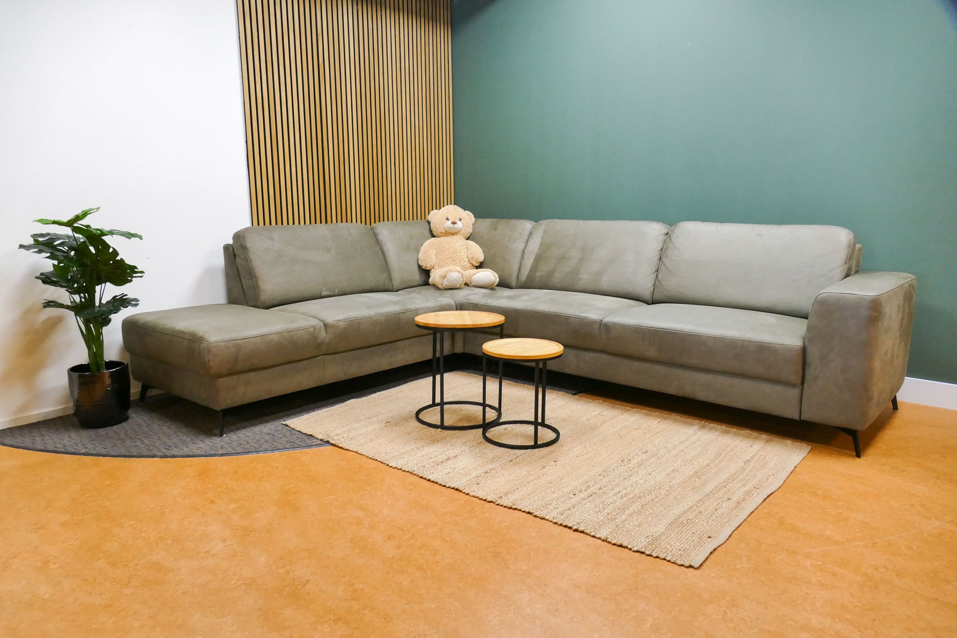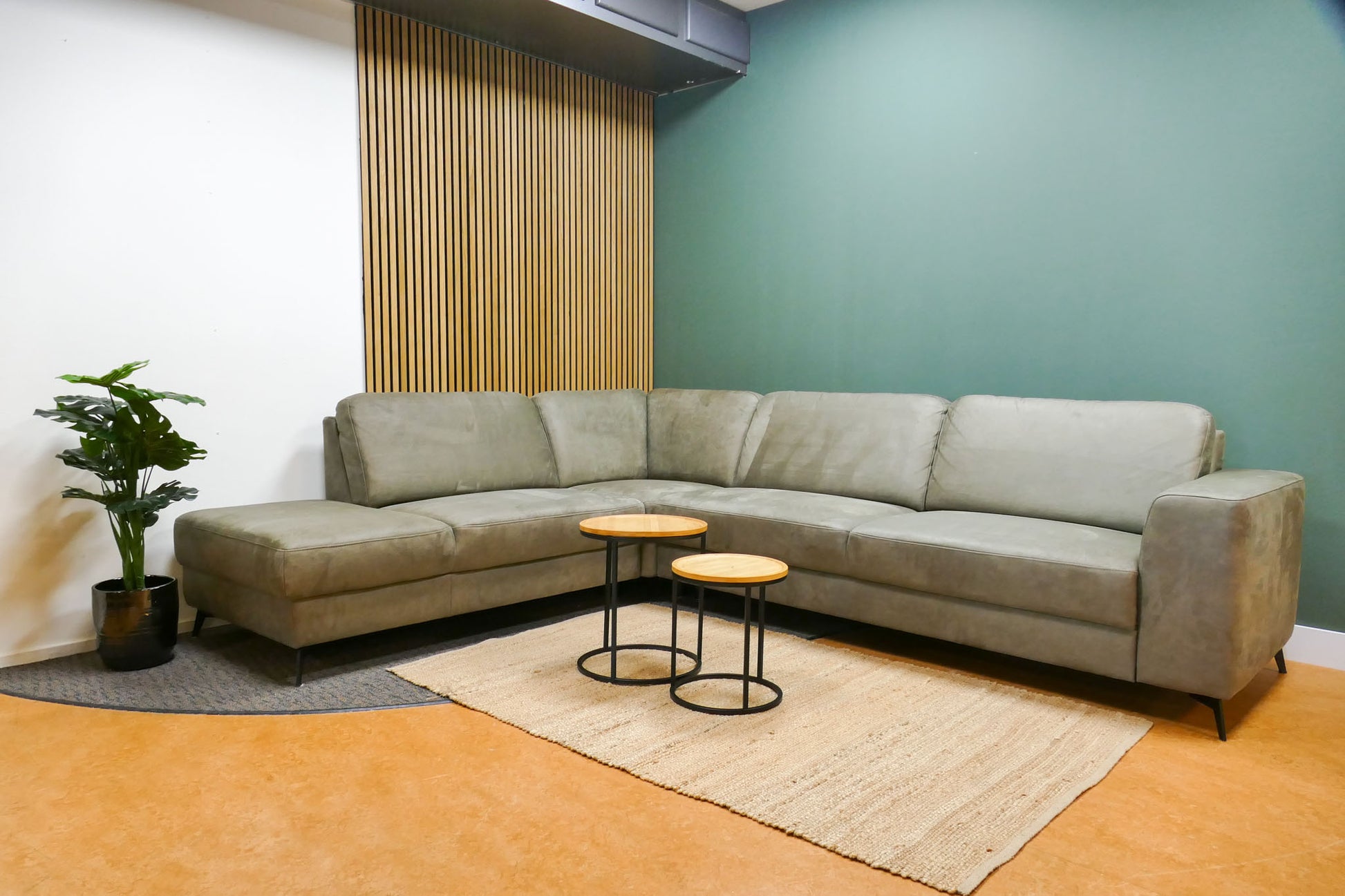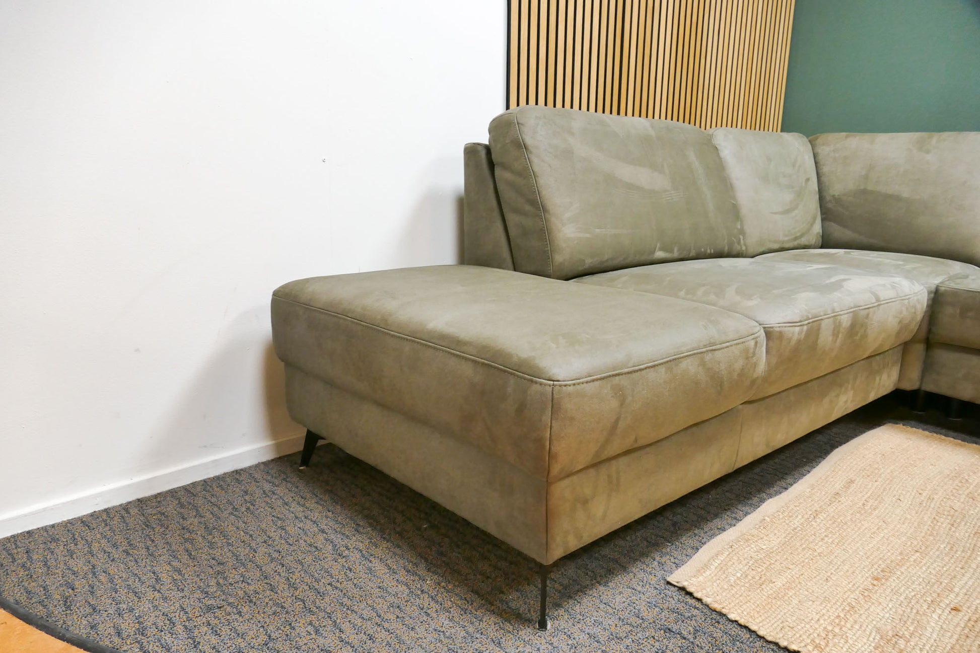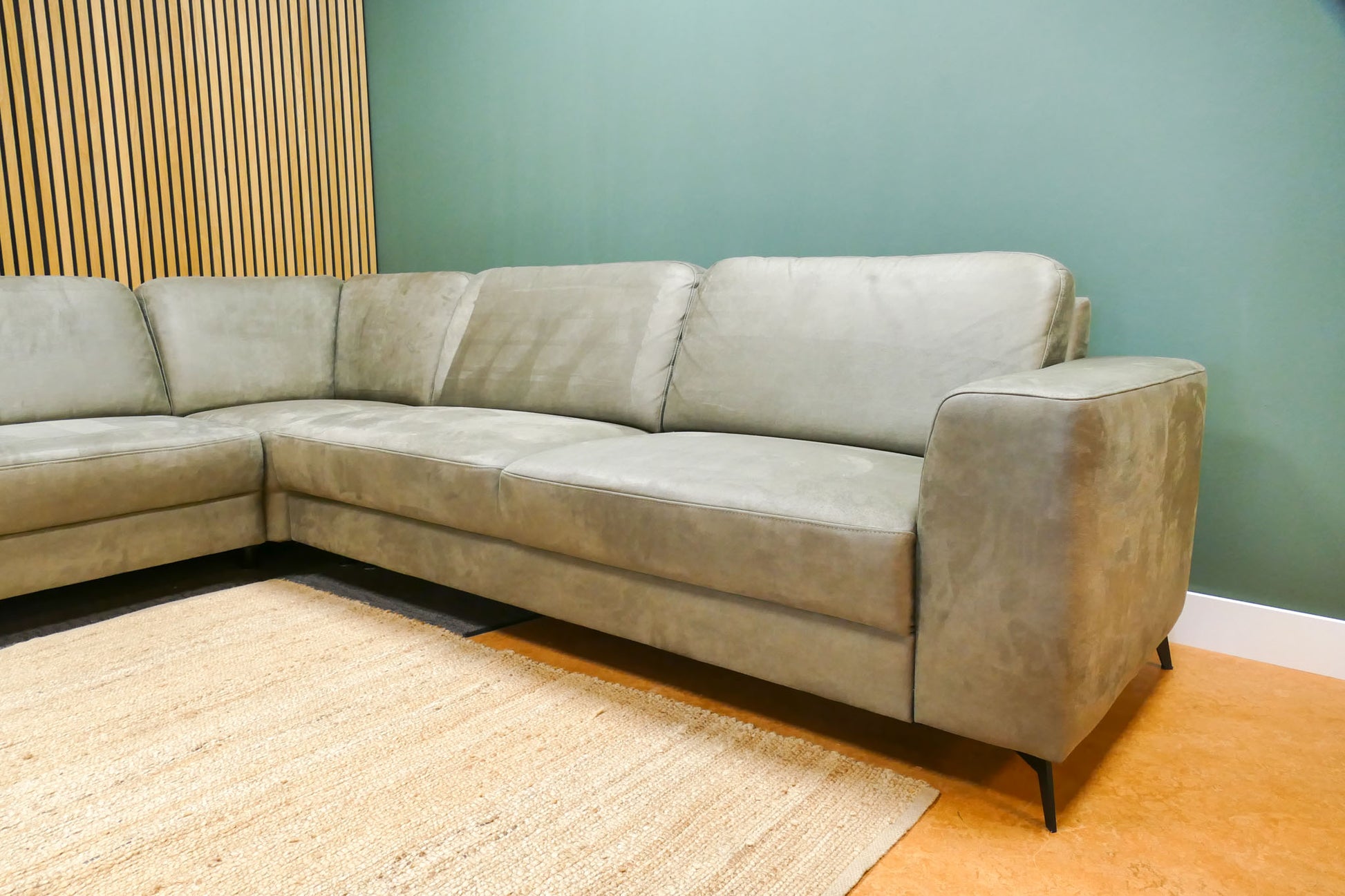 Hoekbank in donker olijfgroene microvezel met vaste zit- en rugkussens en een comfortabele zit. Warme uitstraling met praktische en sterke stof. Opgevuld voor langdurig zitcomfort.