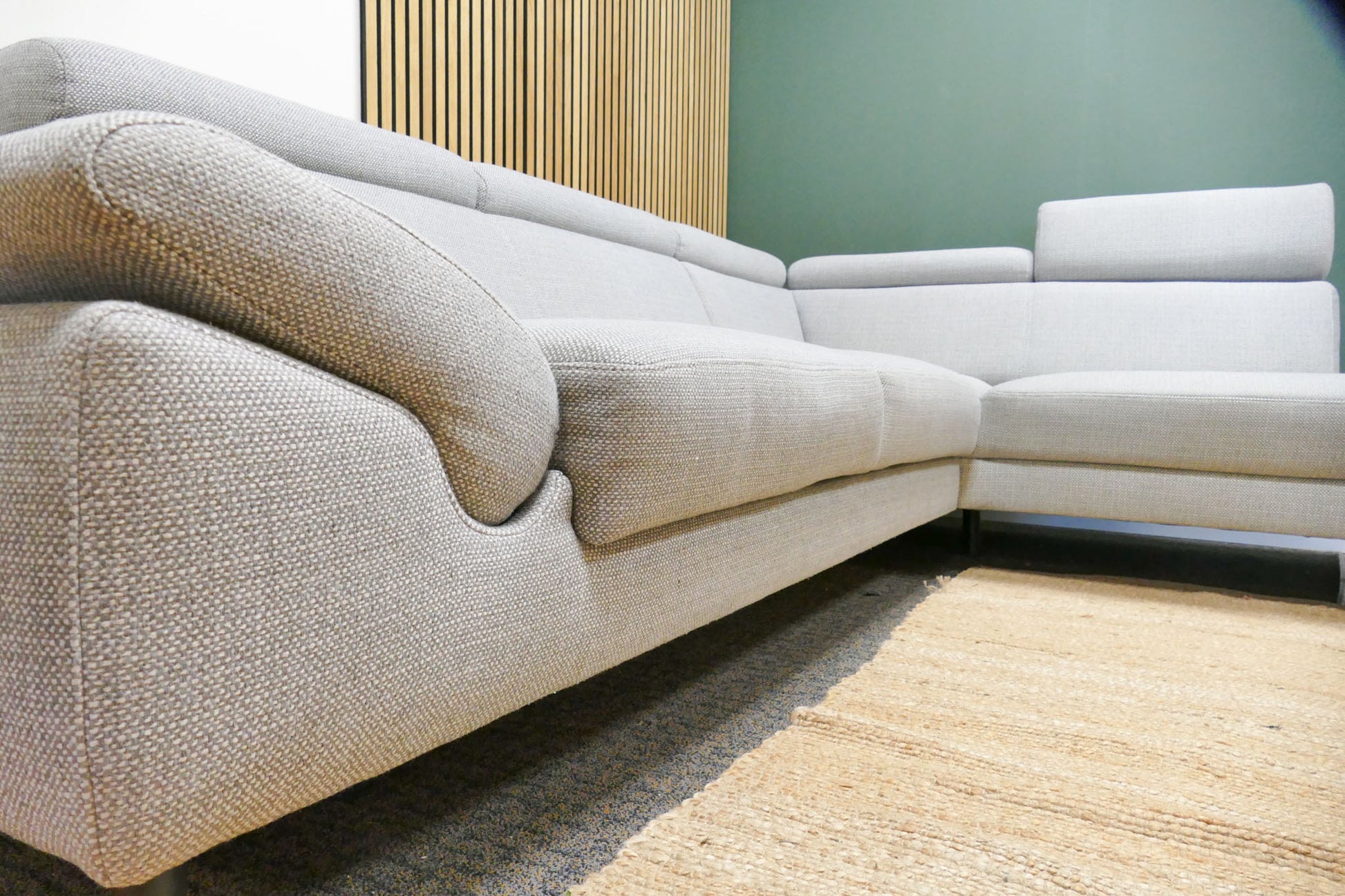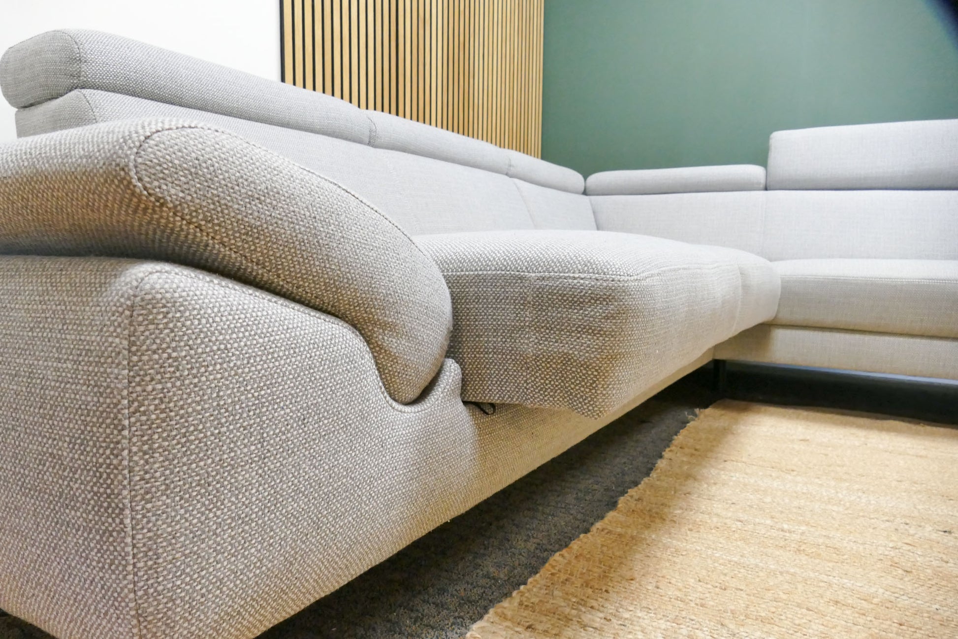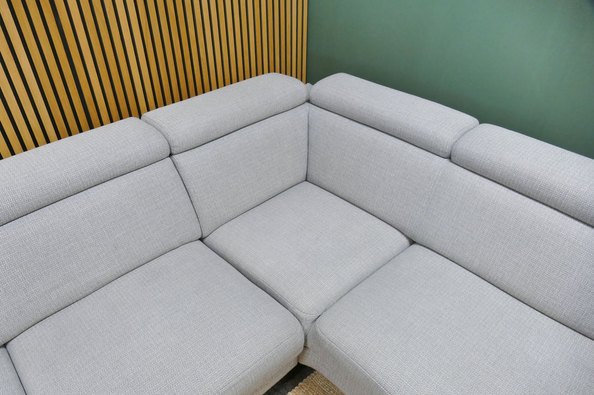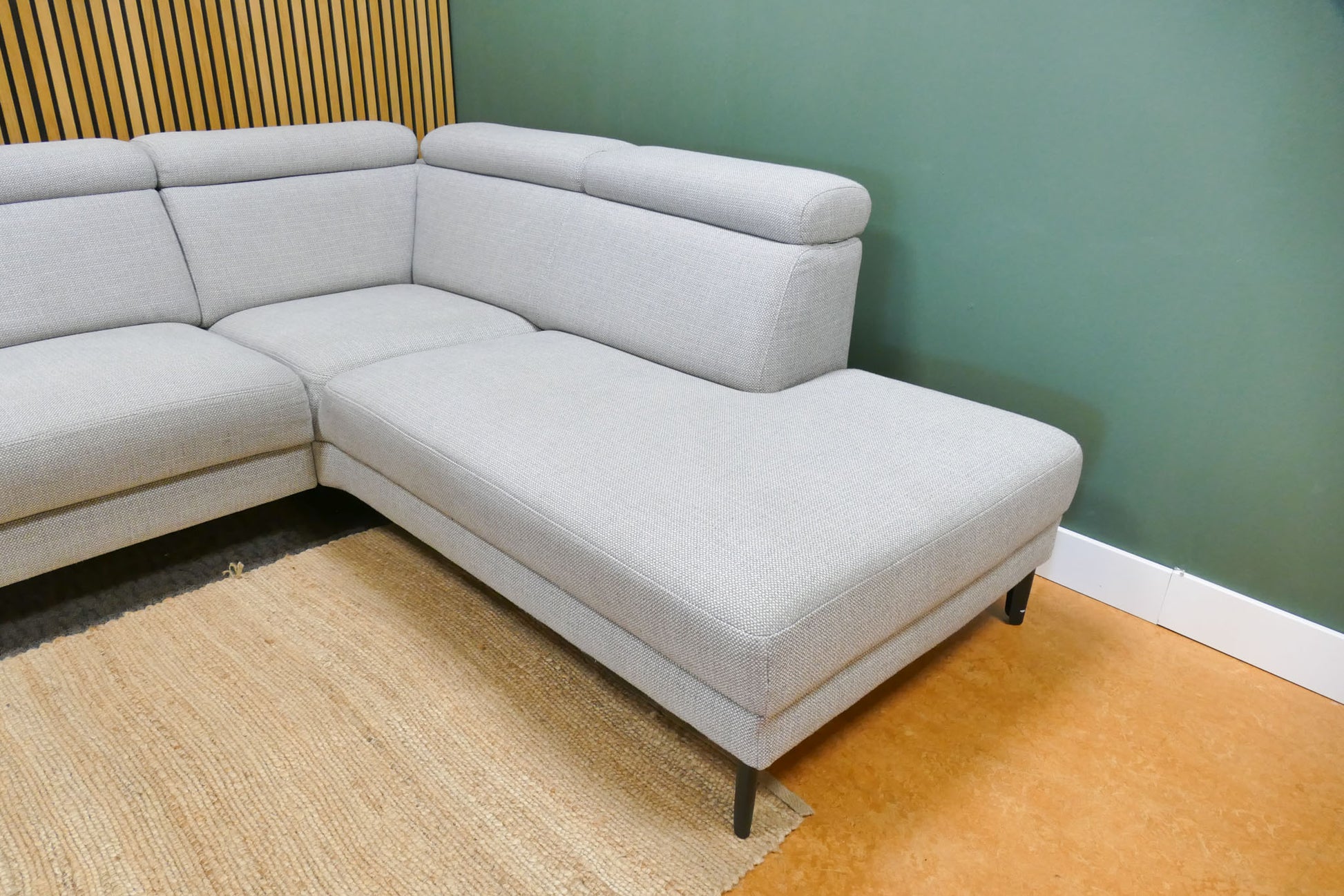 Montel Modena hoekbank in lichtgrijze gemêleerde stof met vaste rugkussens en verstelbare elementen. Comfortabele zit met een industriële en moderne uitstraling. Opgevuld voor langdurig zitcomfort.