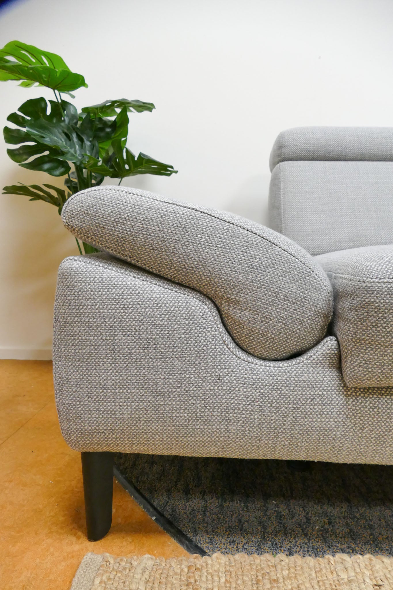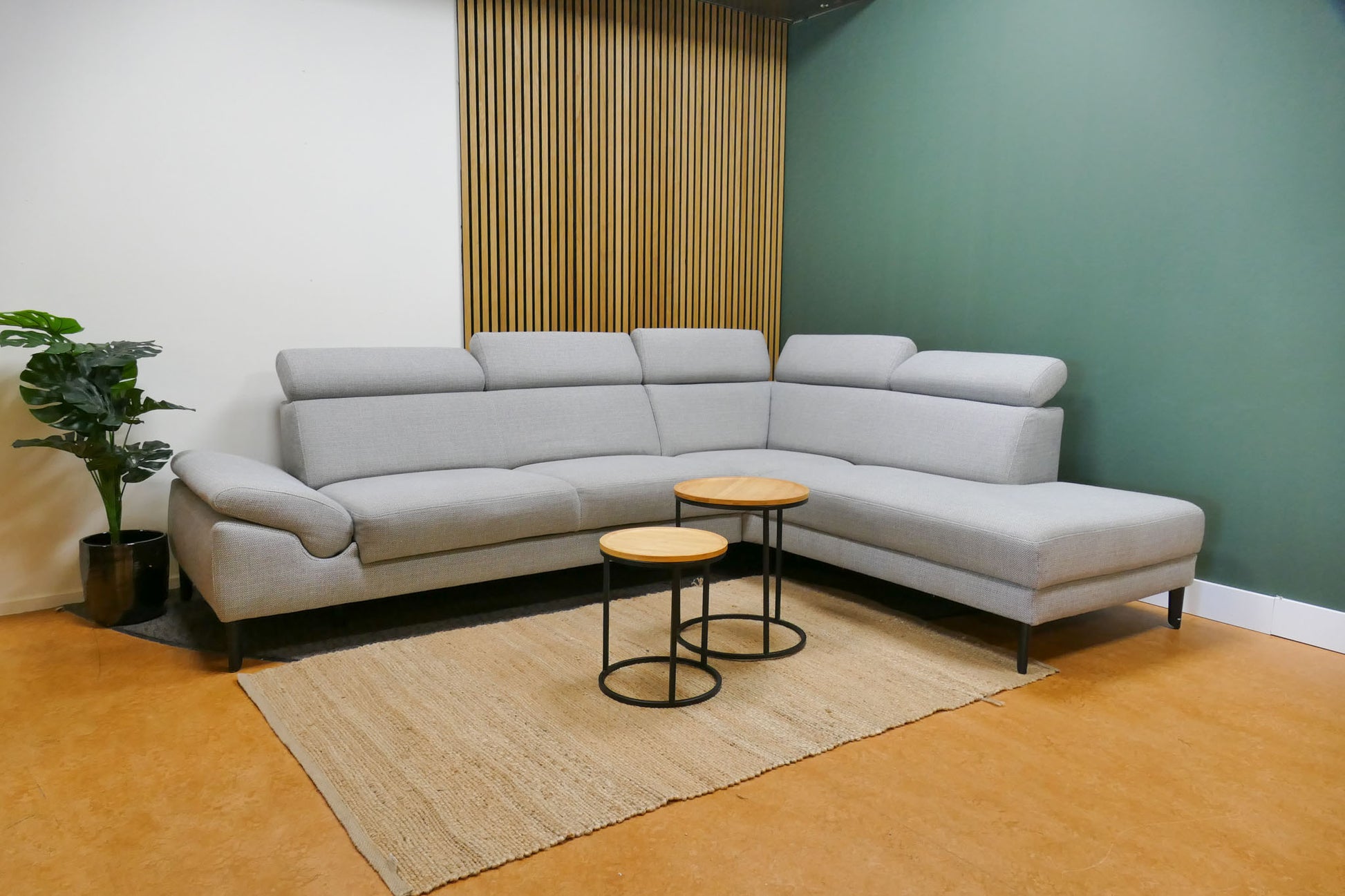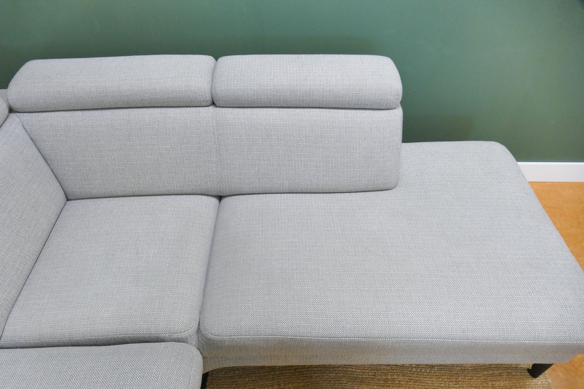 Montel Modena hoekbank in lichtgrijze gemêleerde stof met vaste rugkussens en verstelbare elementen. Comfortabele zit met een industriële en moderne uitstraling. Opgevuld voor langdurig zitcomfort.