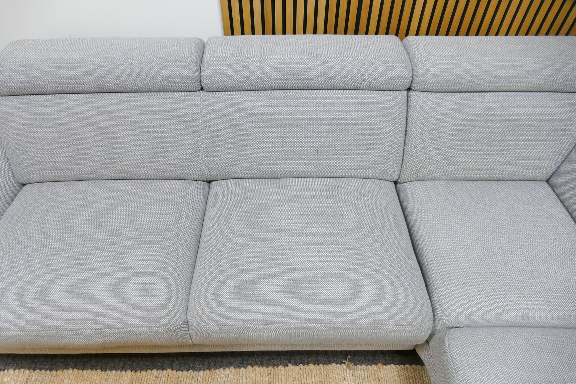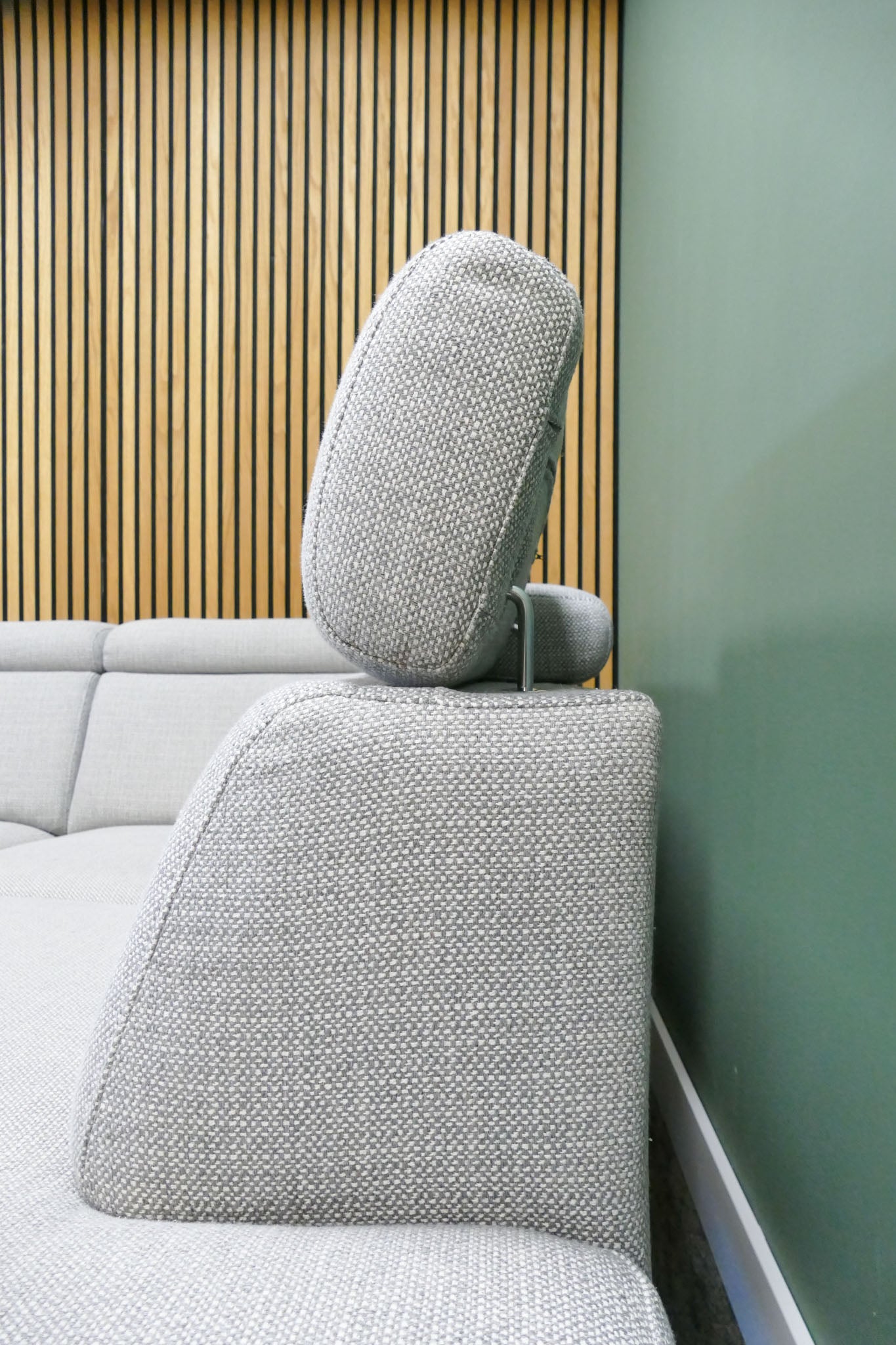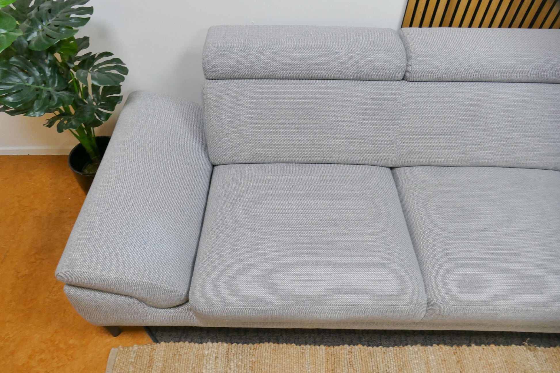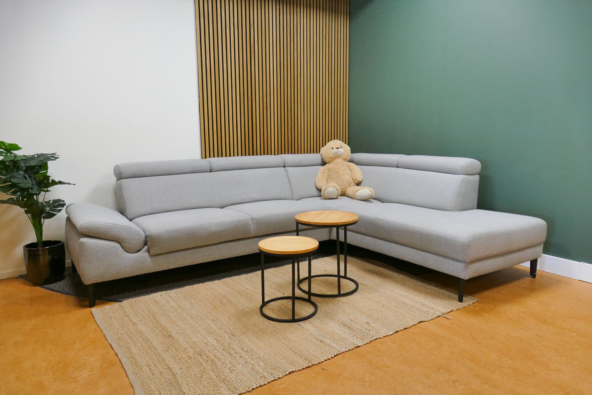 Montel Modena hoekbank in lichtgrijze gemêleerde stof met vaste rugkussens en verstelbare elementen. Comfortabele zit met een industriële en moderne uitstraling. Opgevuld voor langdurig zitcomfort.