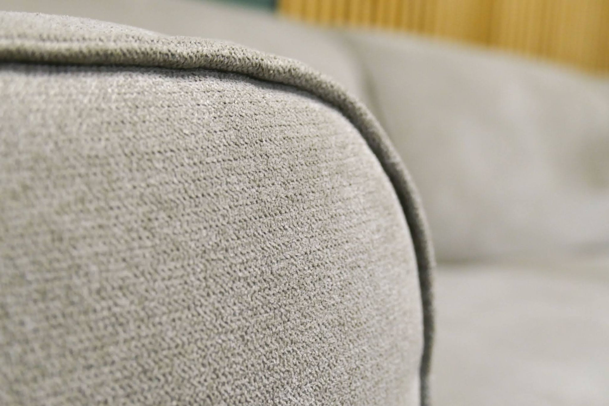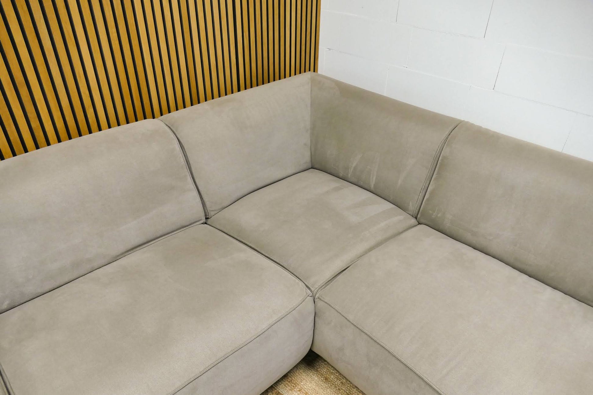 Taupekleurige Nous Living hoekbank met vaste rugkussens en moderne uitstraling. De bank is opgevuld voor langdurig ondersteunend zitcomfort en uitgerust met duurzame pocketvering. Verkeert in zeer goede staat, met een lichte tik in de pocketvering op het rechter zitvlak.