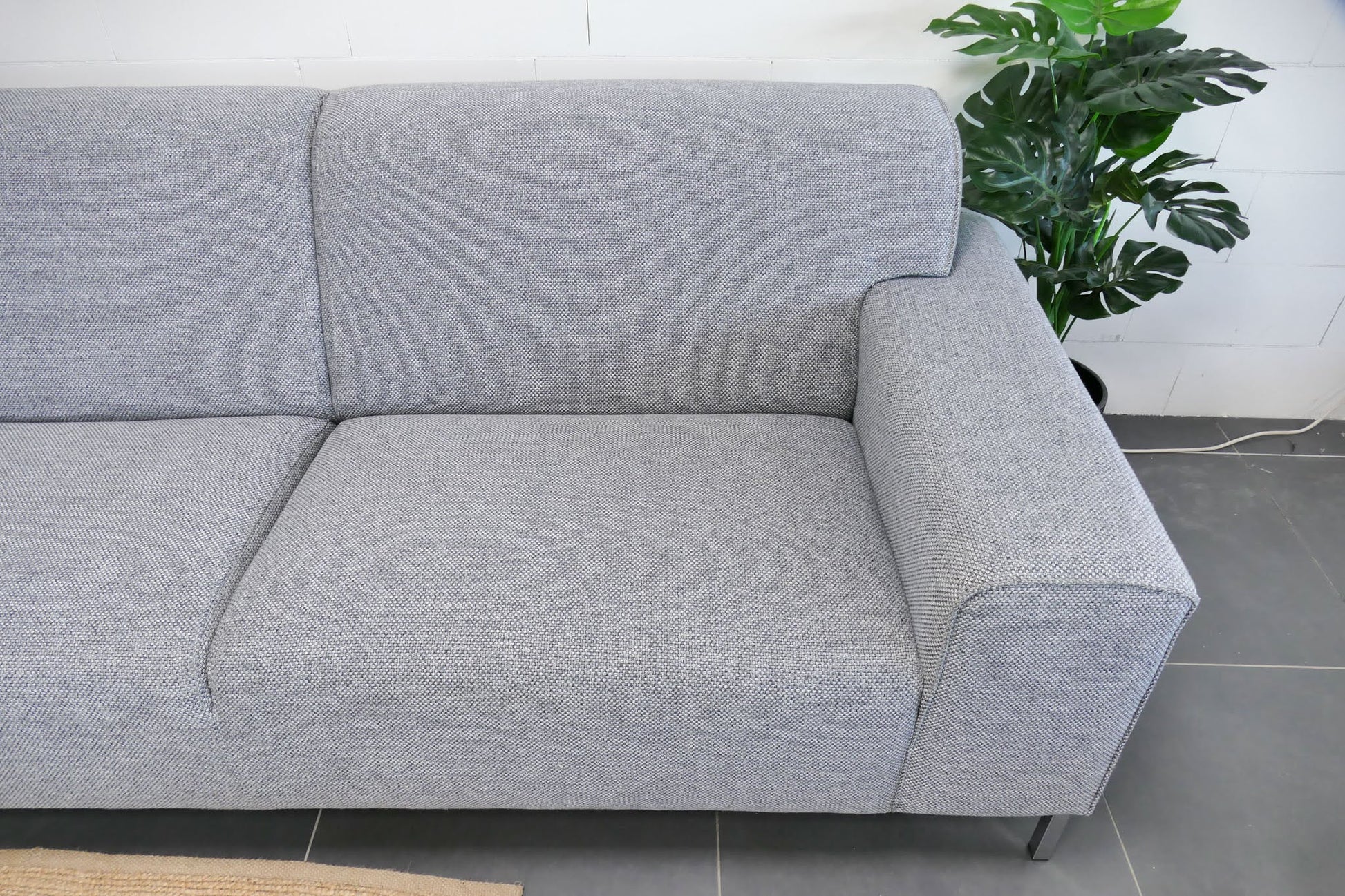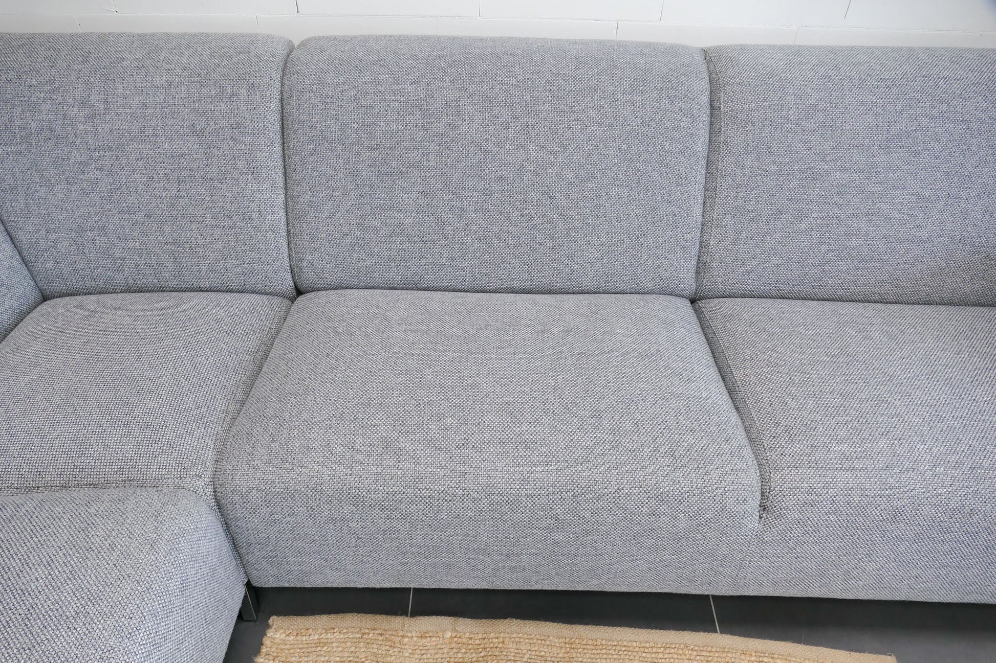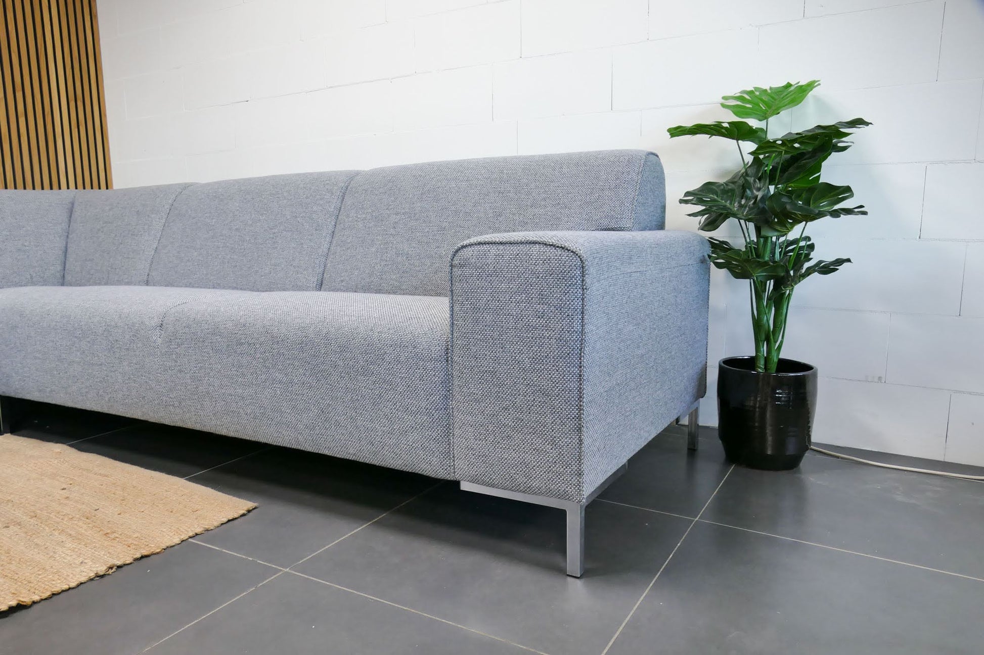 Lichtgrijze Piet Klerkx hoekbank met vaste zit en rugkussens en moderne uitstraling. De bank is extra opgevuld voor langdurig ondersteunend zitcomfort en voorzien van zitvlakken van kwalitatief koudschuim. Verkeert in zeer goede staat met slechts minimale sporen van gebruik.