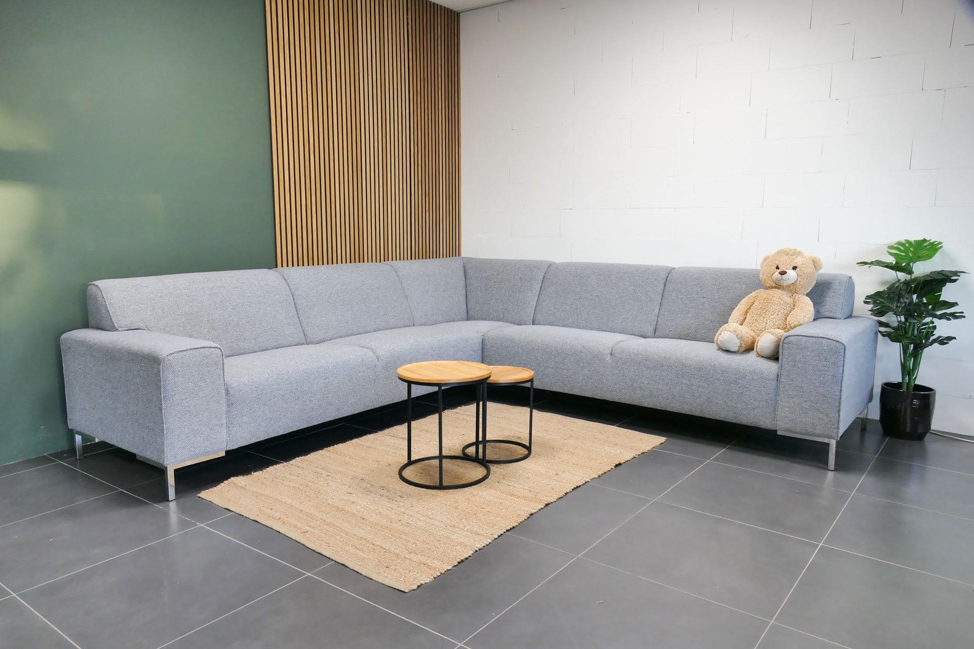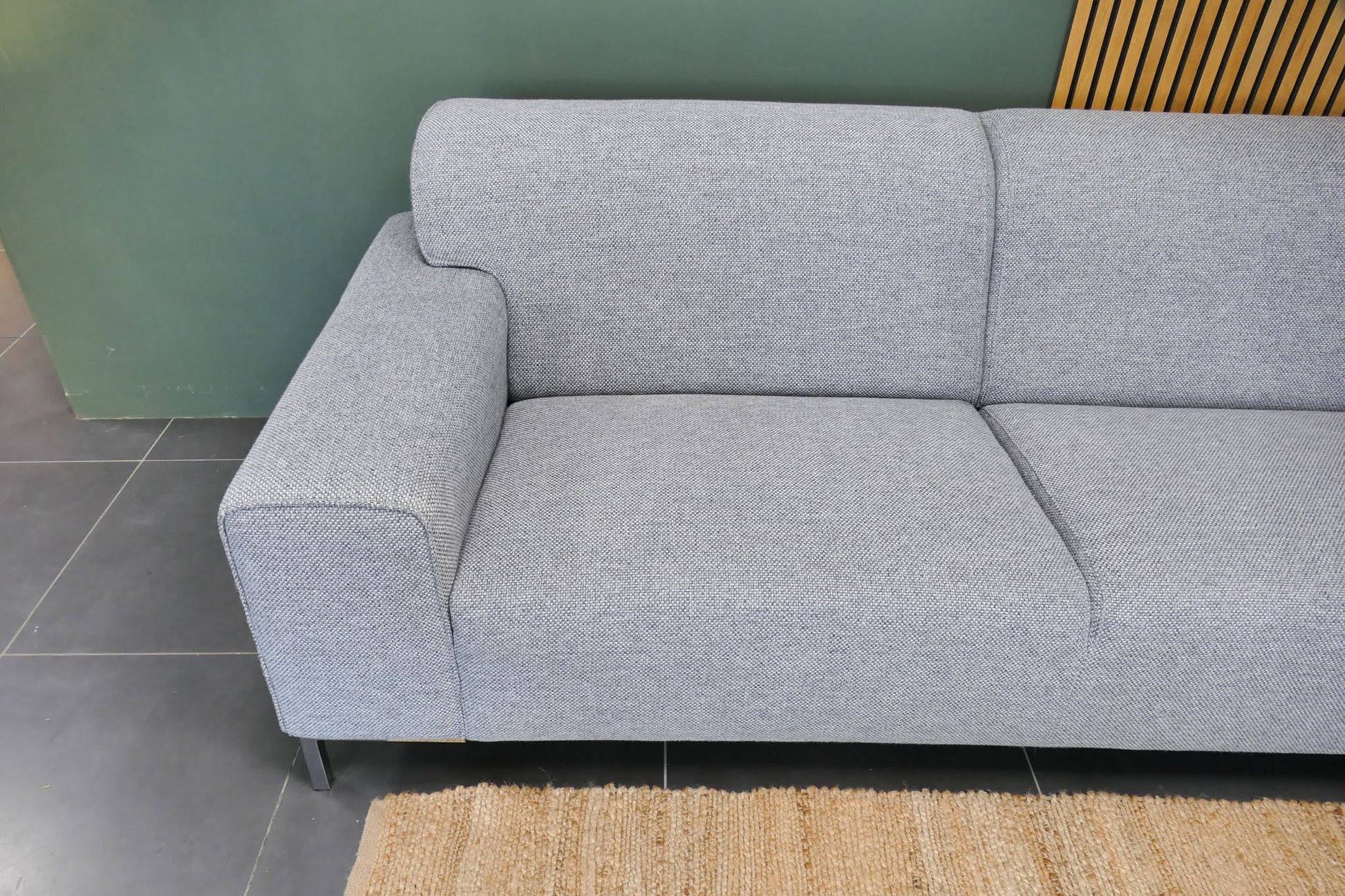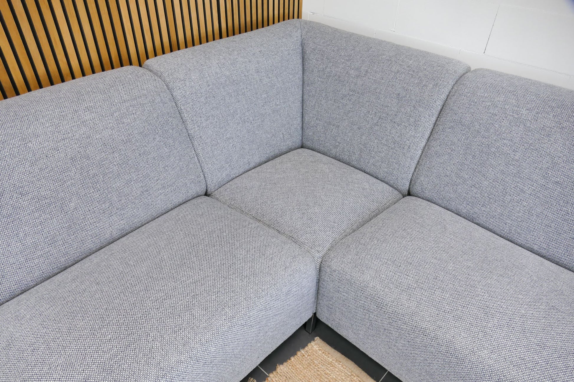 Lichtgrijze Piet Klerkx hoekbank met vaste zit en rugkussens en moderne uitstraling. De bank is extra opgevuld voor langdurig ondersteunend zitcomfort en voorzien van zitvlakken van kwalitatief koudschuim. Verkeert in zeer goede staat met slechts minimale sporen van gebruik.