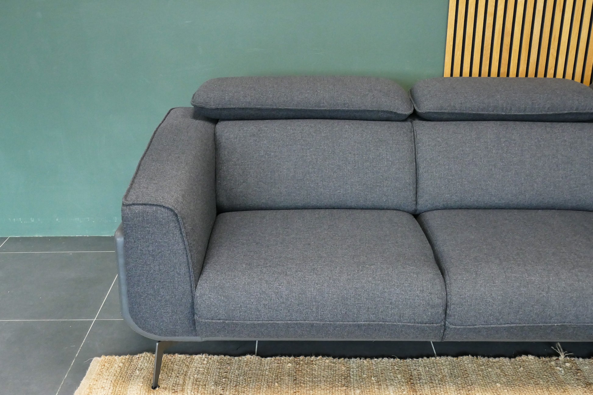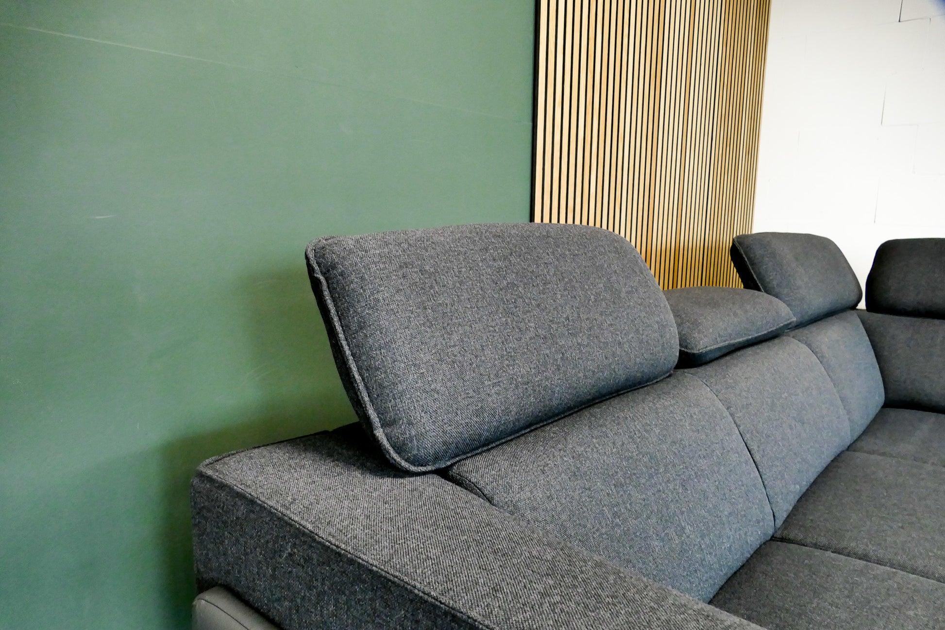 Moderne Xooon Volare hoekbank in antraciet met verstelbare rug- en hoofdsteunen. De bank verkeert in zeer nette staat met slechts minimale slijtage aan het leer.