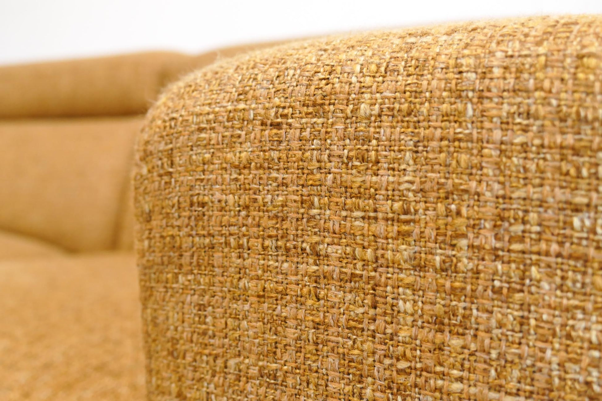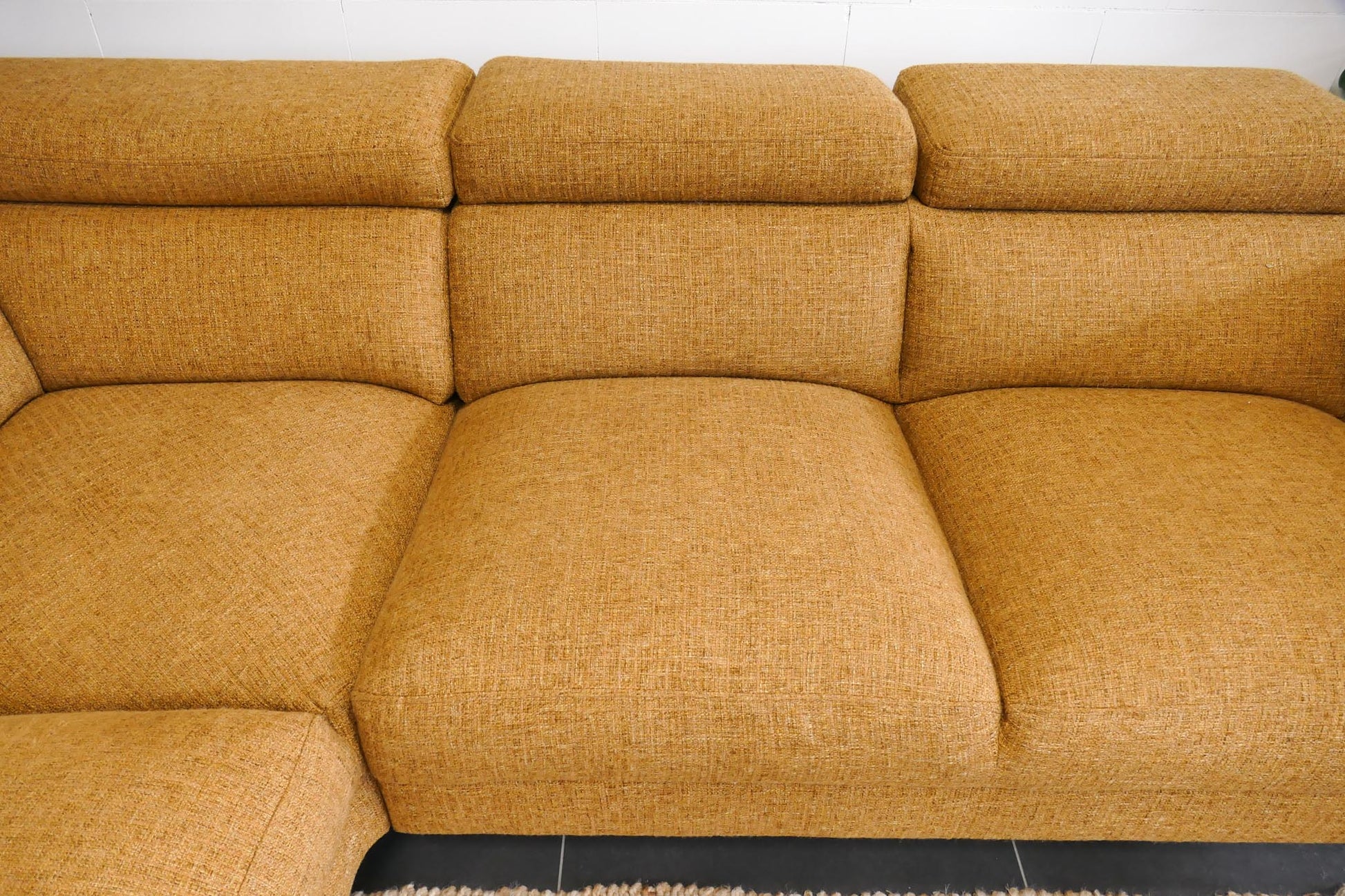 Goudgele InHouse Nayomi hoekbank met verstelbare rug- en hoofdsteunen, vaste rugkussens en een losse hocker. De bank is extra opgevuld voor langdurig ondersteunend zitcomfort en voorzien van zitvlakken van kwalitatief koudschuim.
