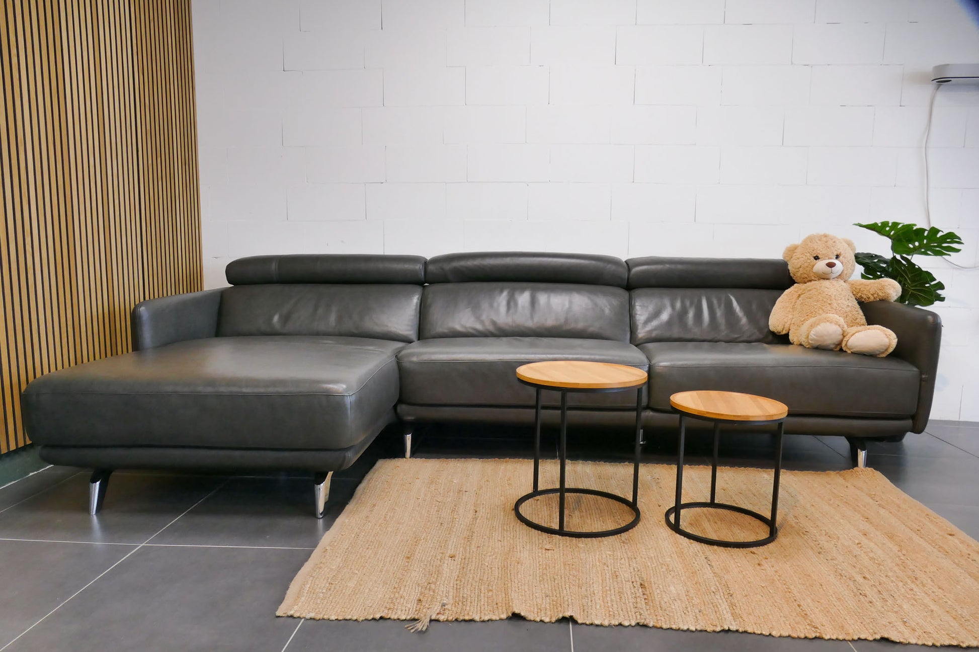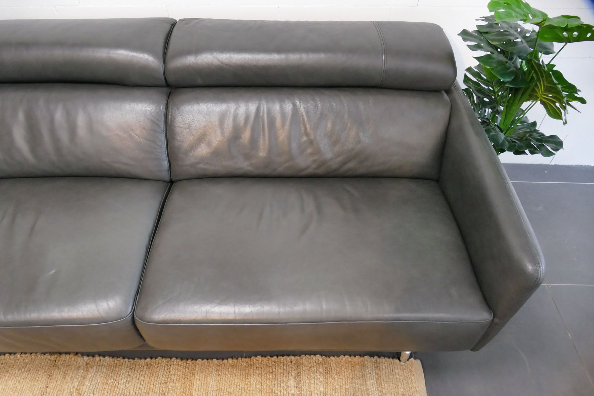 Antraciete bank van Inhouse met chaise longue uitgevoerd in grijs analine leer, met vaste rugkussens en verstelbare hoofdsteunen. Comfortabele loungezit met ontspannen zithouding. Opgevuld voor langdurig zitcomfort.