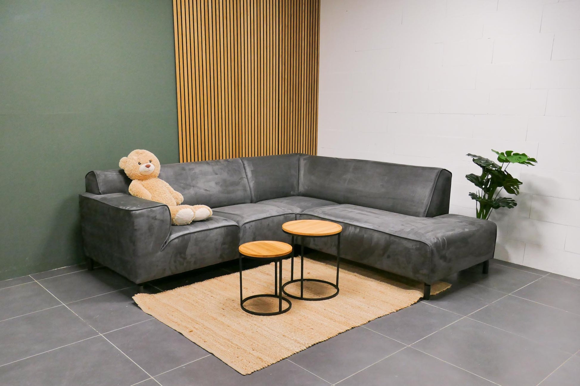 Kleine hoekbank in antraciet microvezel met vaste zit- en rugkussens. Praktische en comfortabele bank met industrieel en modern design.