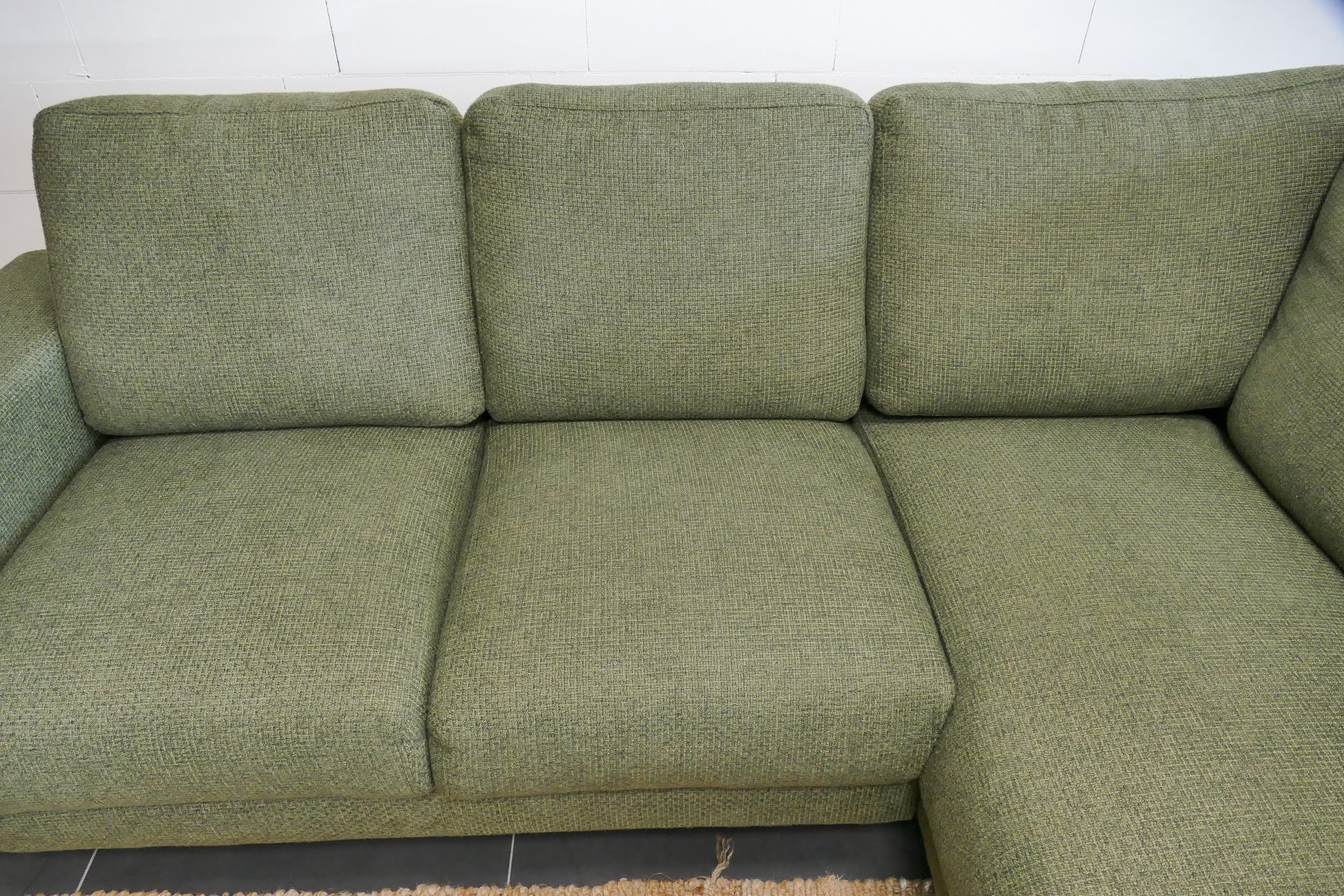 Compacte maar stijlvolle hoekbank van Pronto in donker groen. Dankzij de afneembare hoofd- en rugkussens is de bank praktisch in onderhoud en blijft hij er fris en verzorgd uitzien. Uitgerust met SG40 schuim voor stevig zitcomfort en lange levensduur.