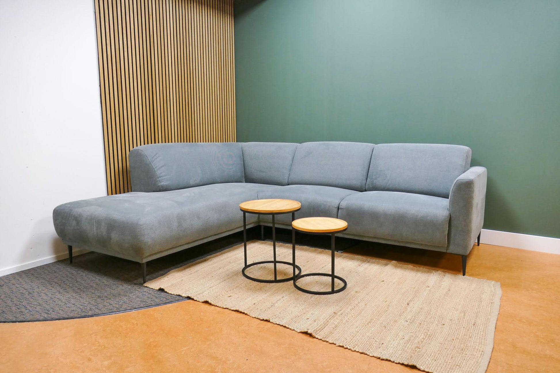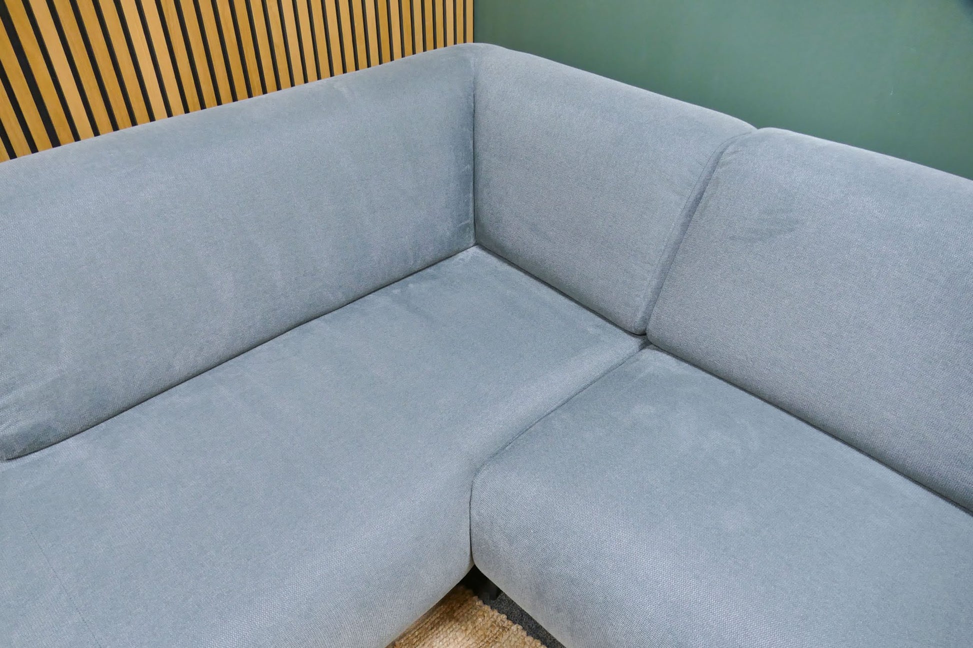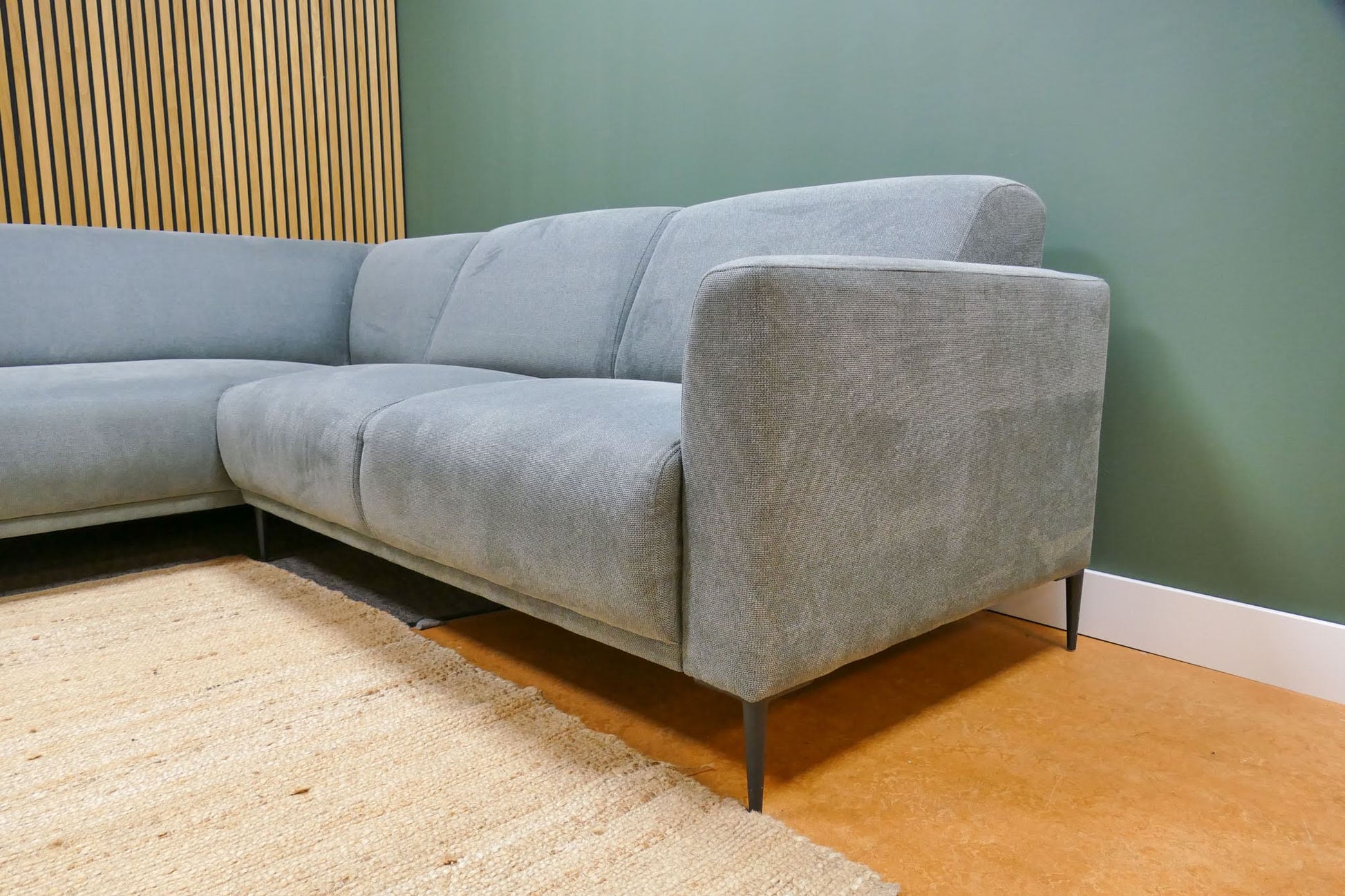 Hoekbank in jeans grijs blauwe uni stof met vaste rugkussens en een kortere, hogere zit. Compact formaat met comfortabele en ondersteunende zit. Opgevuld voor langdurig zitcomfort.