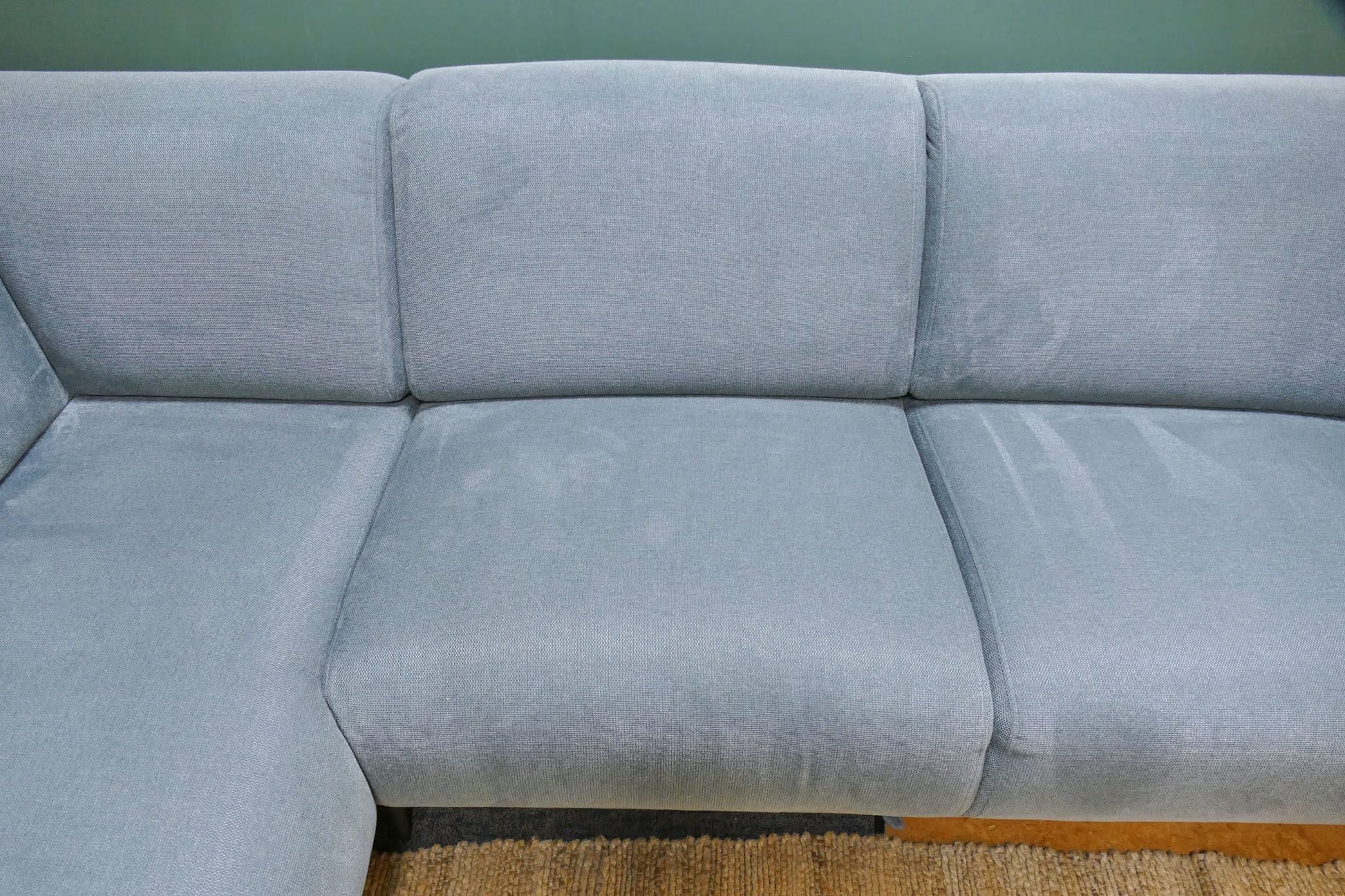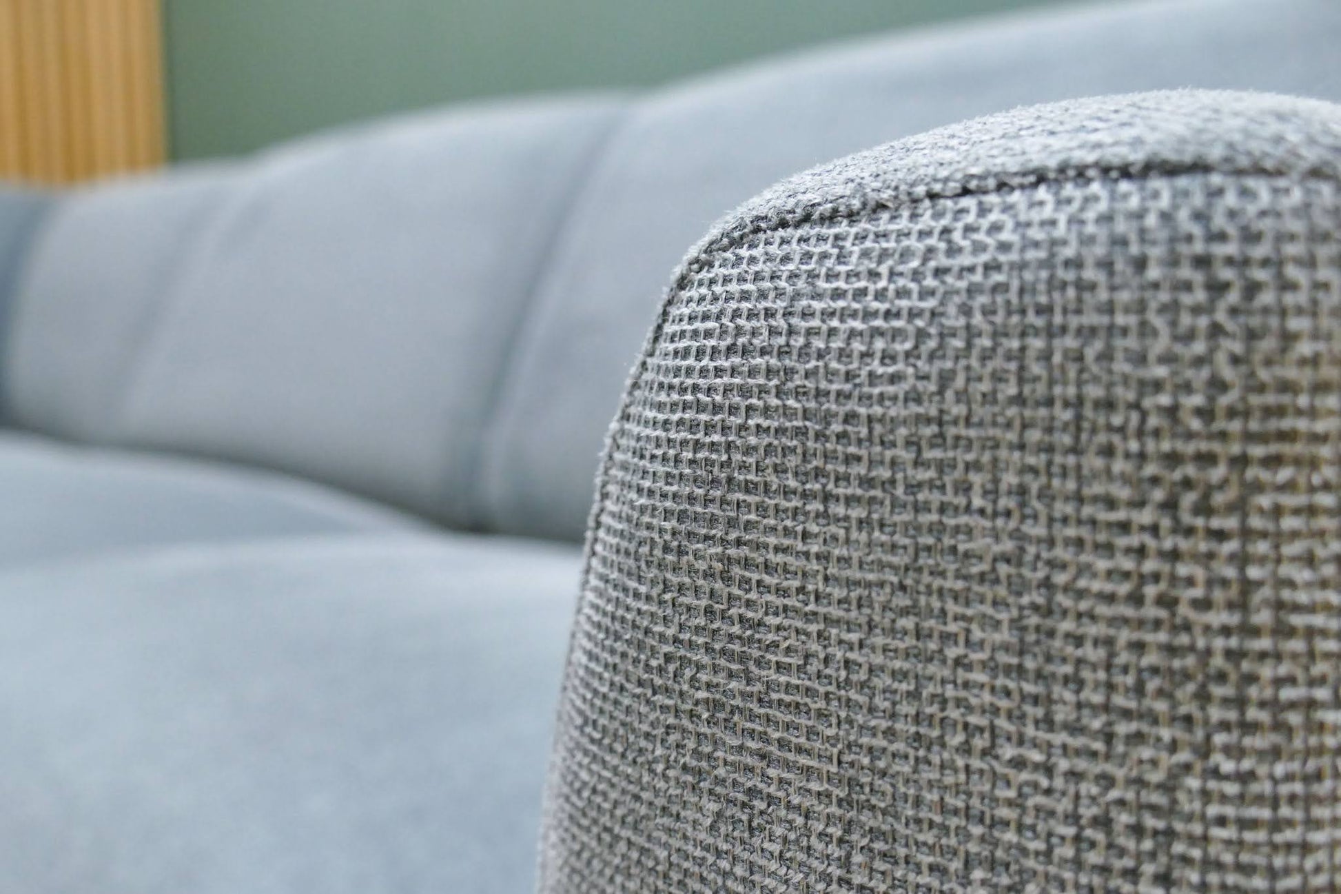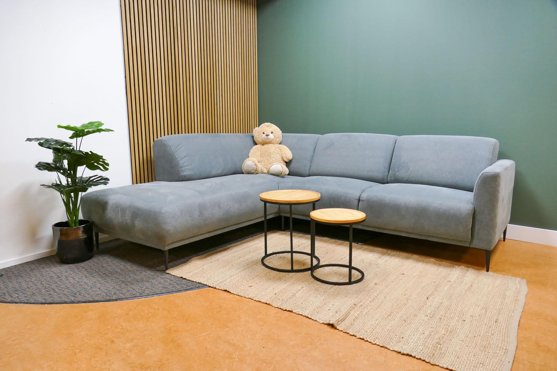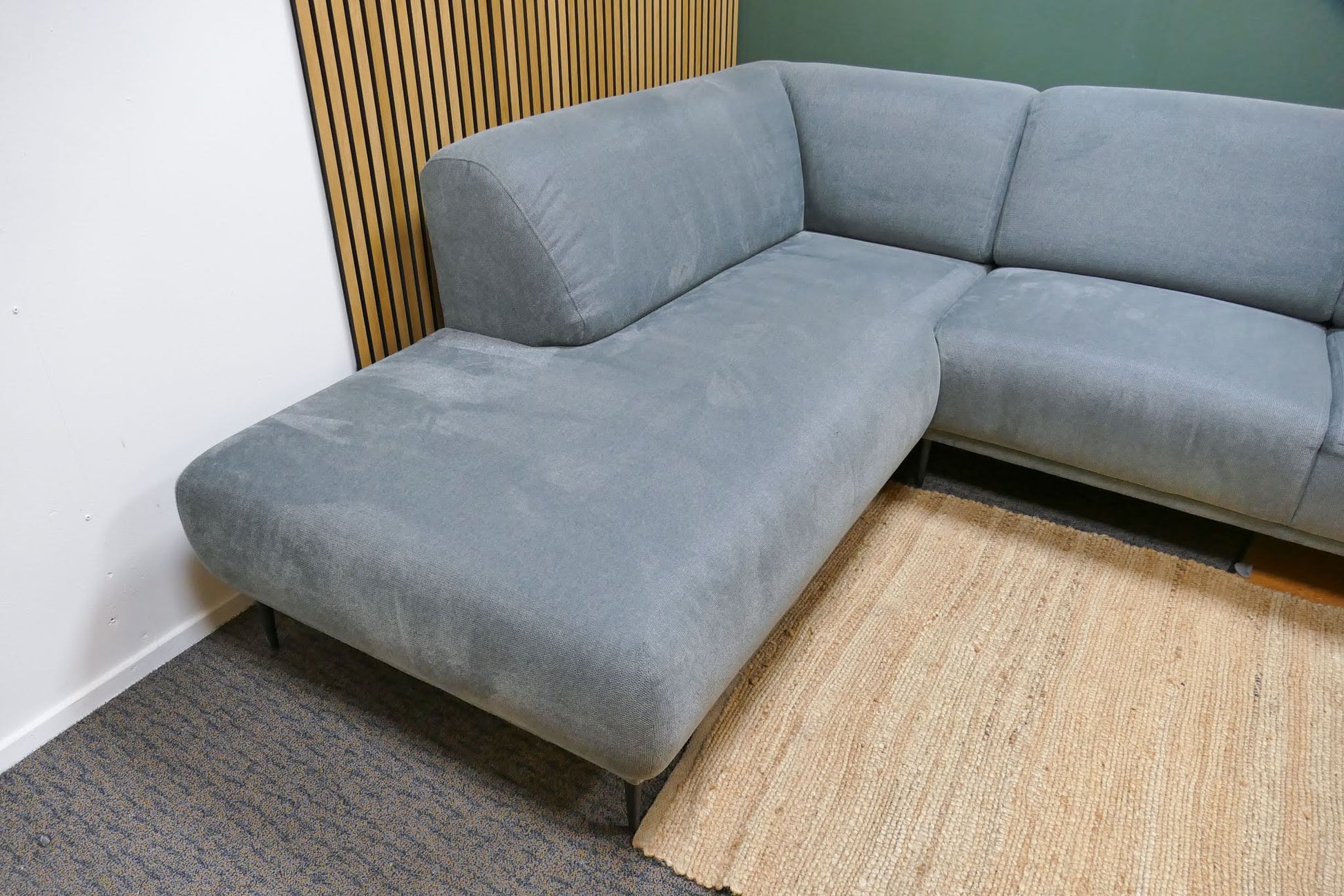 Hoekbank in jeans grijs blauwe uni stof met vaste rugkussens en een kortere, hogere zit. Compact formaat met comfortabele en ondersteunende zit. Opgevuld voor langdurig zitcomfort.