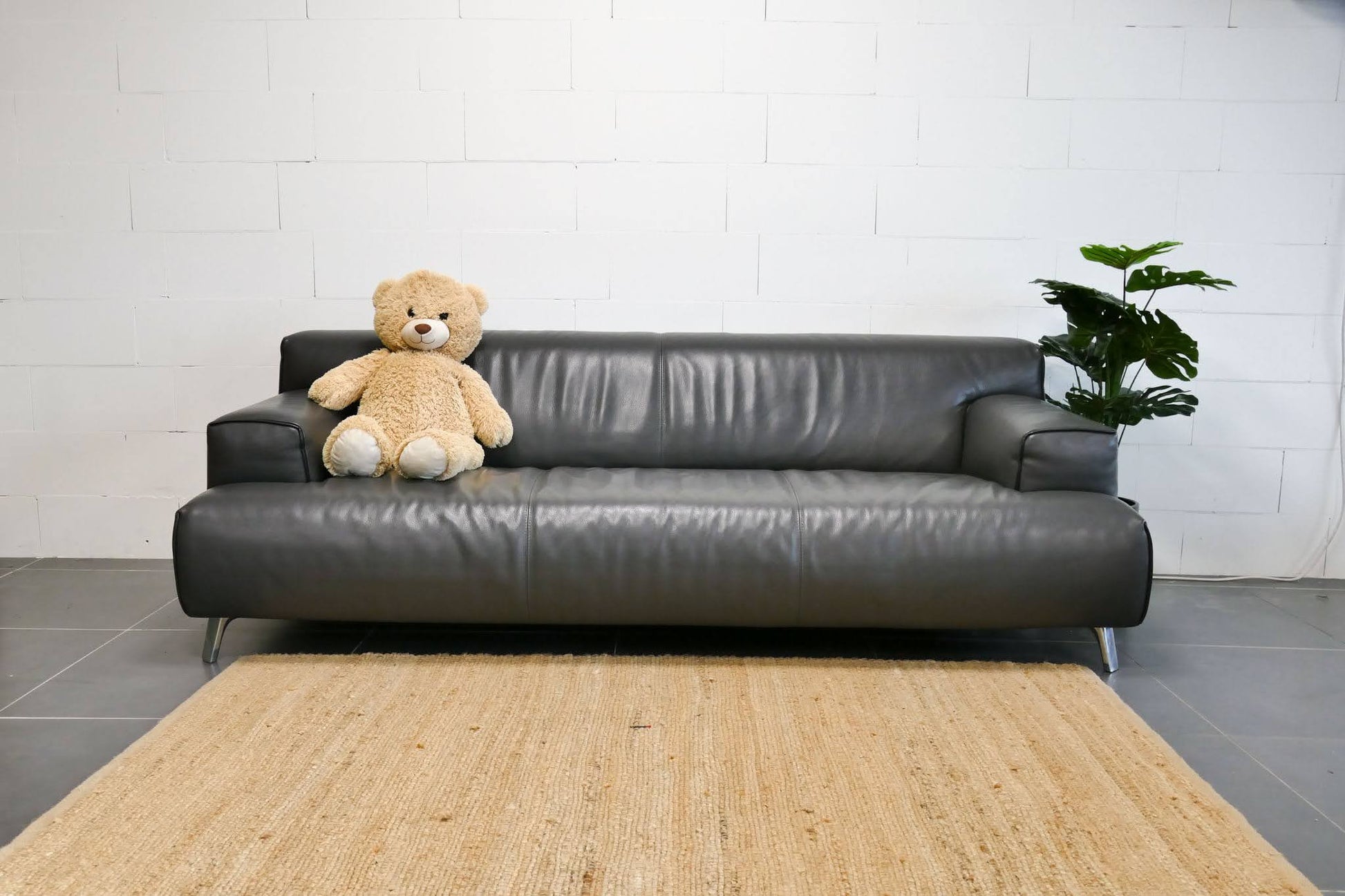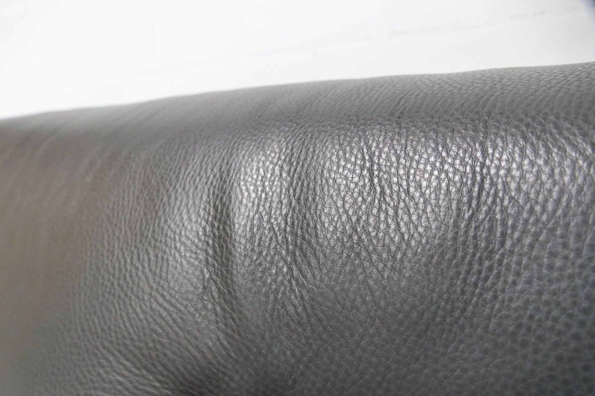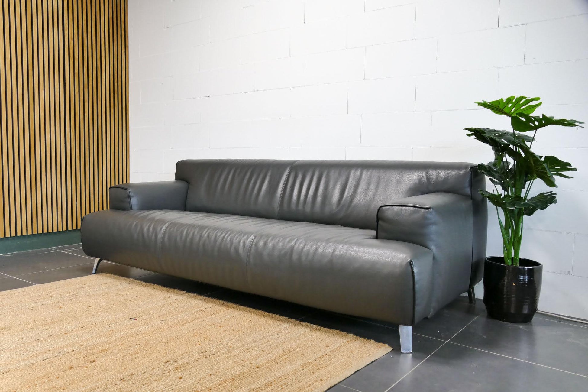 Antracietkleurige leren Leolux Oscar bank met vaste rugkussens en lage, loungeachtige zit. De bank verkeert in zeer goede staat, met lichte plooivorming op het zitvlak passend bij normaal leergebruik. Verder is het leer nog erg soepel en goed onderhouden.