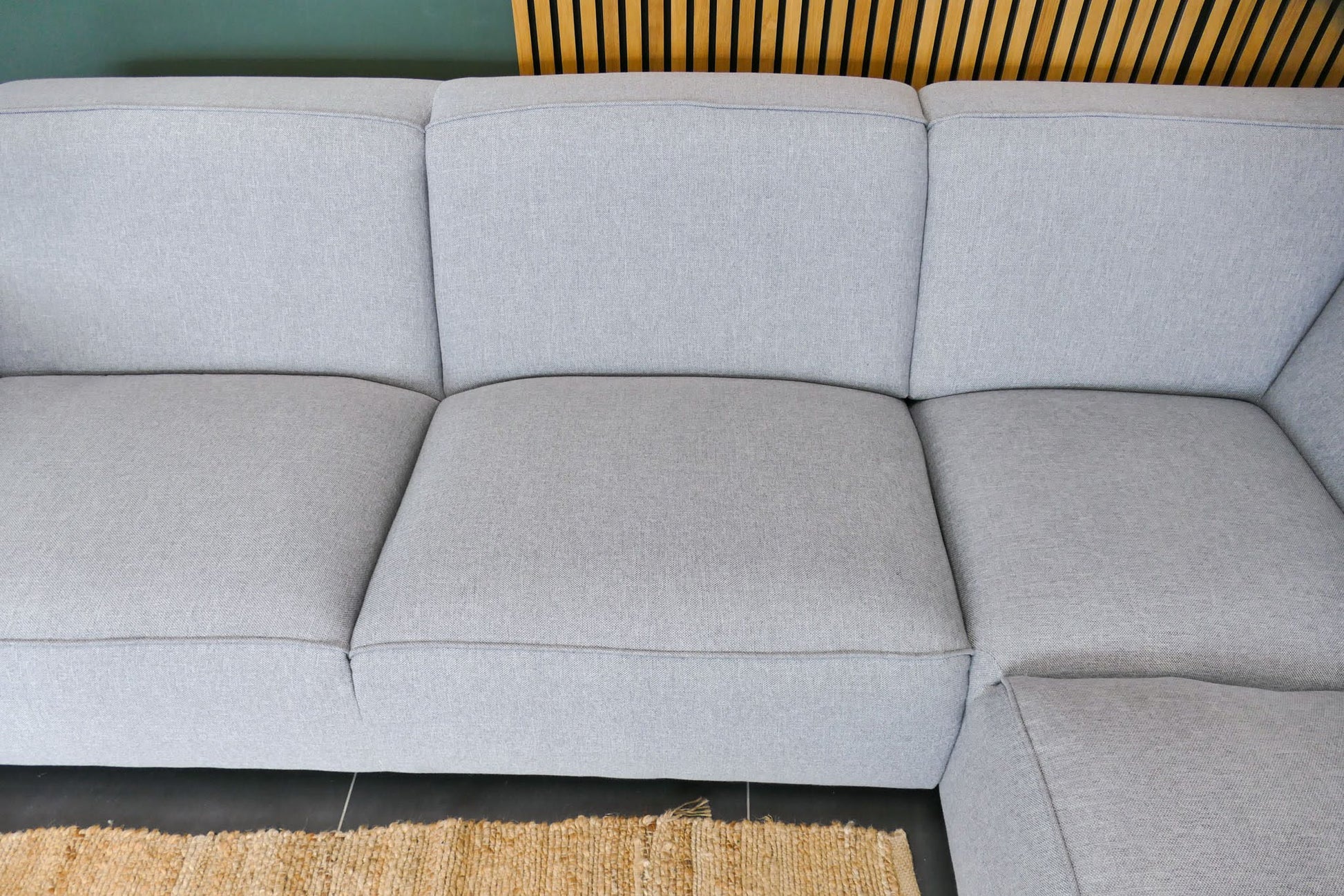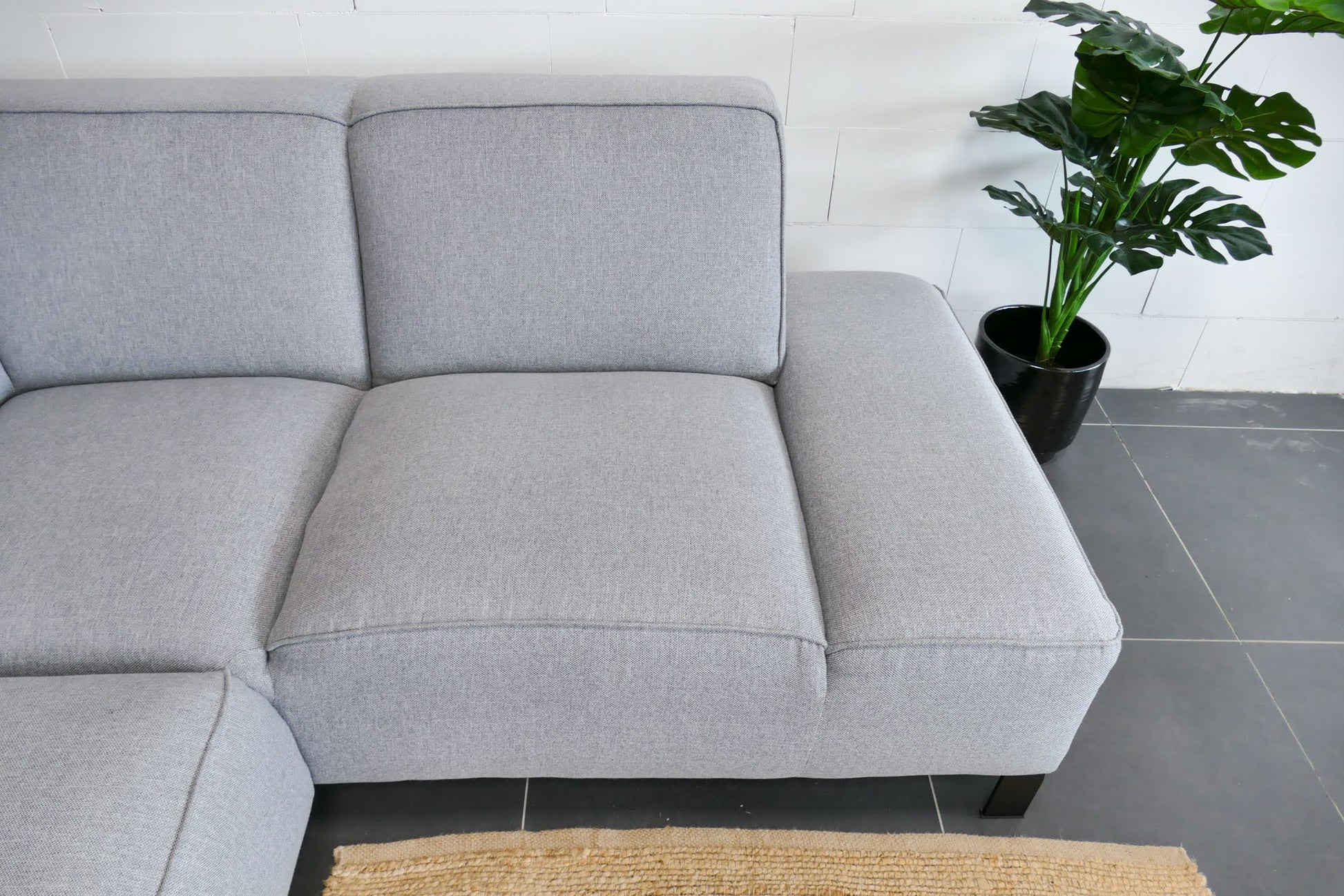 Lichtgrijze Loods 5 Lot hoekbank met vaste rugkussens voor langdurig ondersteunend zitcomfort en voorzien van zitvlakken van kwalitatief koudschuim. De bank zit comfortabel, oogt strak en heeft slechts zeer minimale gebruikssporen.