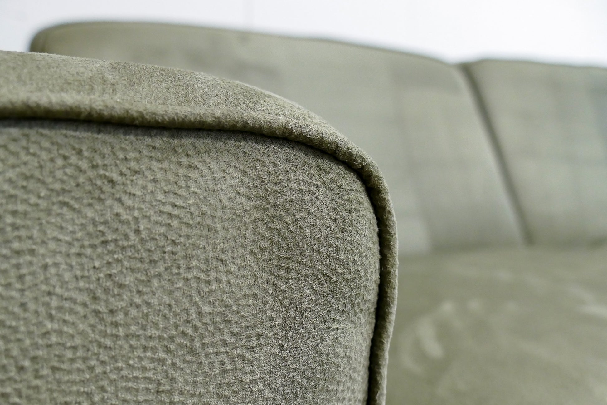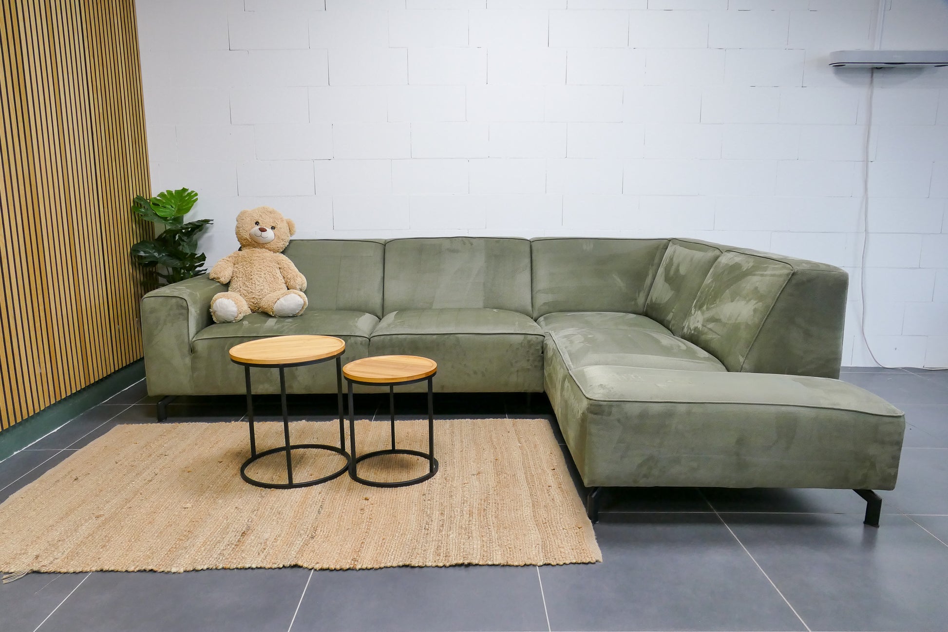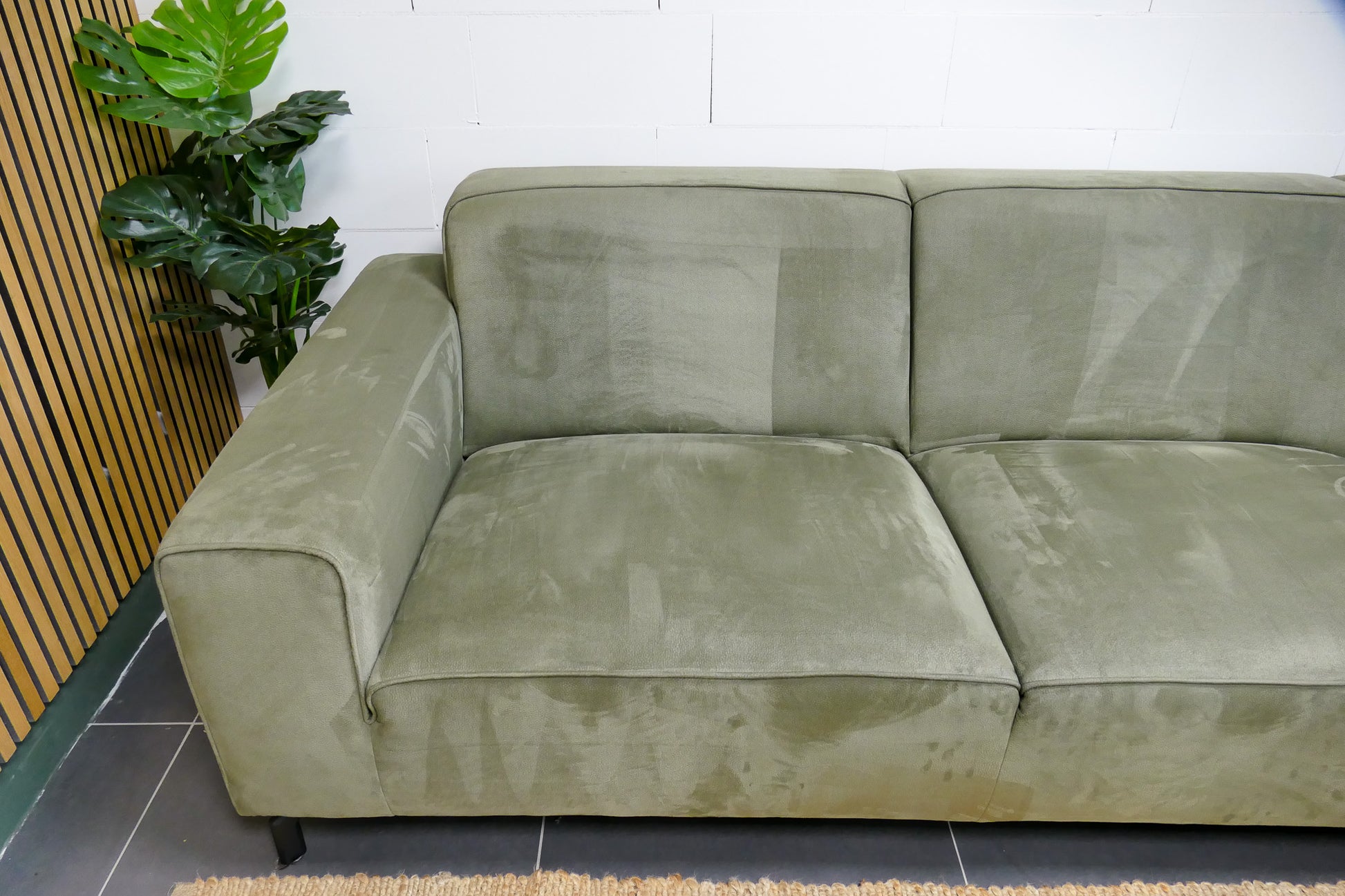 Compacte Loods 5 Lot hoekbank in een frisse lichtgroene microvezelstof. De bank is extra opgevuld met SG40 voor langdurig ondersteunend zitcomfort en voorzien van zitvlakken van kwalitatief koudschuim. Dankzij de vaste rugkussens en middelharde zit biedt deze hoekbank een perfecte balans tussen comfort en ondersteuning. De bank verkeert in uitstekende staat, vergelijkbaar met een showroommodel.
