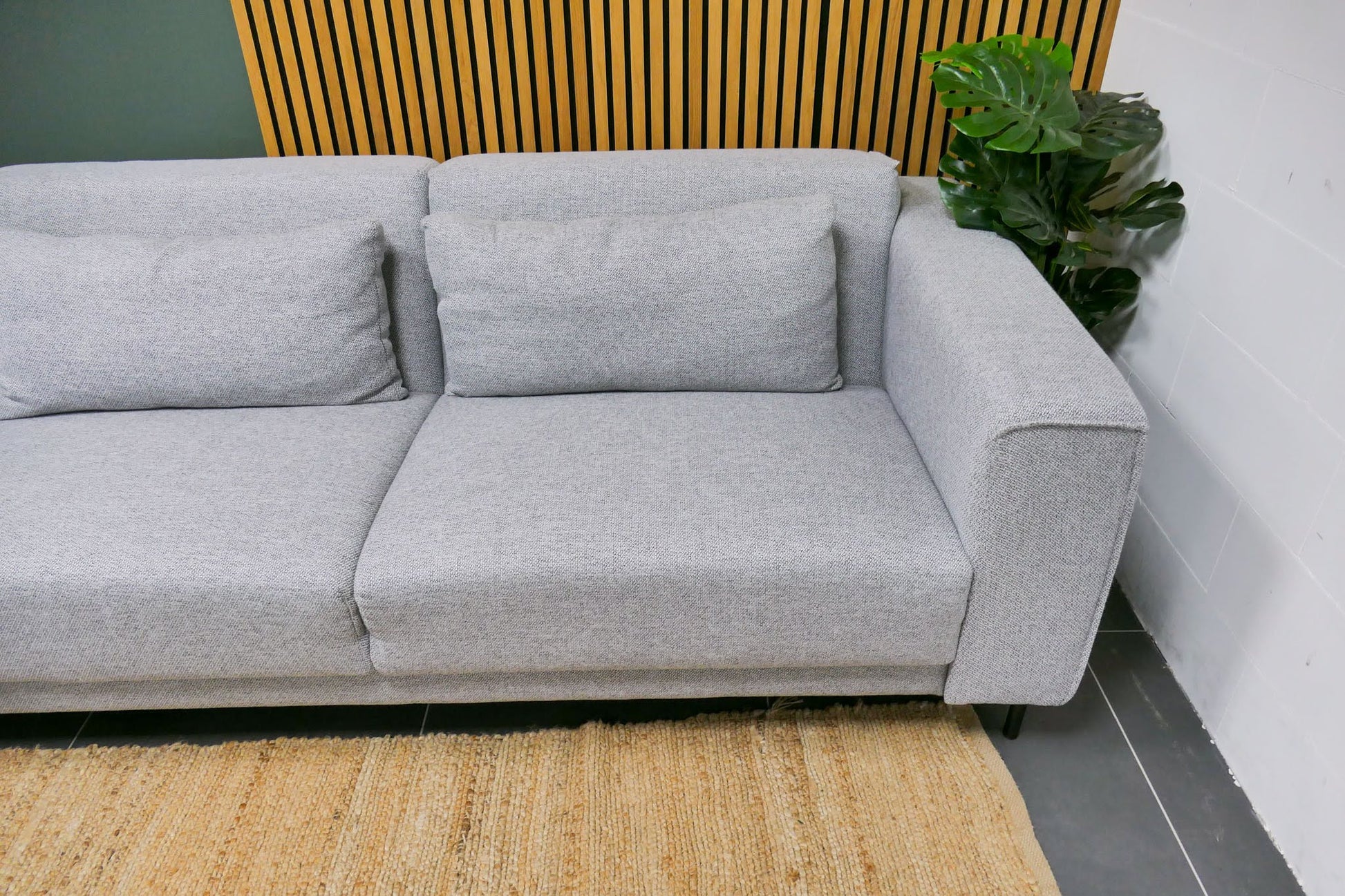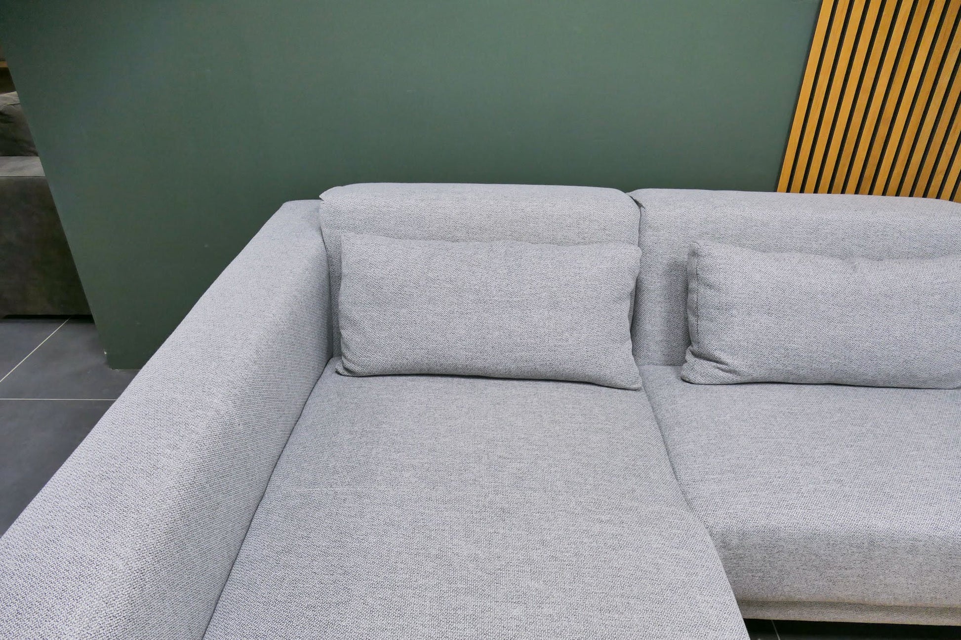 Lounge hoekbank in lichtgrijze gemêleerde stof met afneembare rugkussens. Comfortabele lounge zithouding met stevige ondersteuning en een industrieel, modern design.