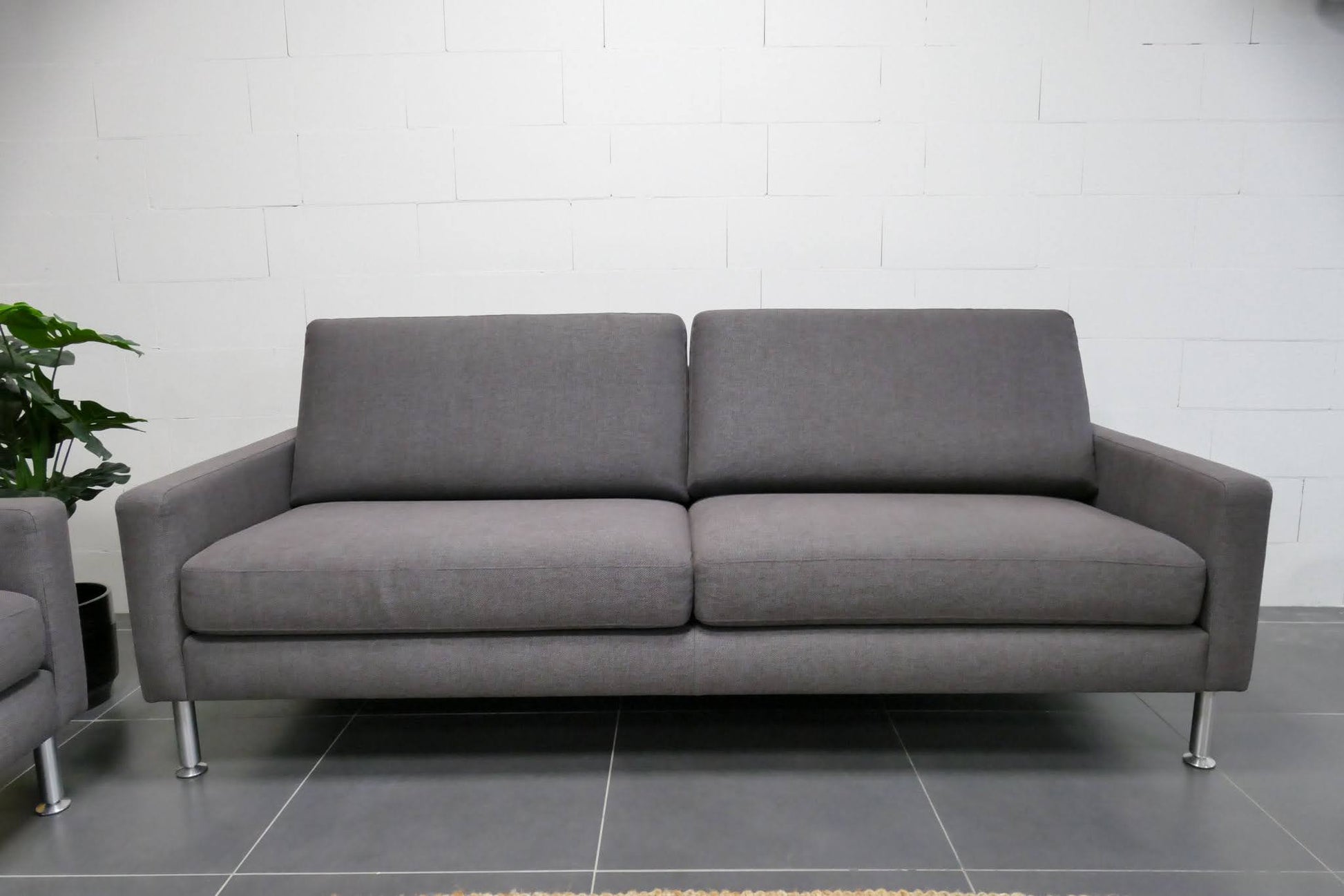 Hoogwaardige 3-zitsbankenset van Machalke in gemêleerde stof. De bank is grijs met een licht bruine tint. Ontworpen met losse zit- en rugkussens en een prettige hoge zit.