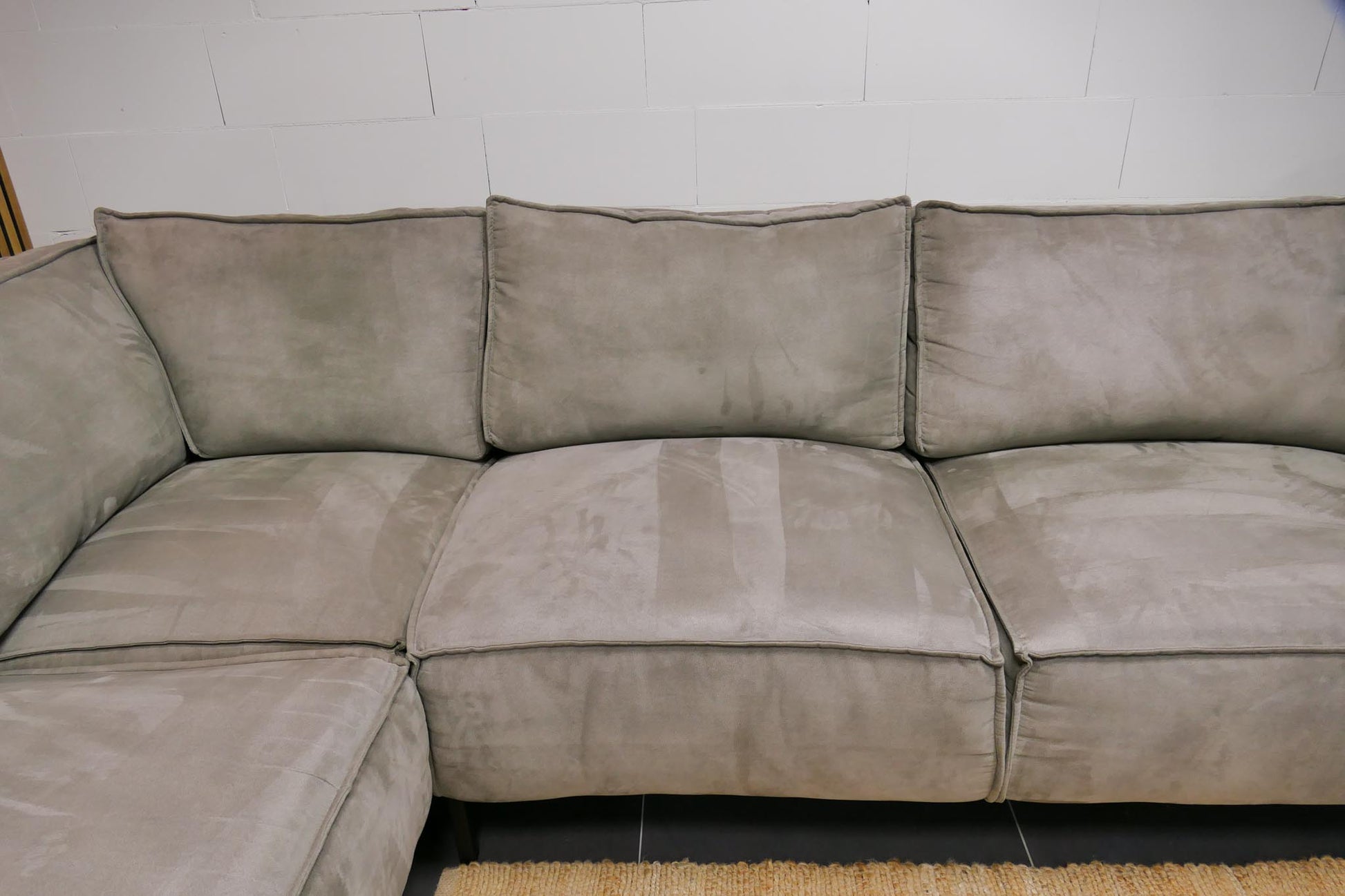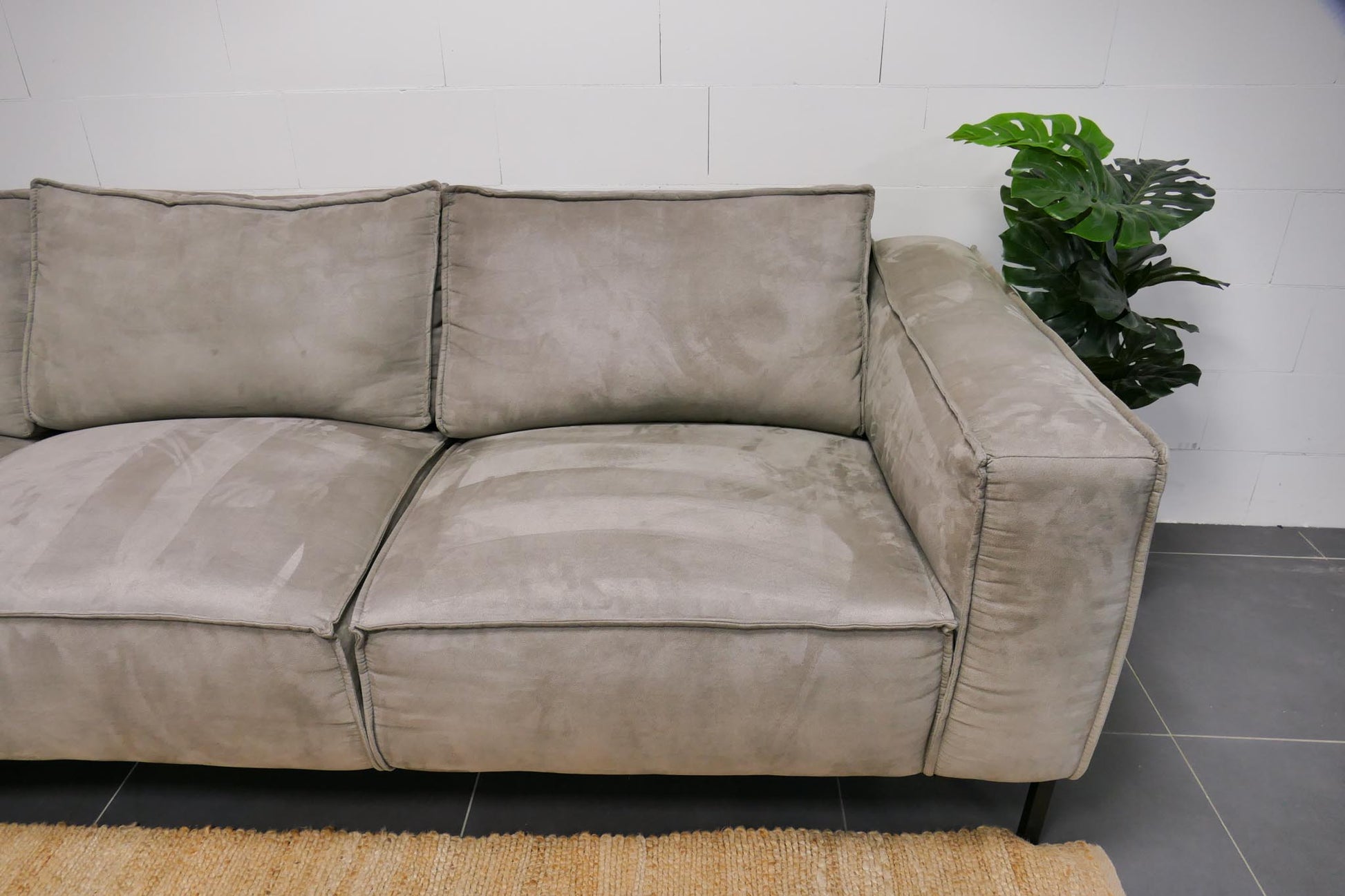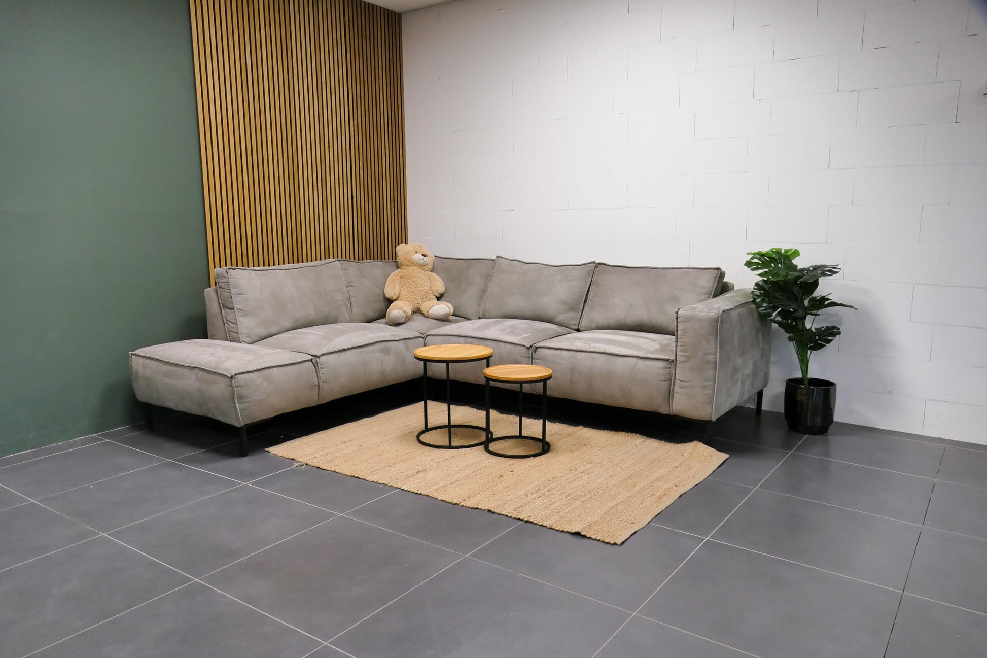 Moderne grijsgroene hoekbank in zachte microvezelstof. De bank biedt een comfortabele loungehouding met vaste zitkussens en royale zitdiepte.