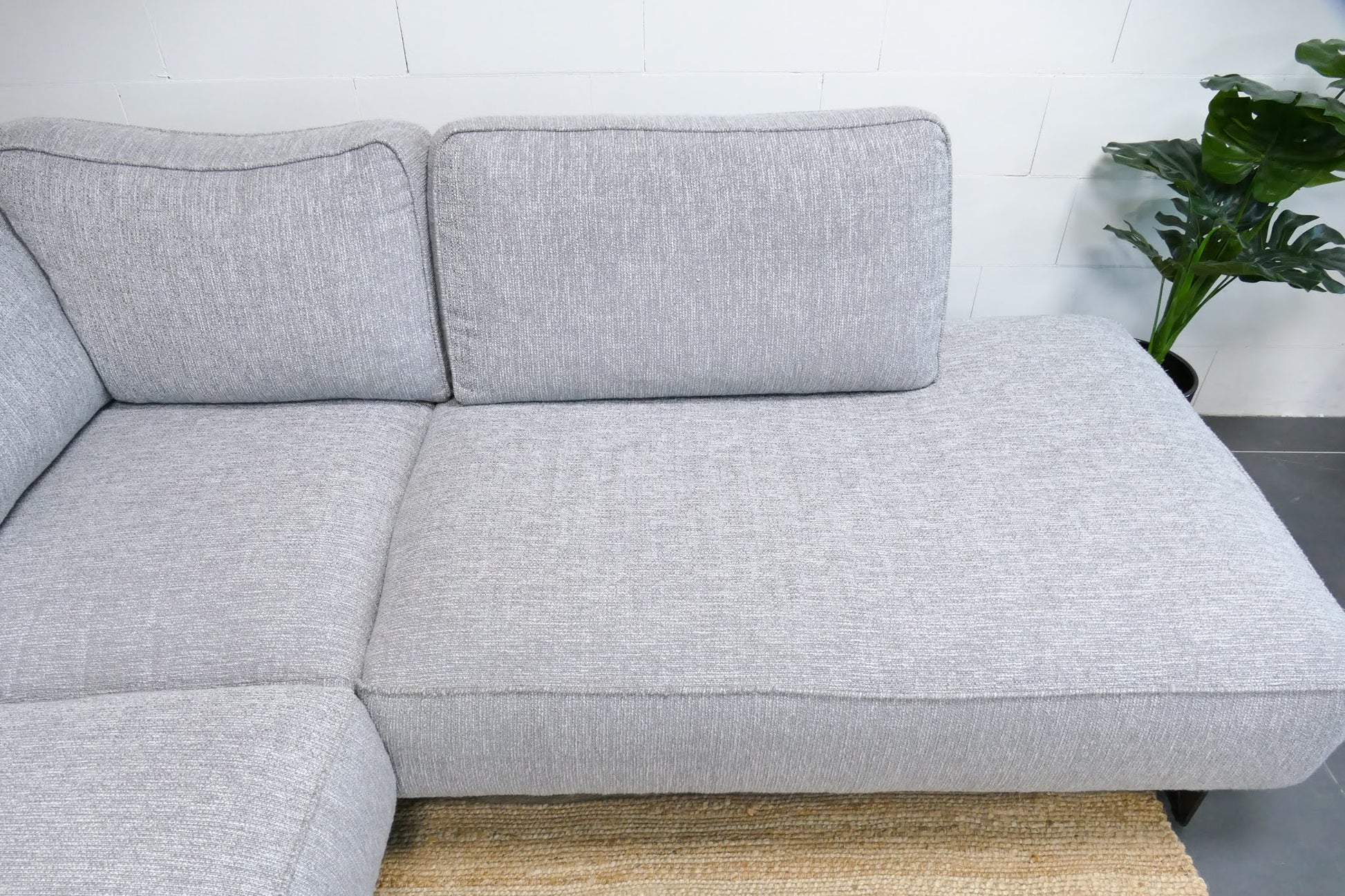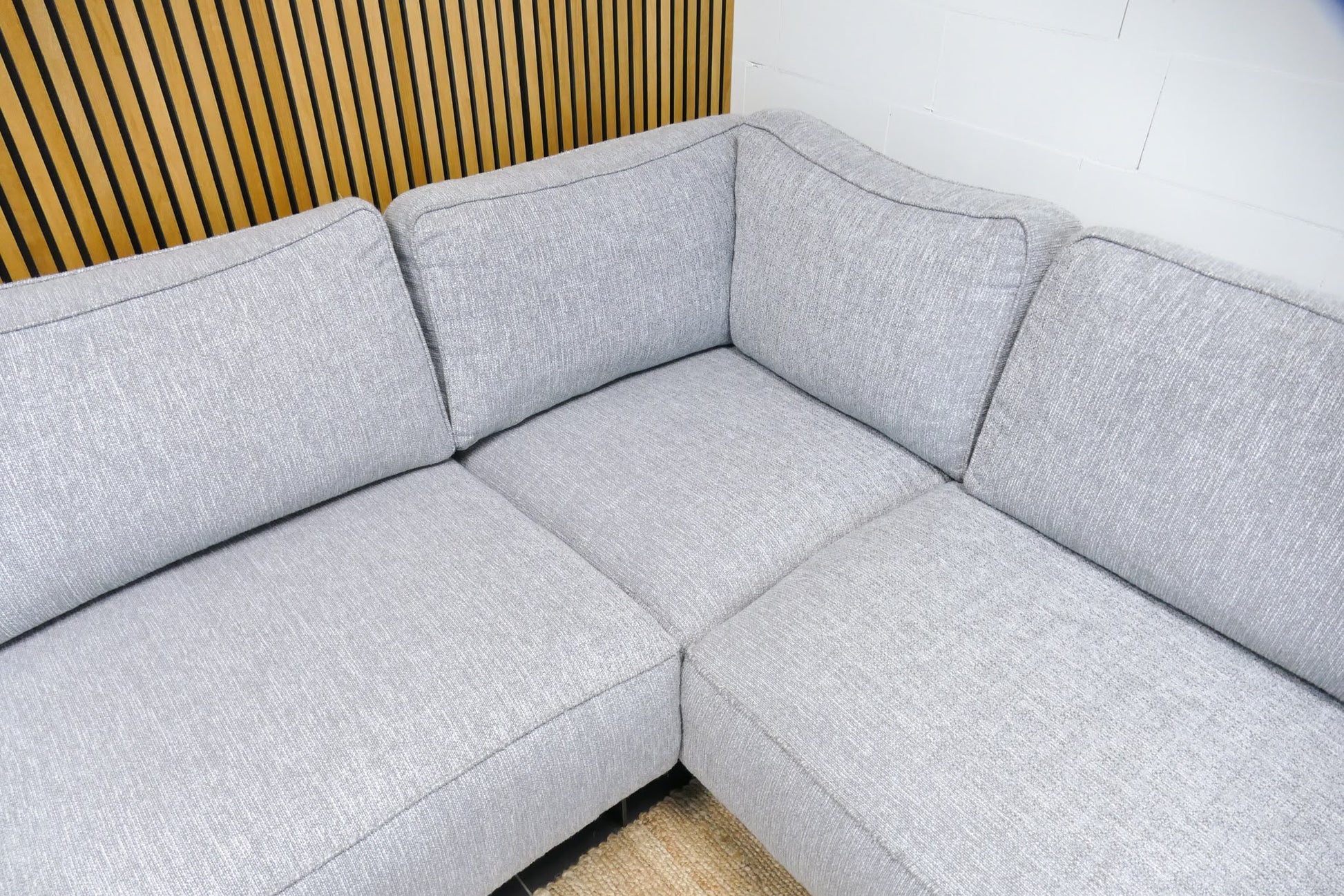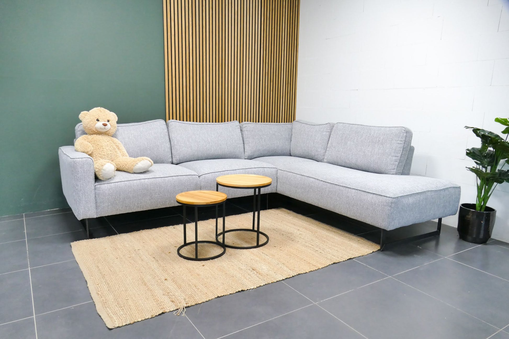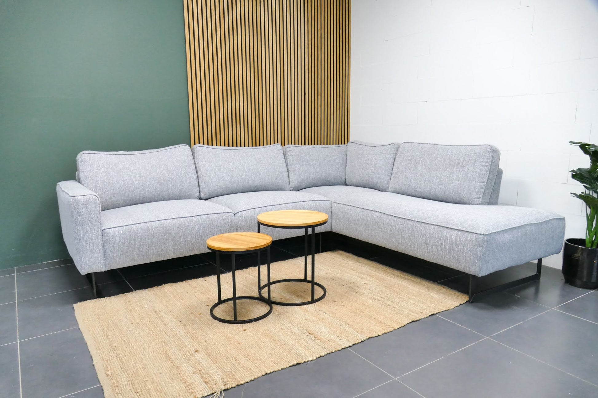 Lichtgrijze industriële hoekbank met vaste rugkussens en moderne uitstraling. De bank is extra opgevuld voor langdurig ondersteunend zitcomfort en verkeert in uitstekende staat.