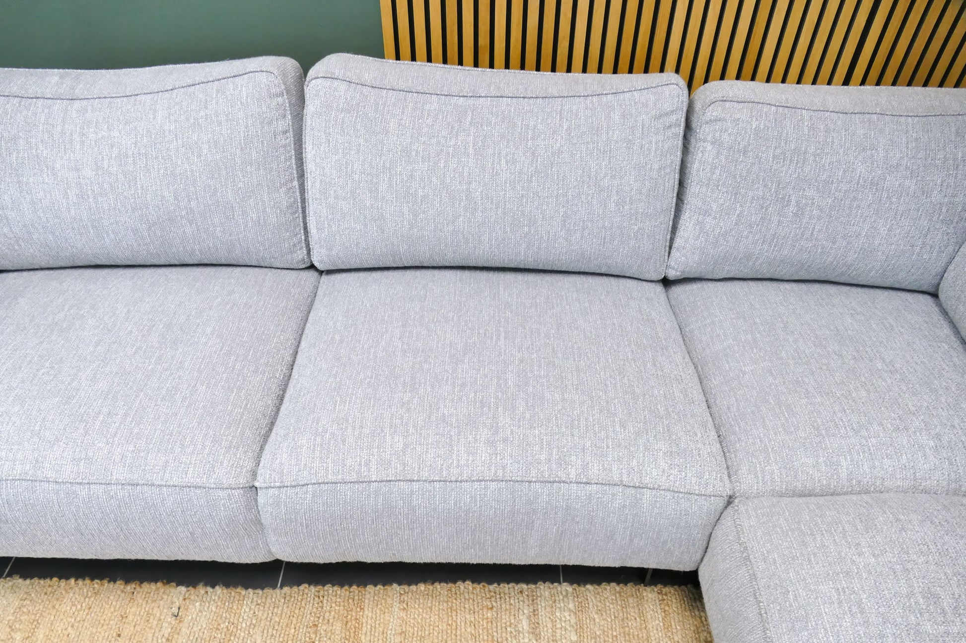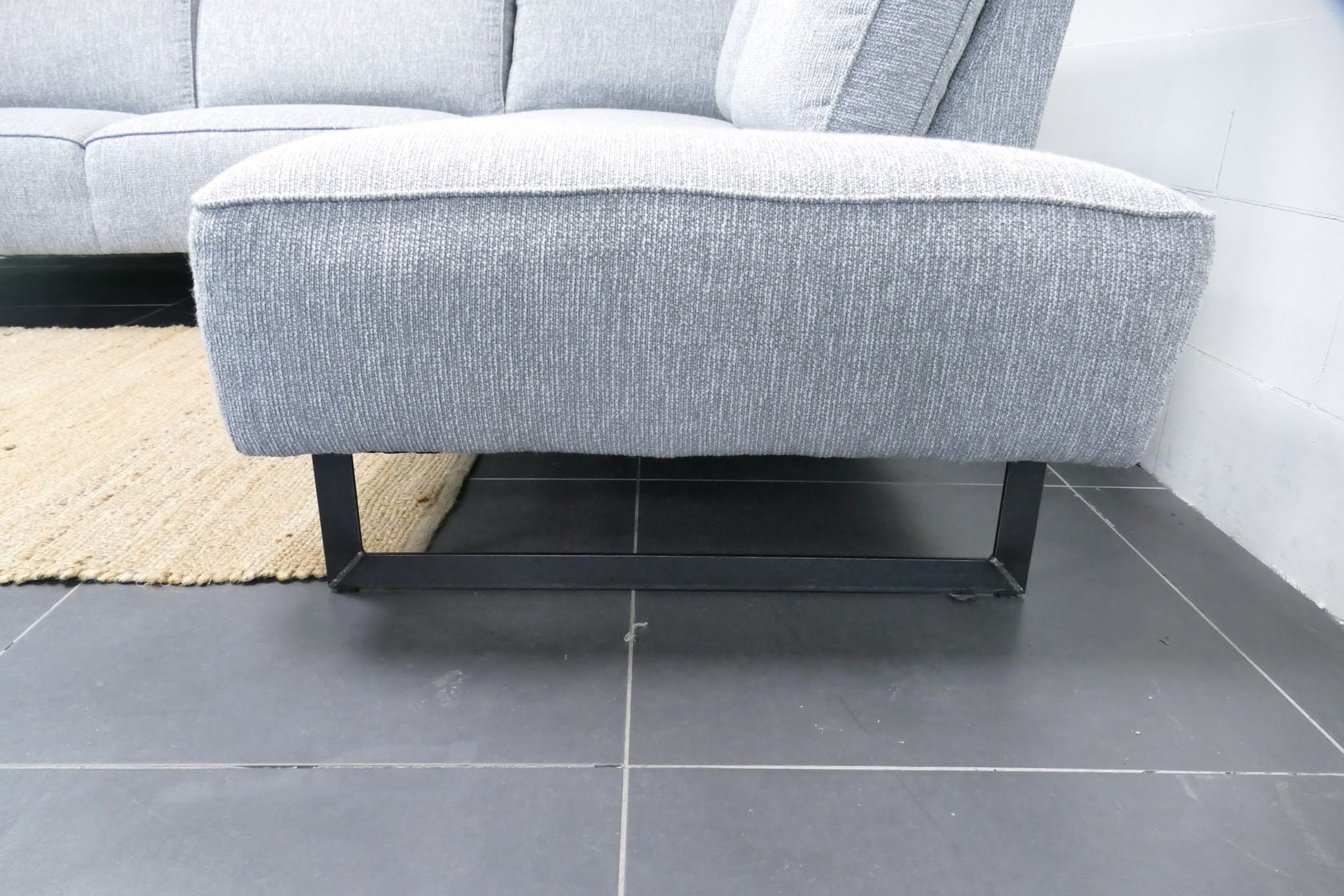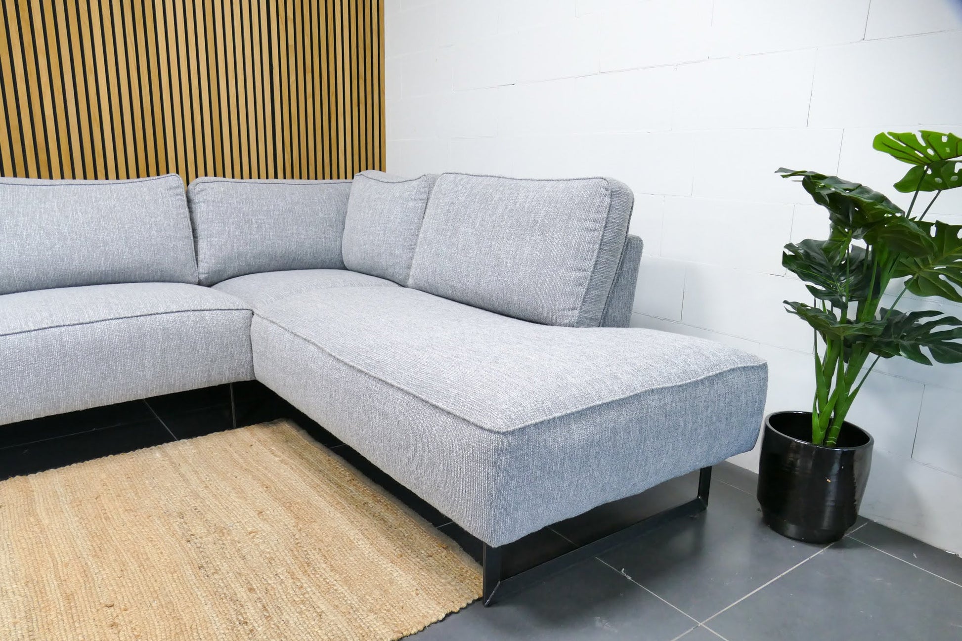 Lichtgrijze industriële hoekbank met vaste rugkussens en moderne uitstraling. De bank is extra opgevuld voor langdurig ondersteunend zitcomfort en verkeert in uitstekende staat.