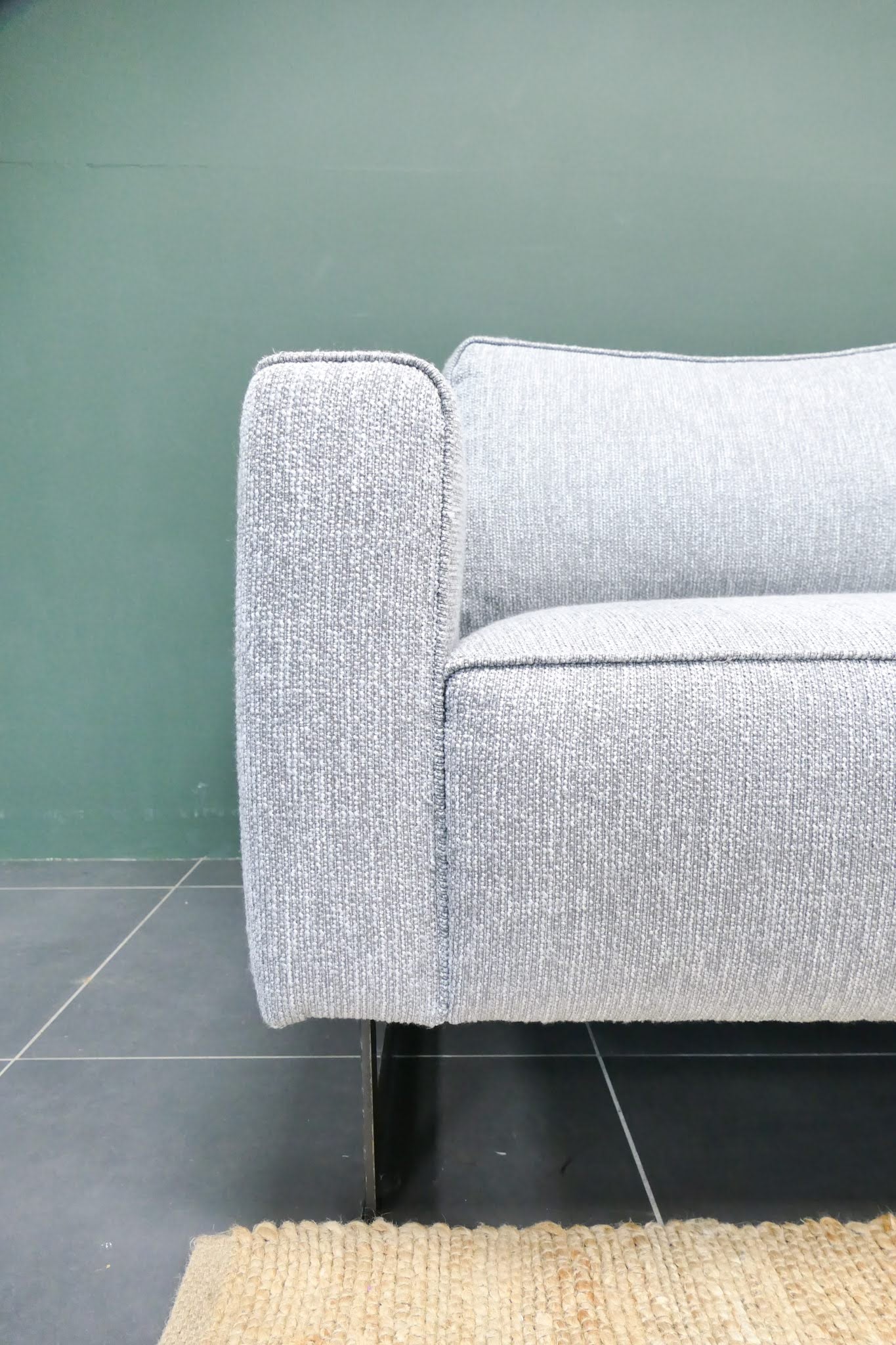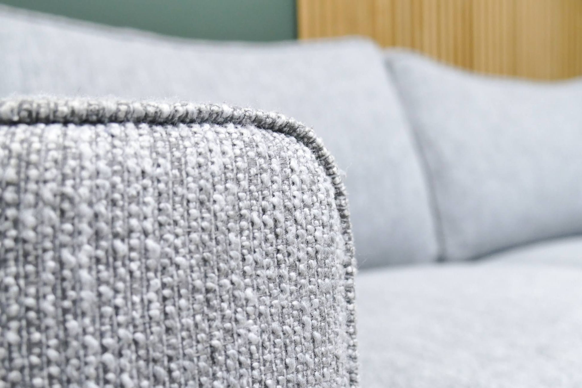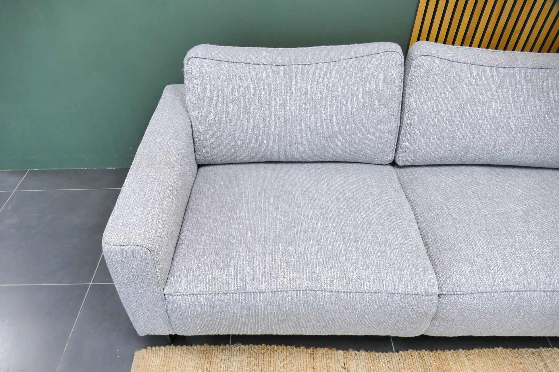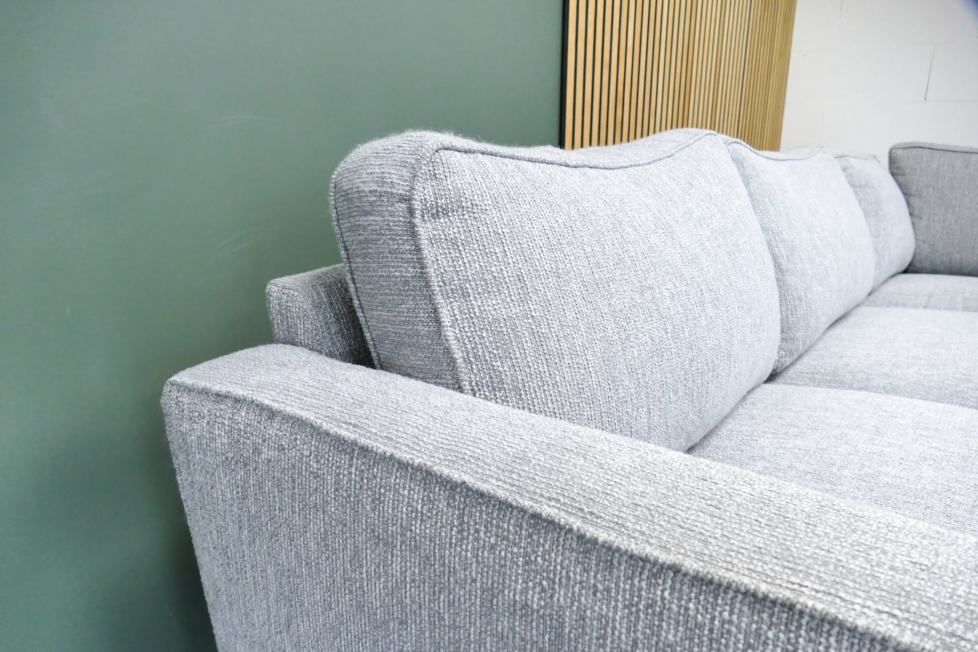 Lichtgrijze industriële hoekbank met vaste rugkussens en moderne uitstraling. De bank is extra opgevuld voor langdurig ondersteunend zitcomfort en verkeert in uitstekende staat.
