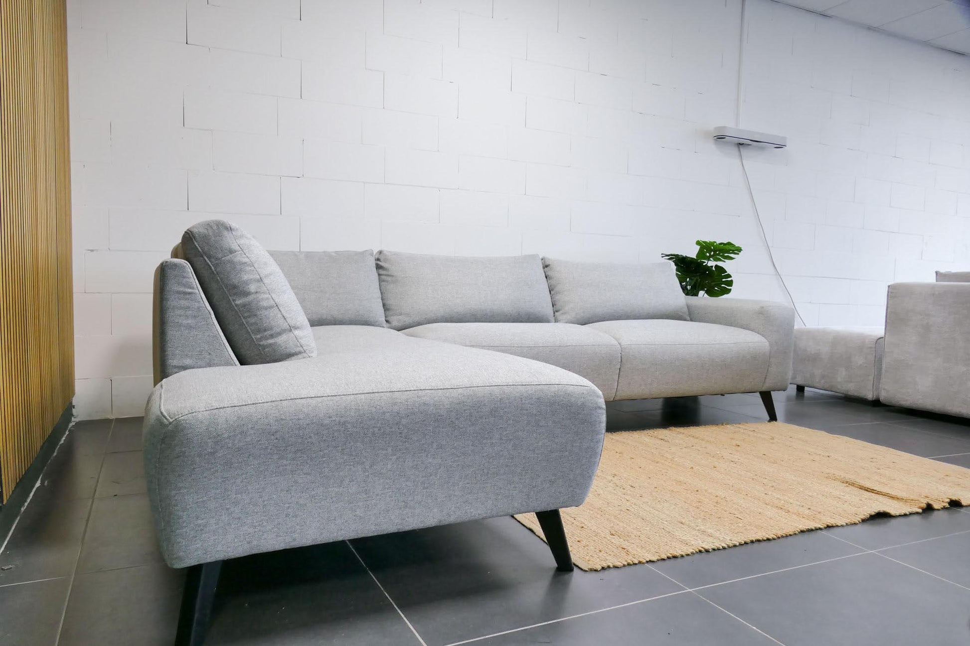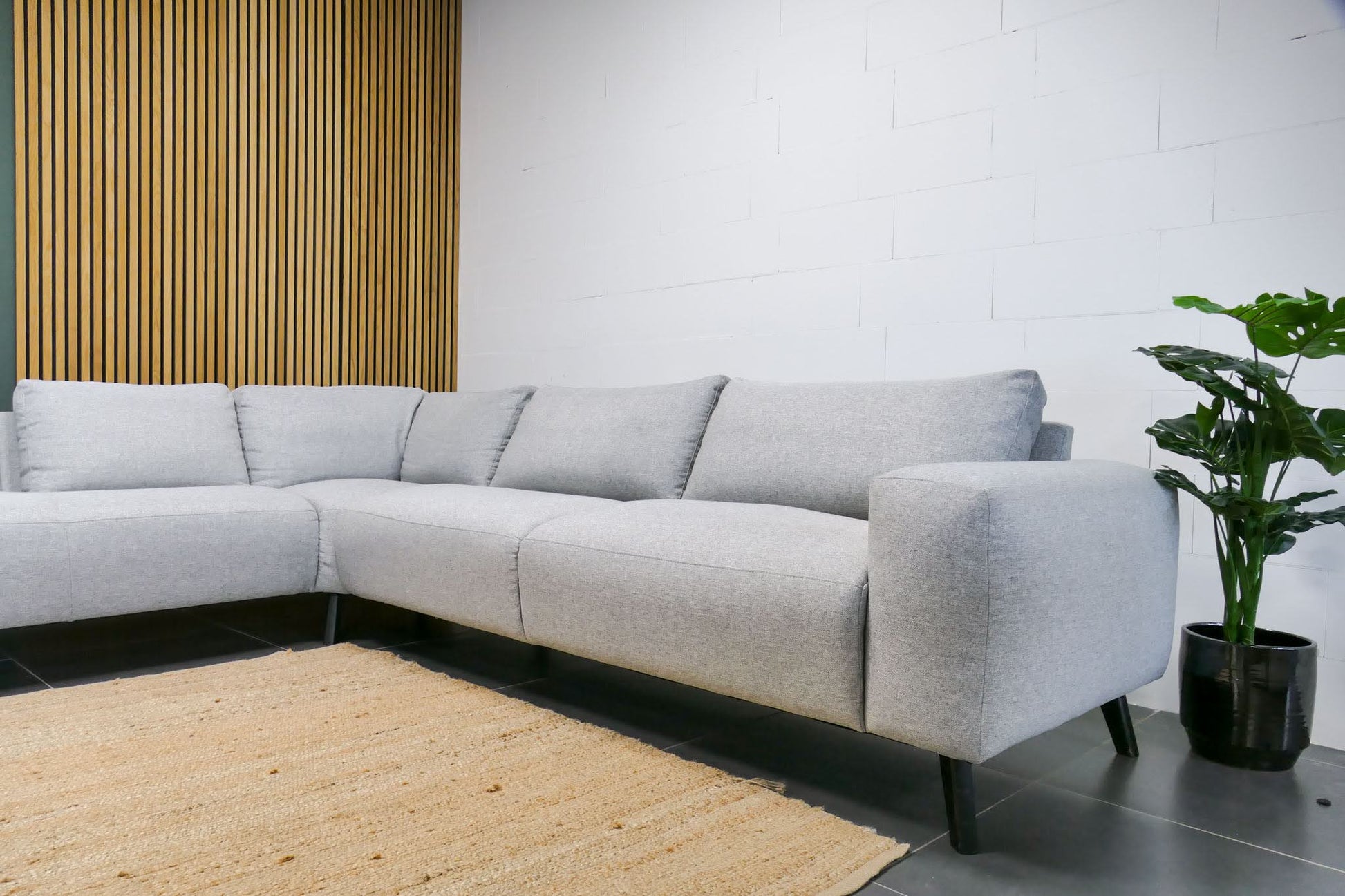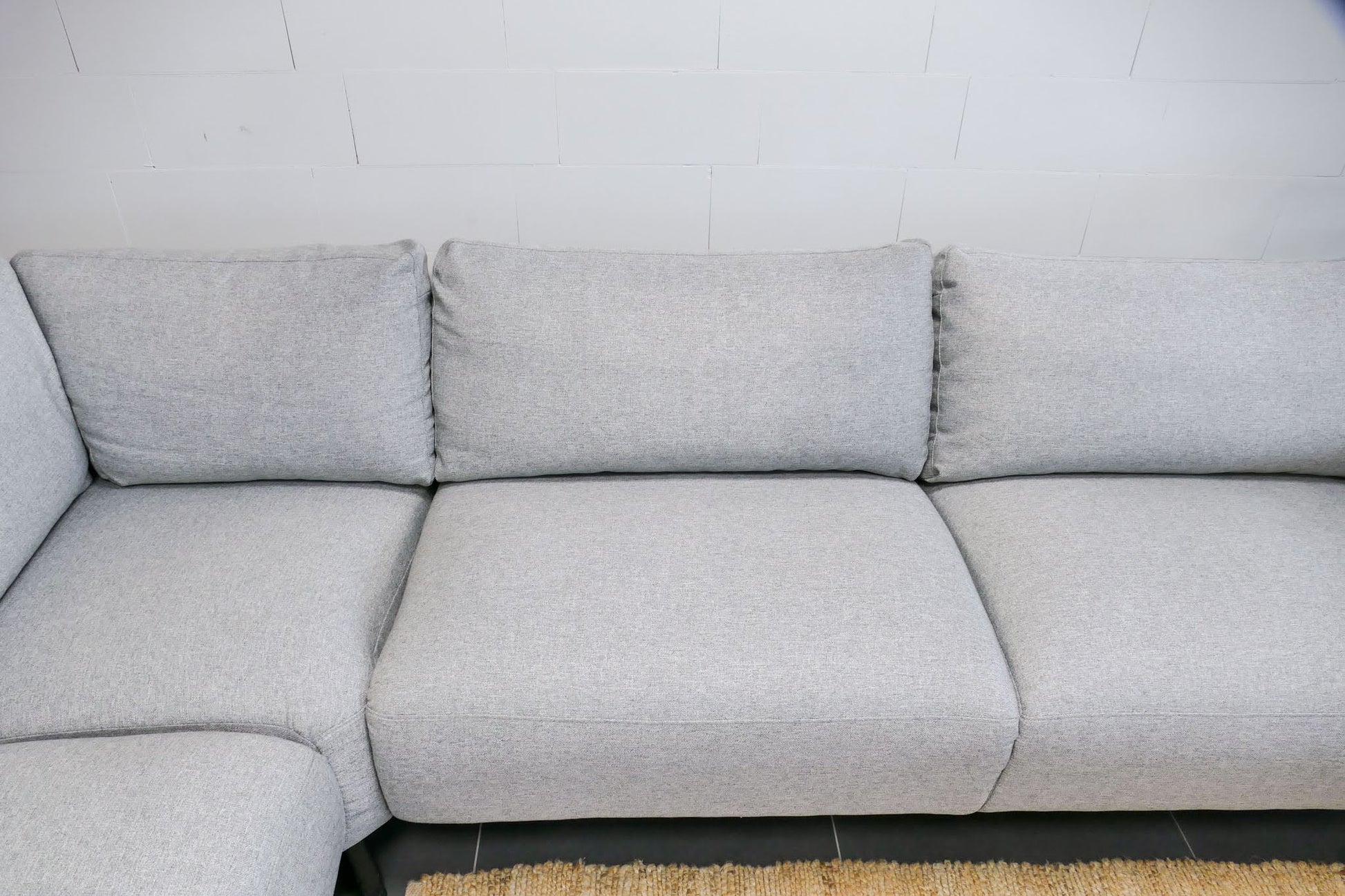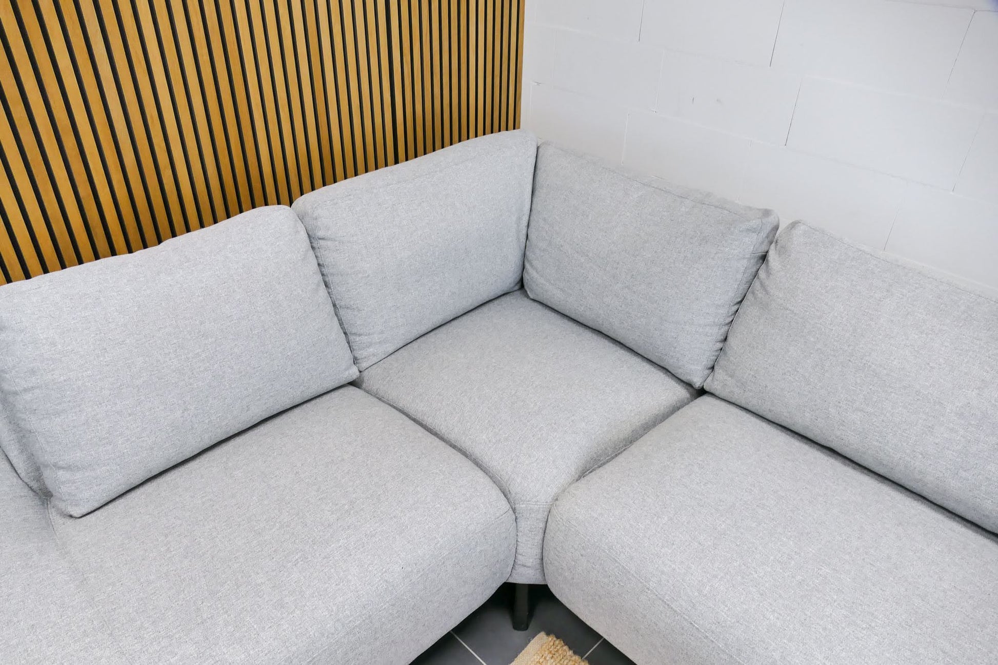 Hoekbank in lichtgrijze gemêleerde stof met vaste zitkussens. Comfortabele zit met normale zithouding en een modern, rustig design.