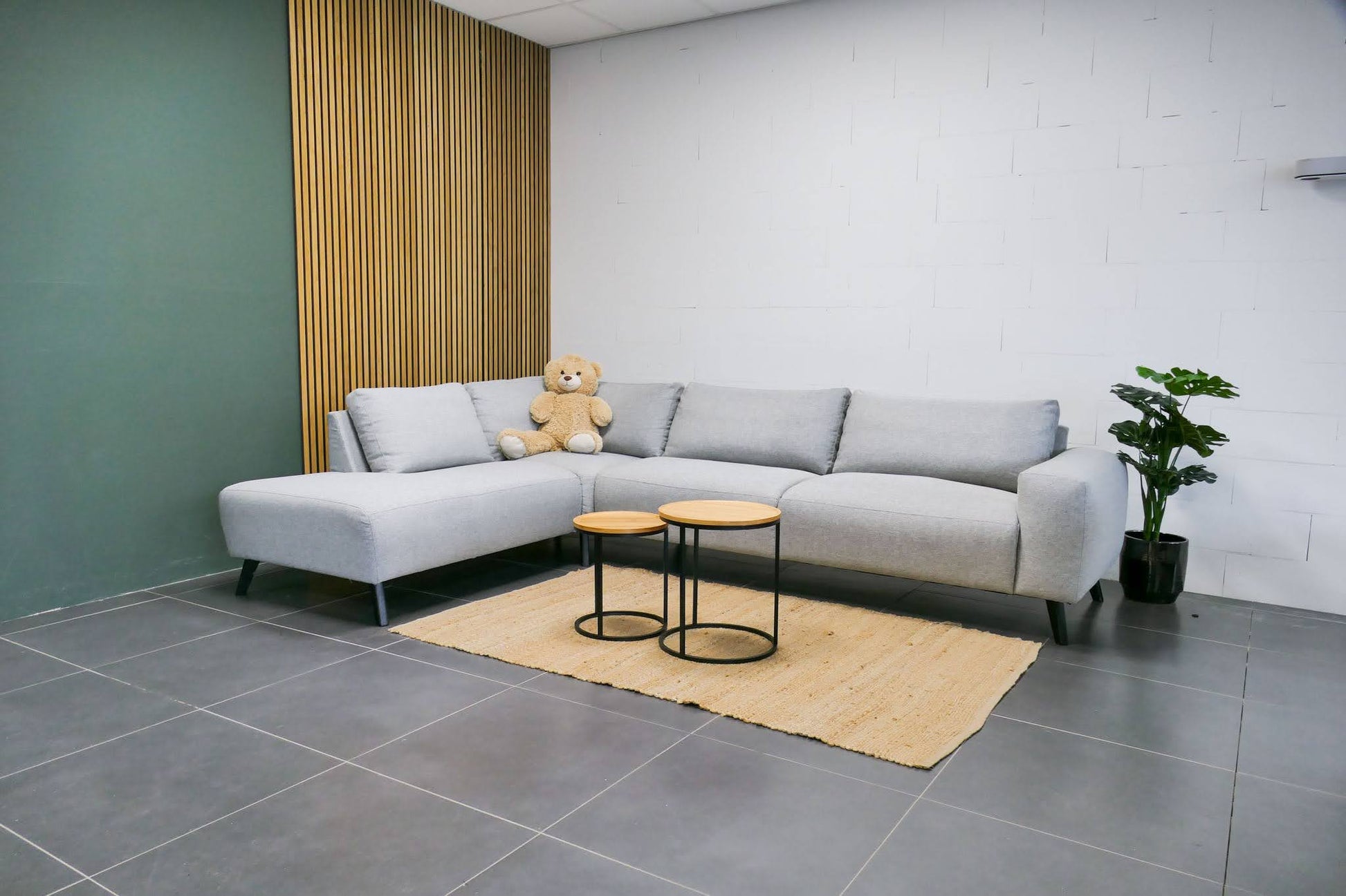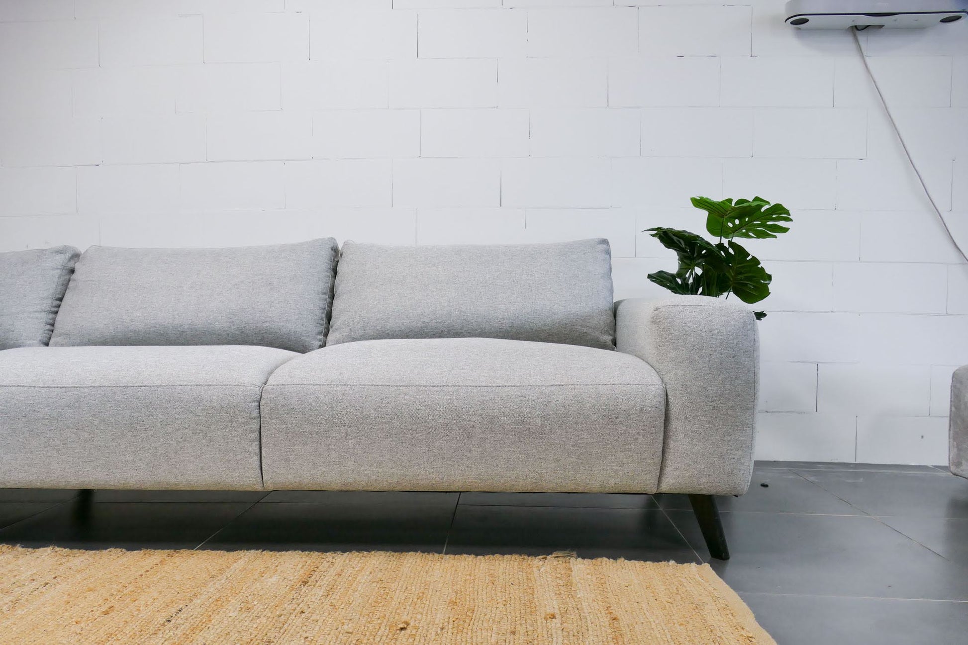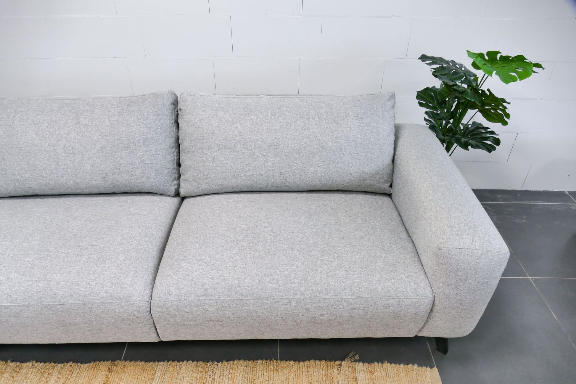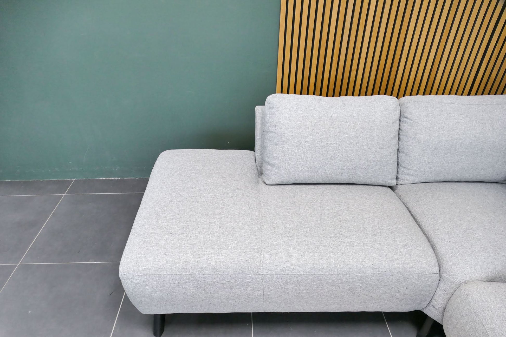 Hoekbank in lichtgrijze gemêleerde stof met vaste zitkussens. Comfortabele zit met normale zithouding en een modern, rustig design.