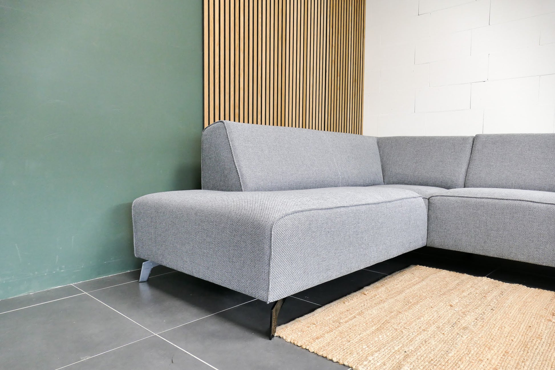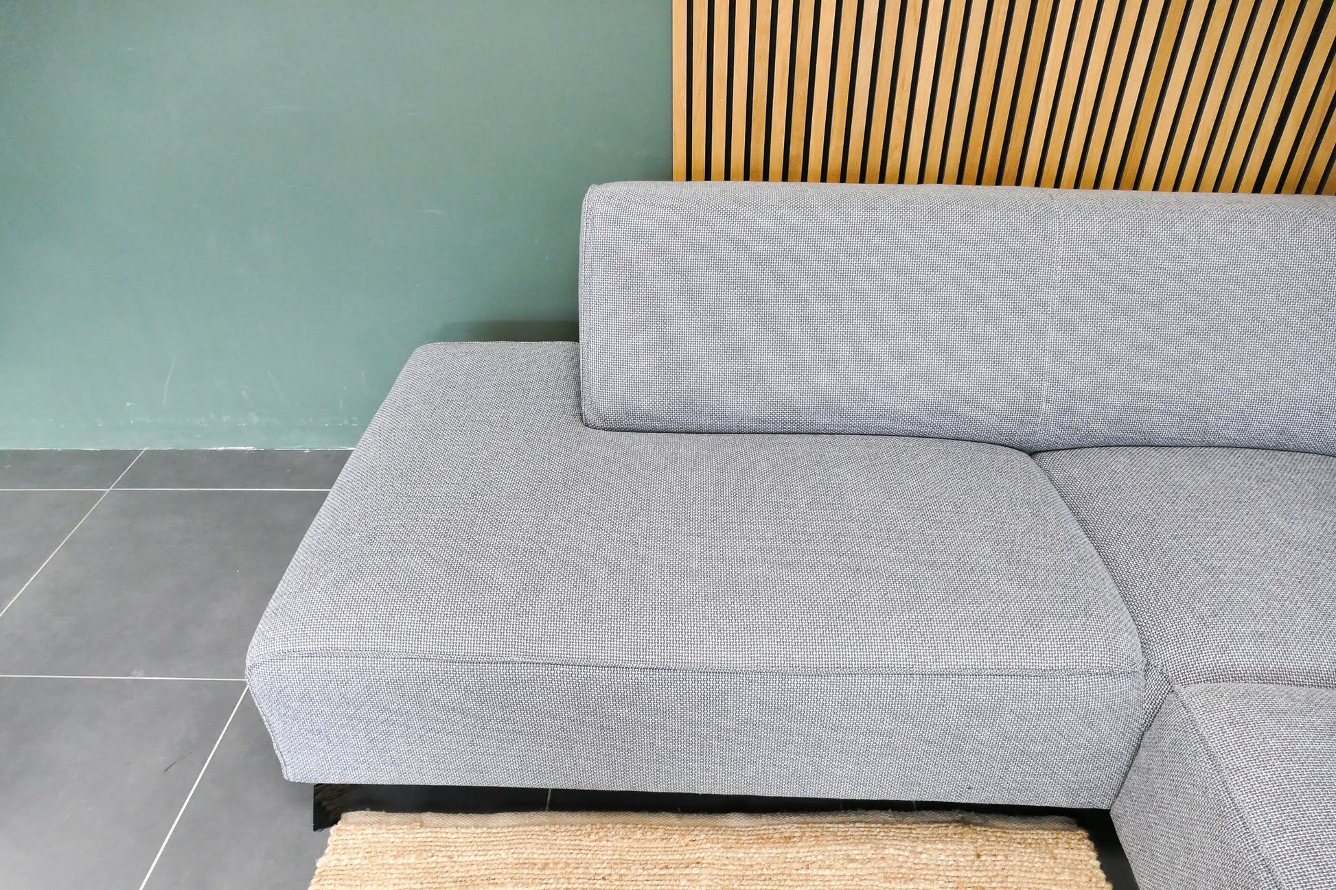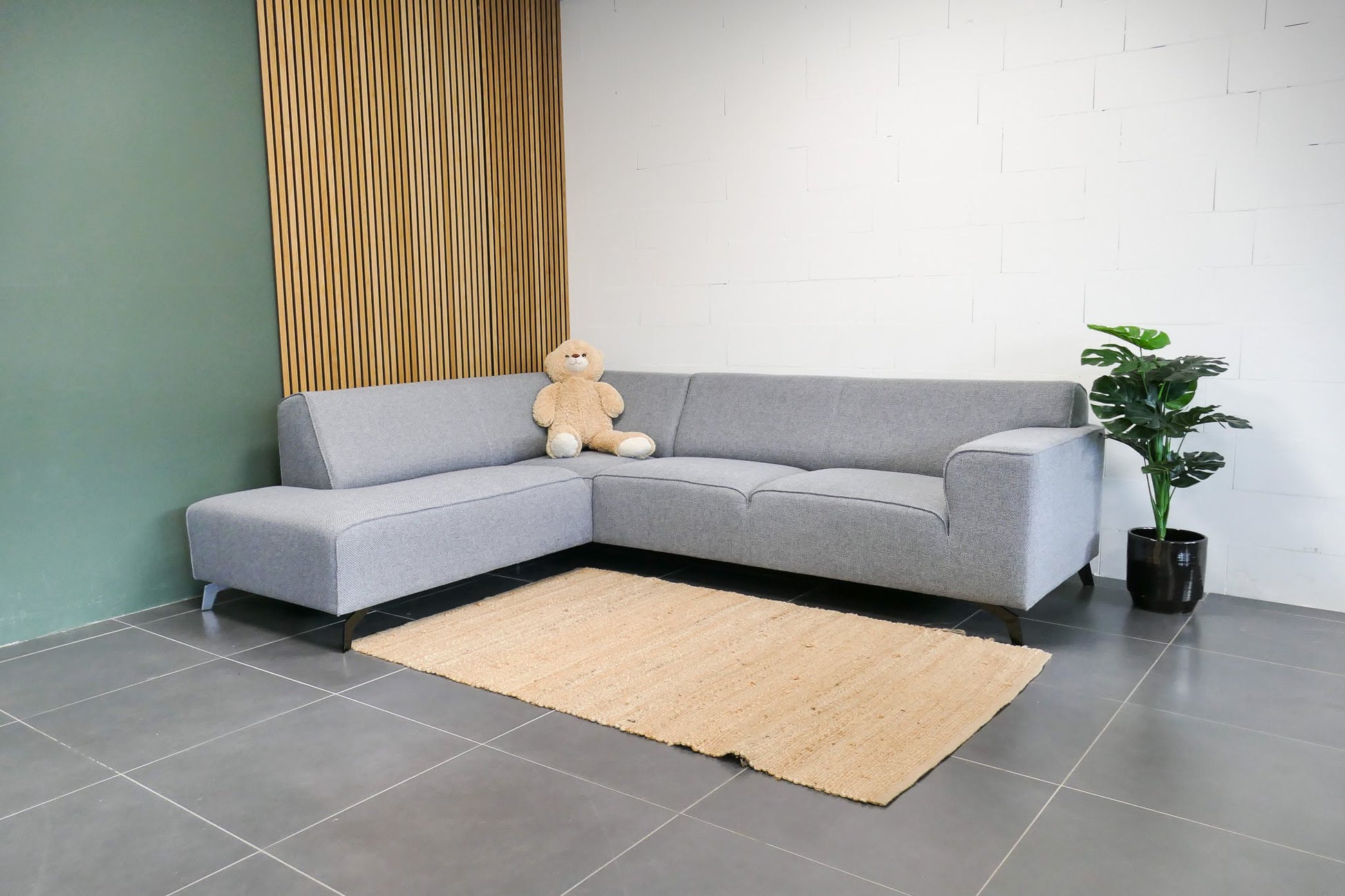 Lichtgrijze Sanders Eliot hoekbank met vaste rugkussens en een stevige, slijtvaste stof. De bank is extra opgevuld voor langdurig ondersteunend zitcomfort en voorzien van zitvlakken van kwalitatief koudschuim.