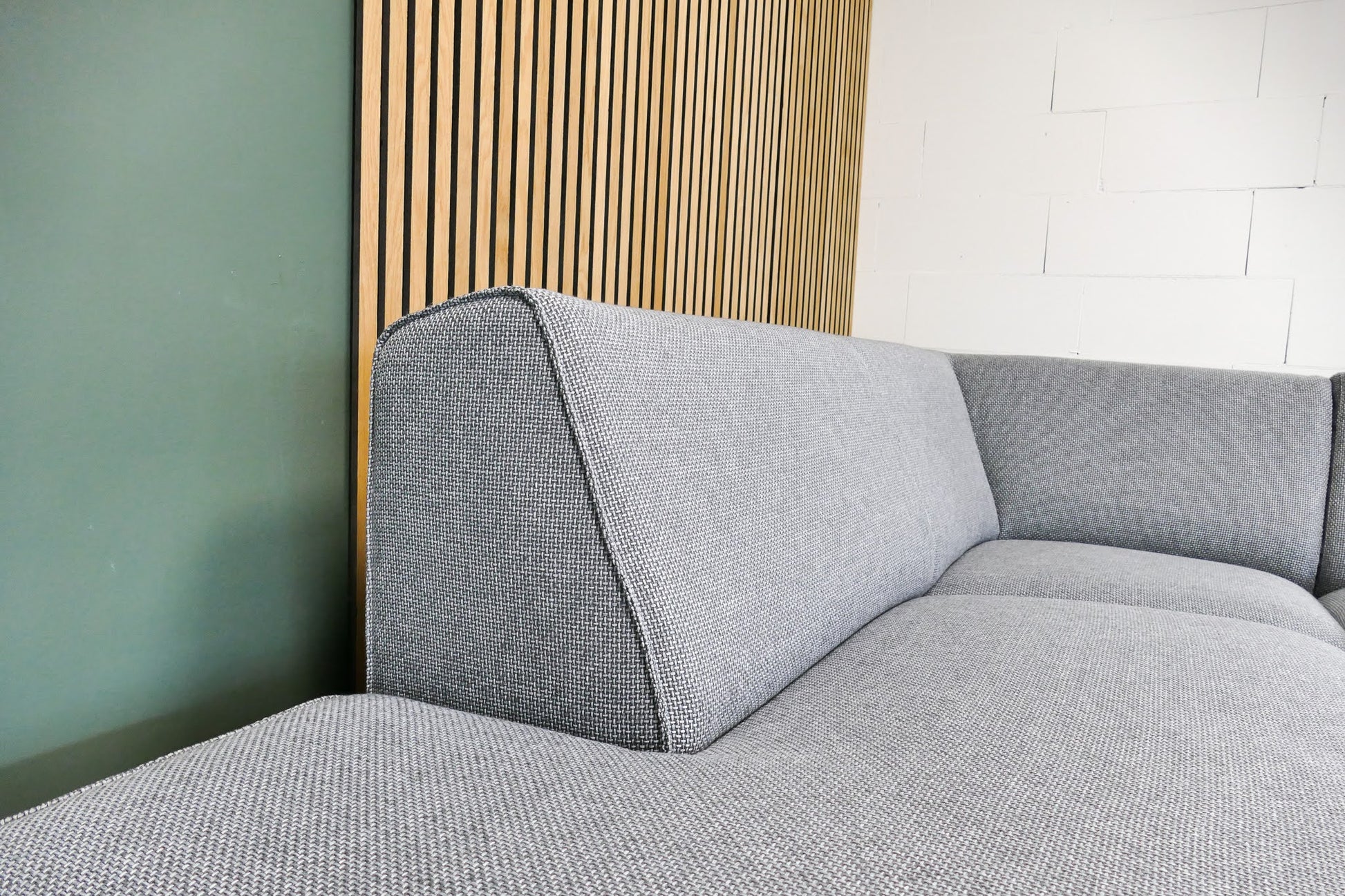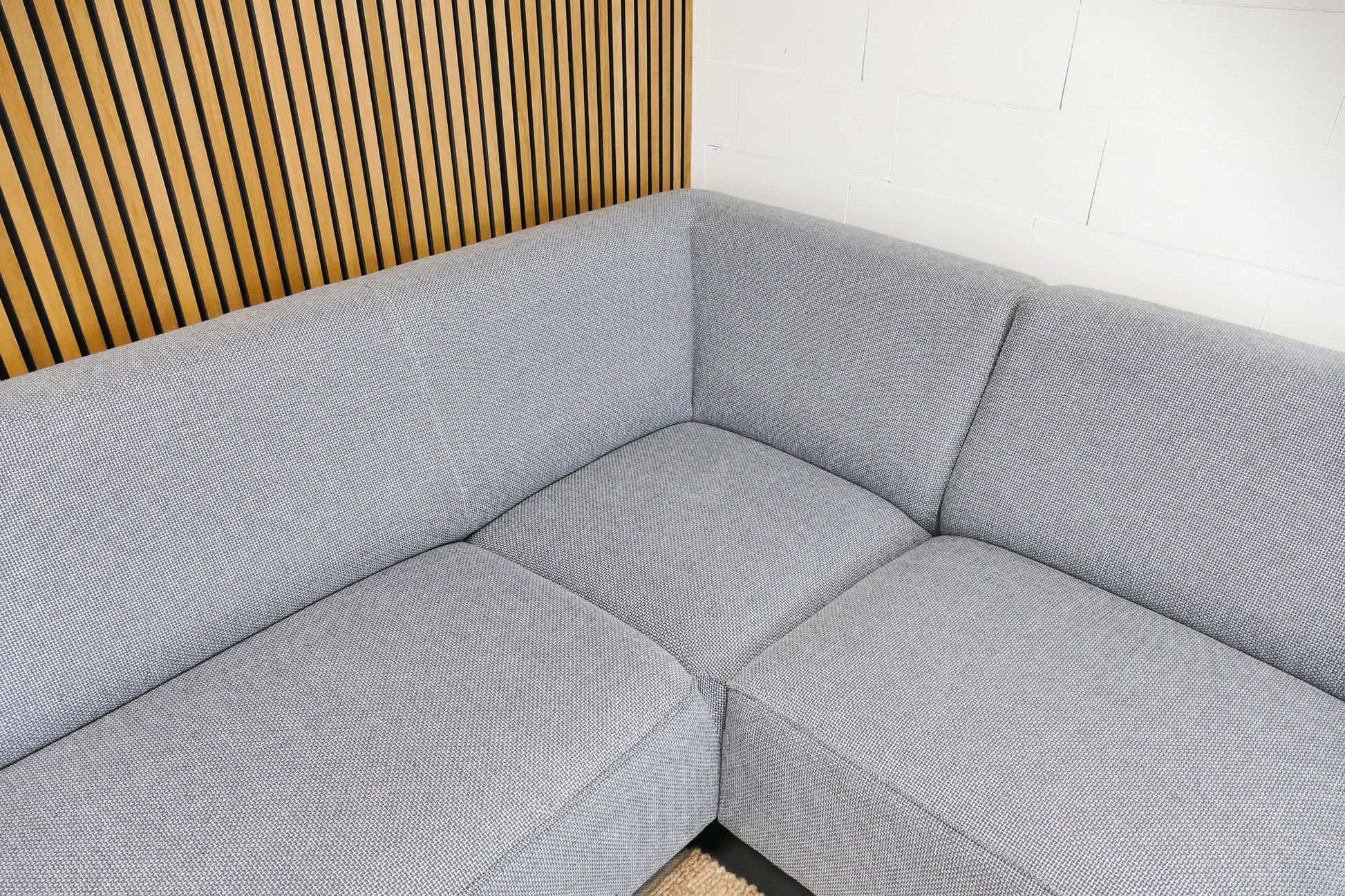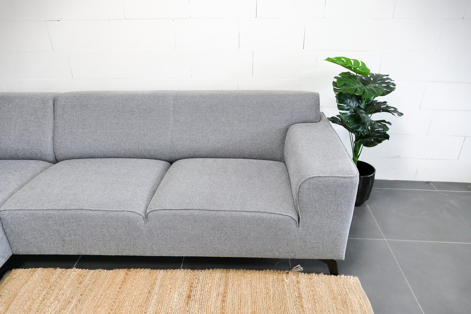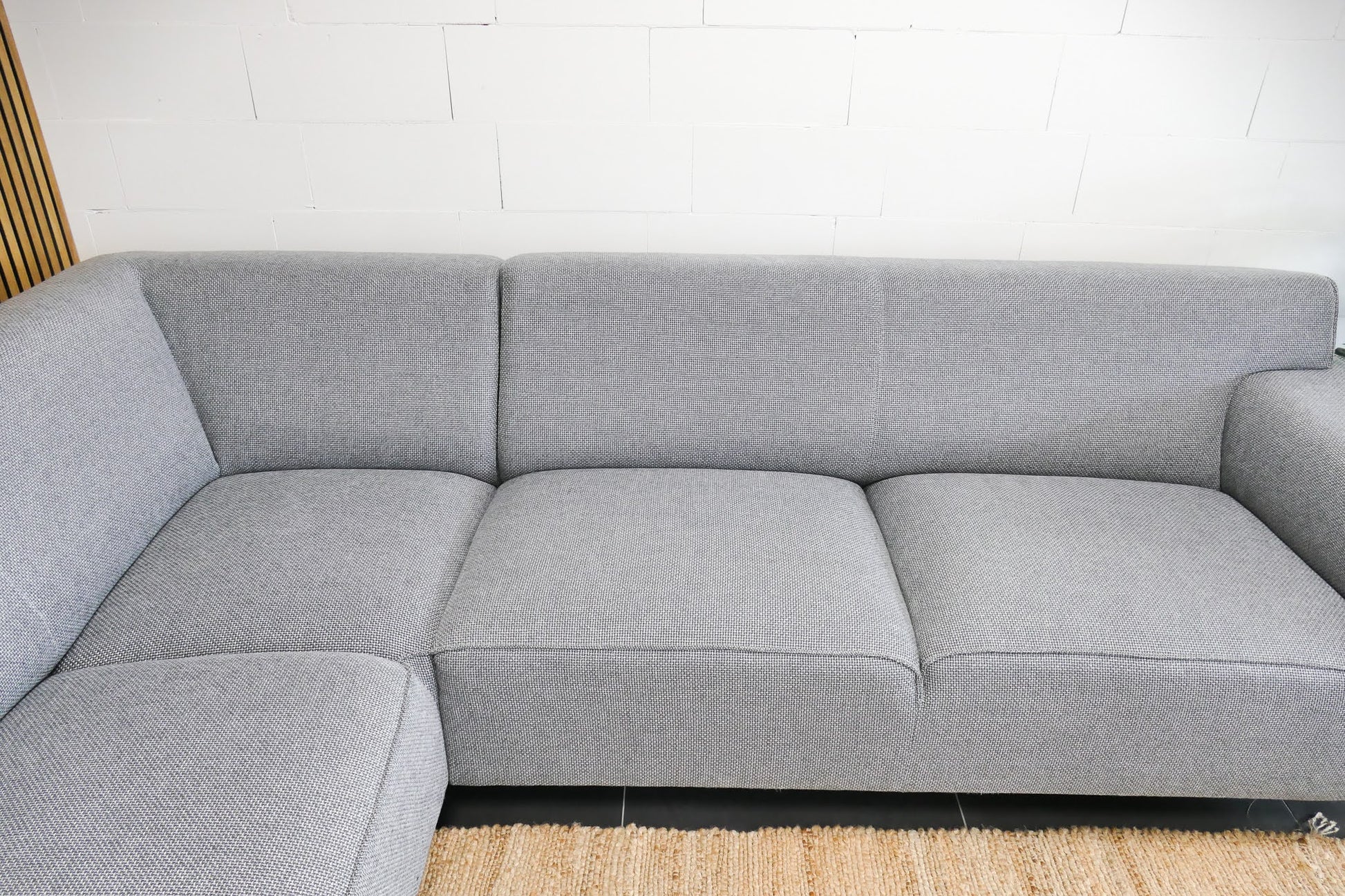 Lichtgrijze Sanders Eliot hoekbank met vaste rugkussens en een stevige, slijtvaste stof. De bank is extra opgevuld voor langdurig ondersteunend zitcomfort en voorzien van zitvlakken van kwalitatief koudschuim.