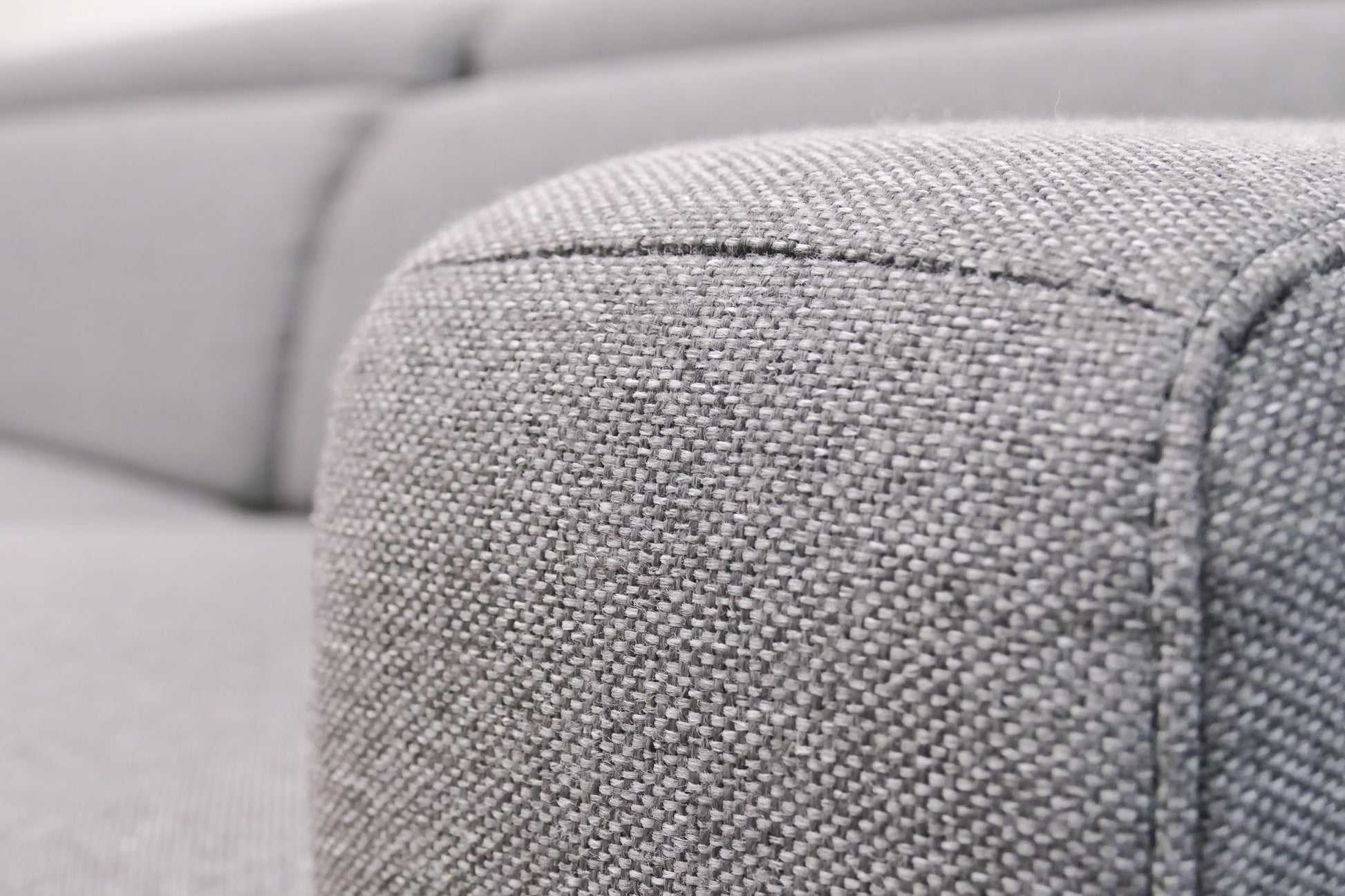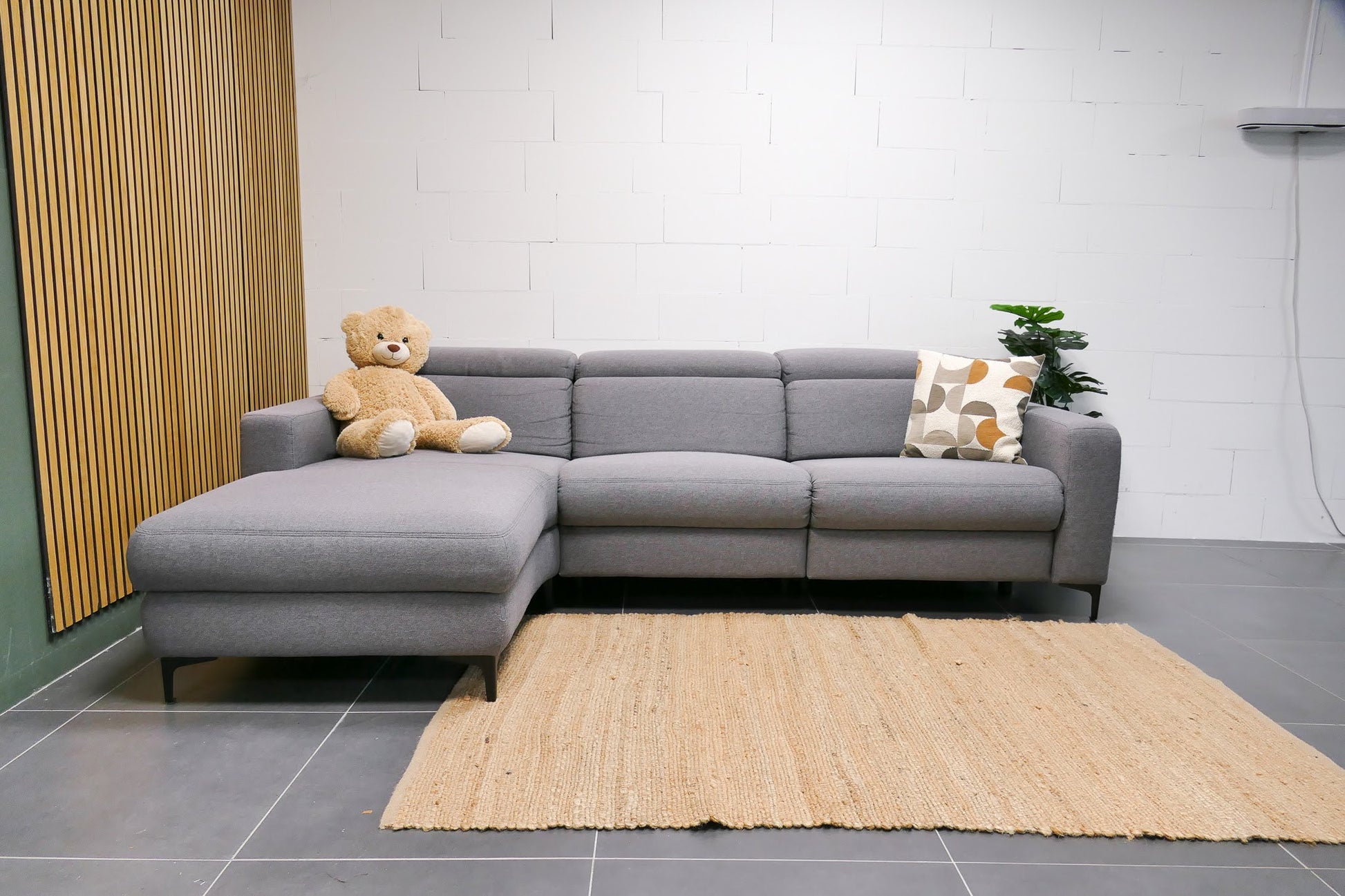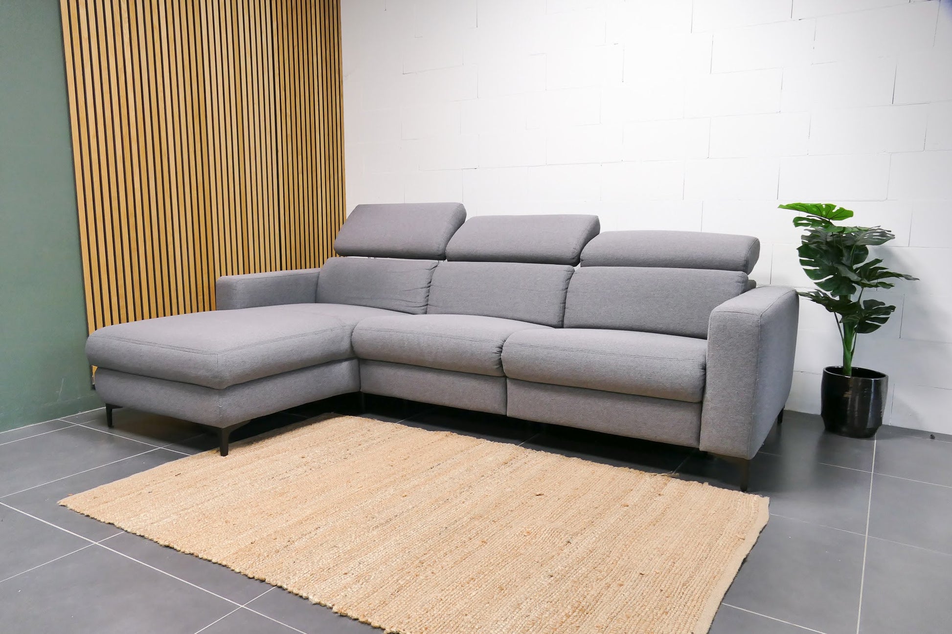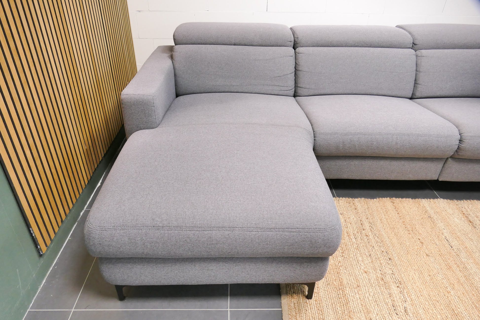 Moderne Montèl chaise longue Riva in grijze stof, uitgevoerd met verstelbare rug- en hoofdsteunen voor extra comfort. De bank biedt een stevige en prettige zit en heeft een tijdloze uitstraling die goed past in diverse woonstijlen. De staat is zeer goed, met lichte verkleuring in de hoeken waar kussens hebben gelegen.
