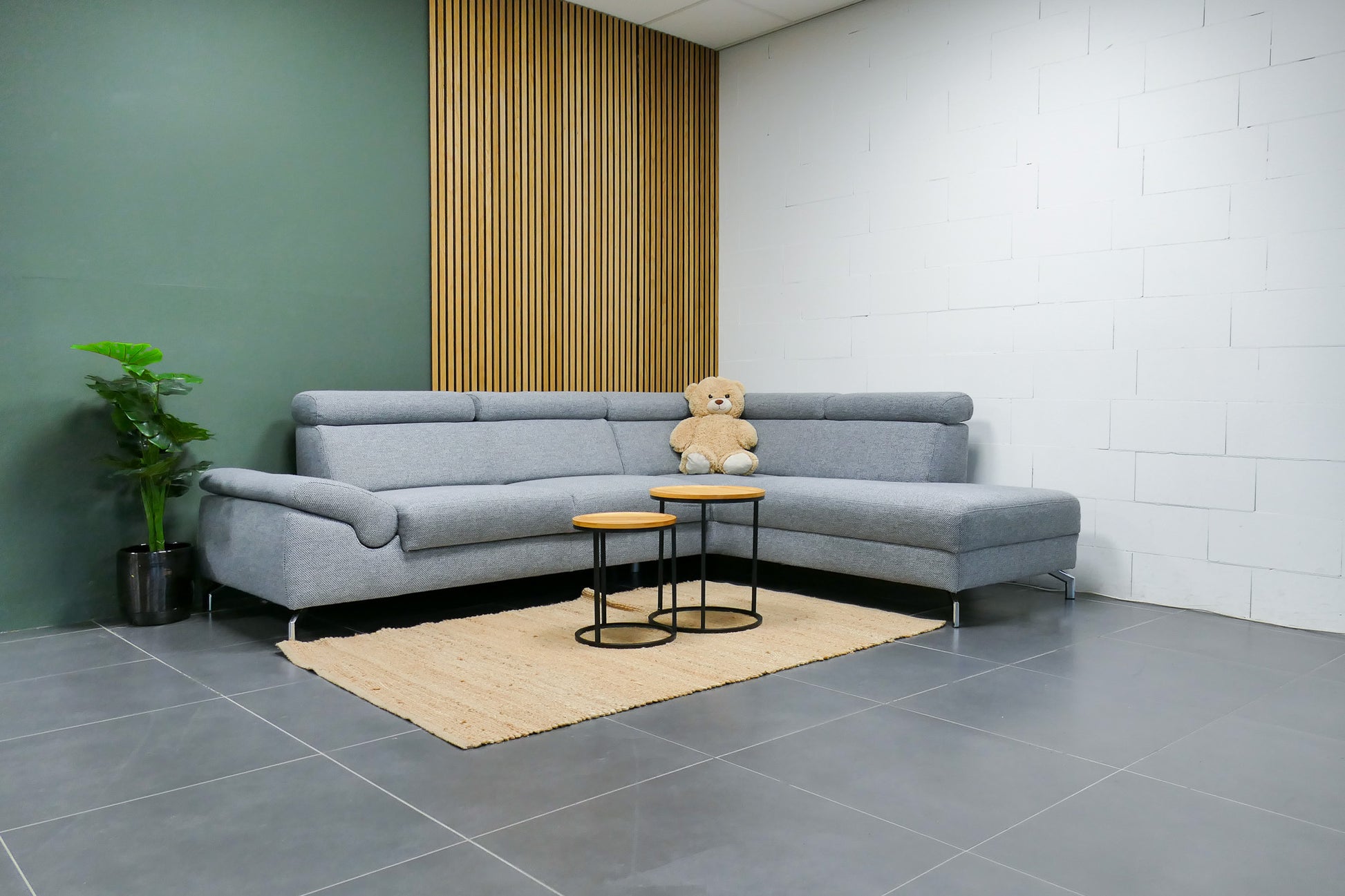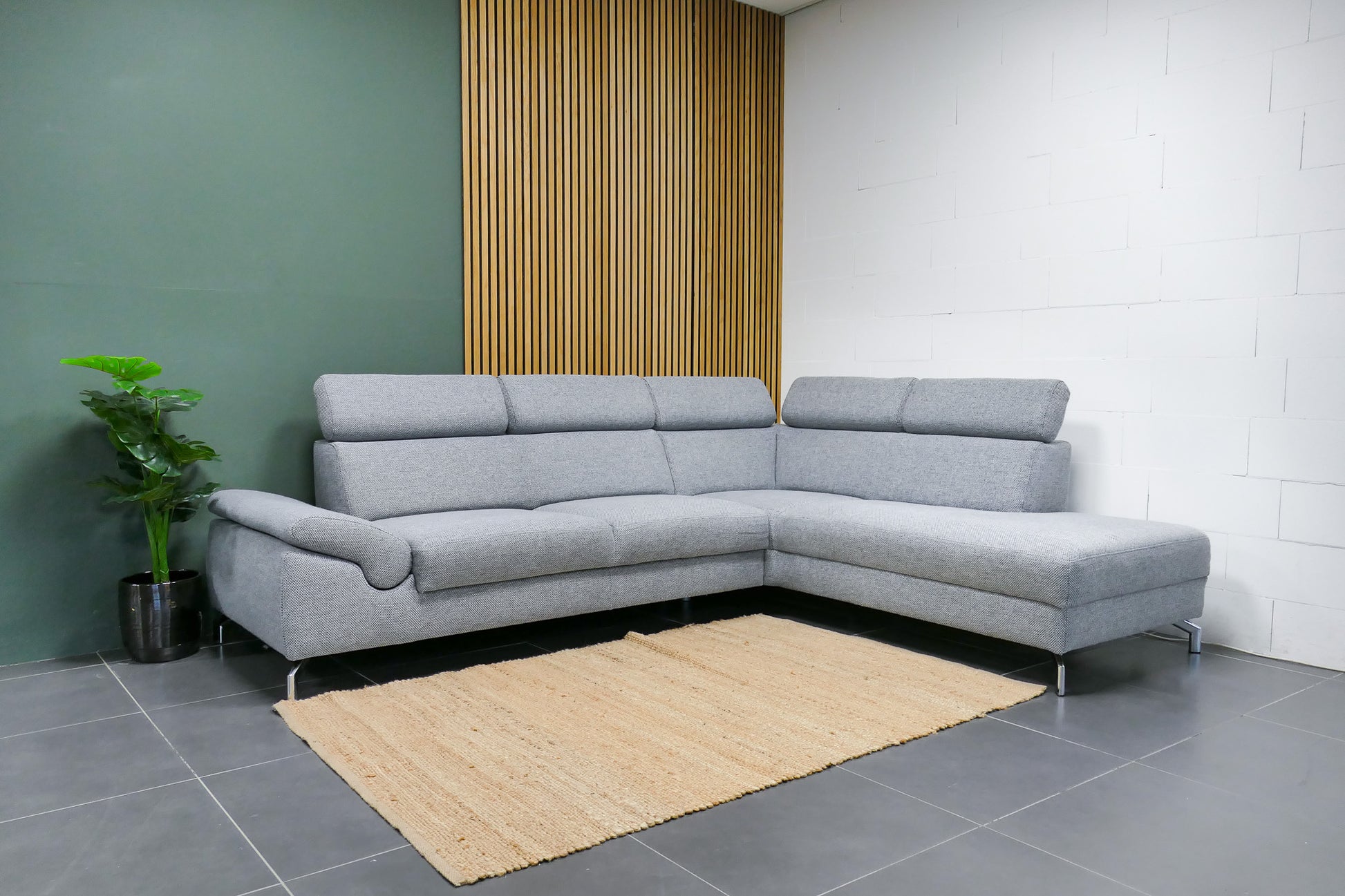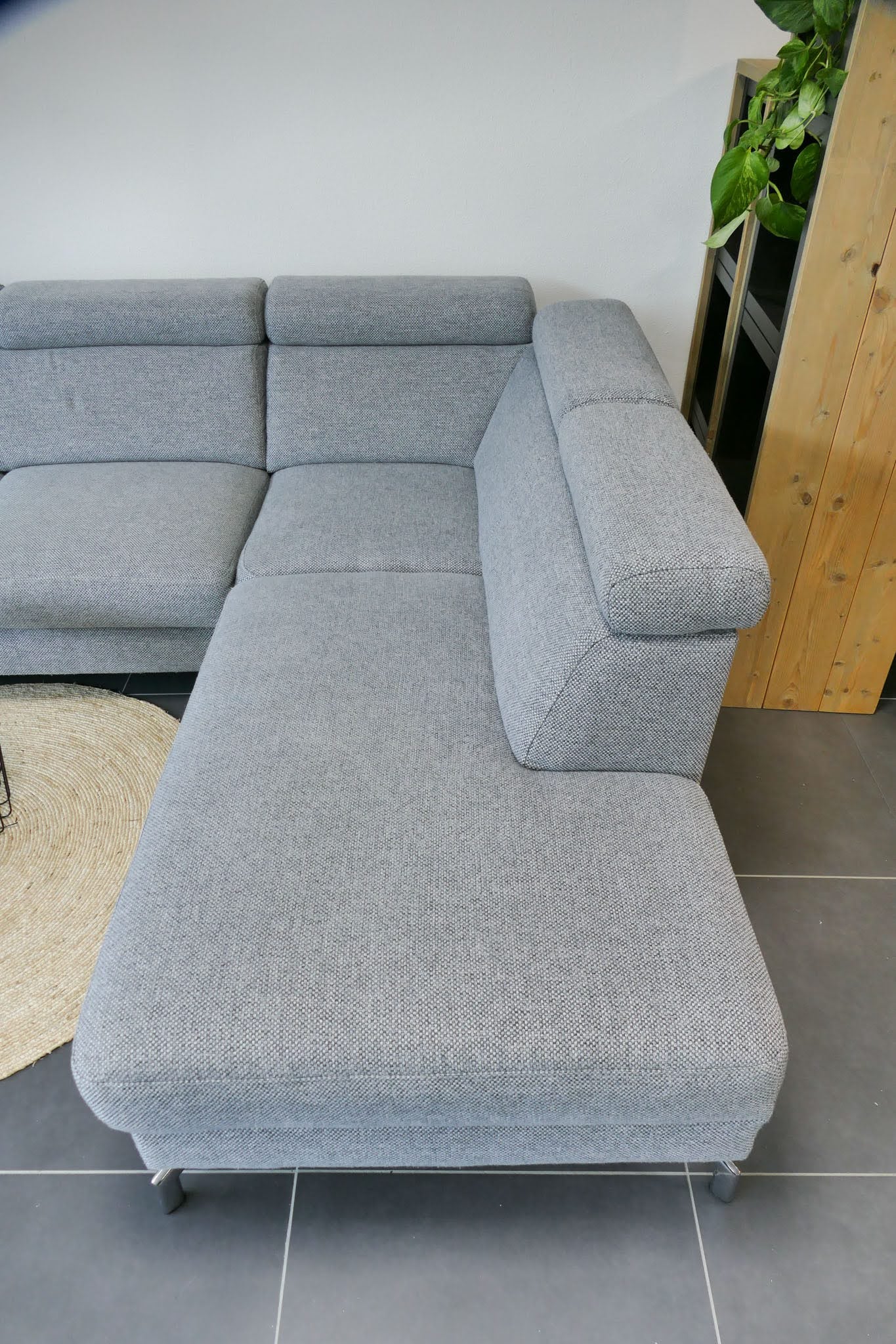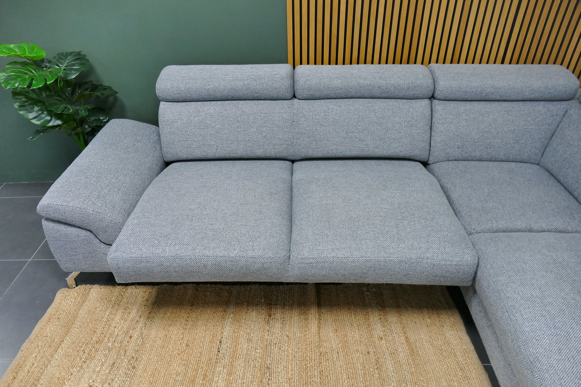 Lichtgrijze Montèl Chicago hoekbank met verstelbare armleuning, verstelbare hoofdsteunen en een uitschuifbaar zitgedeelte. De bank is opgevuld voor langdurig ondersteunend zitcomfort en voorzien van duurzame bonellvering. Verkeert in zeer goede staat met minimale gebruikssporen.