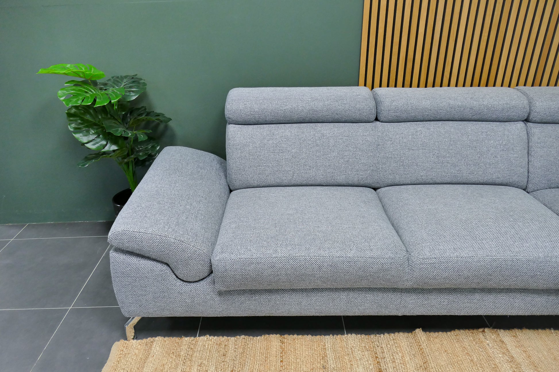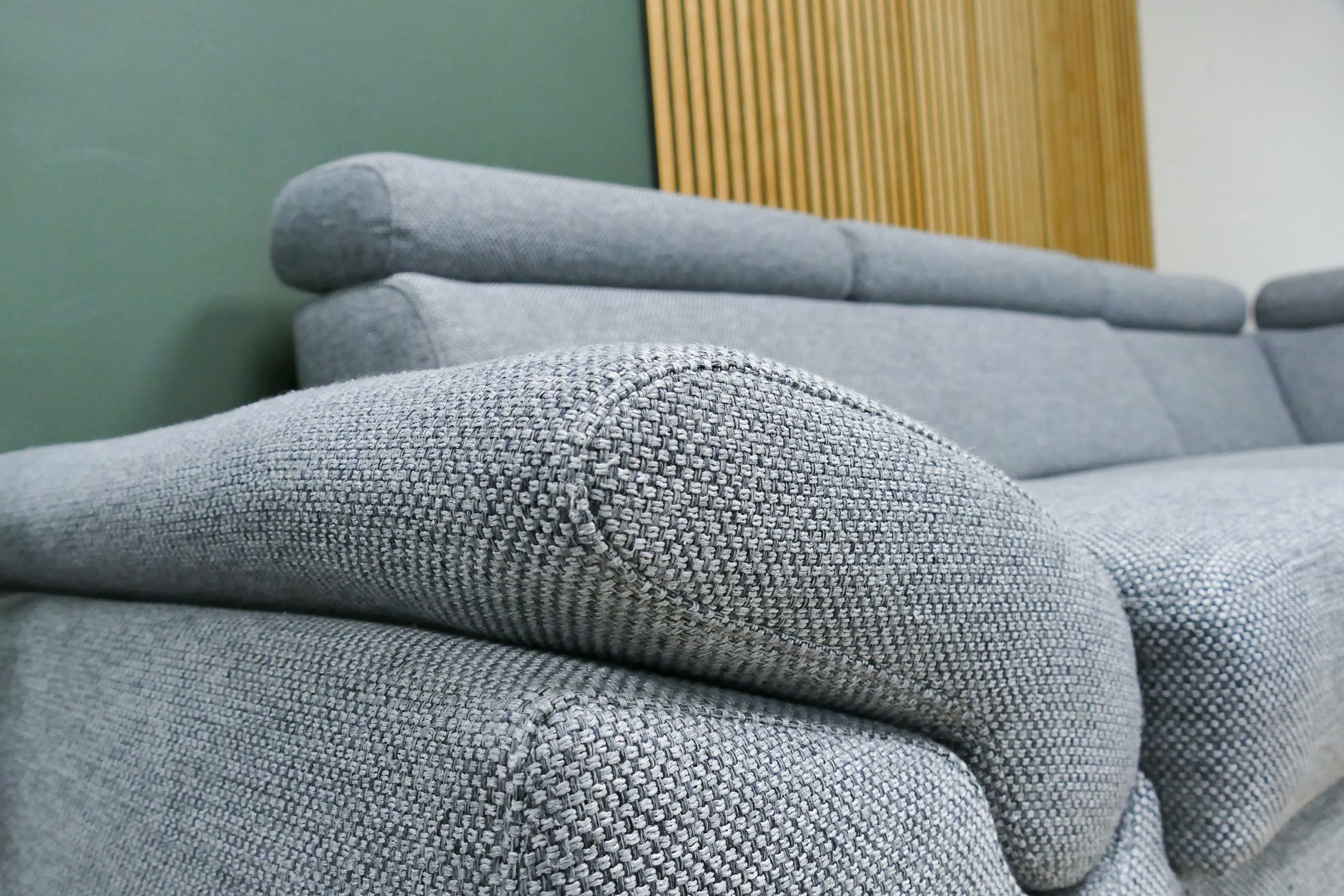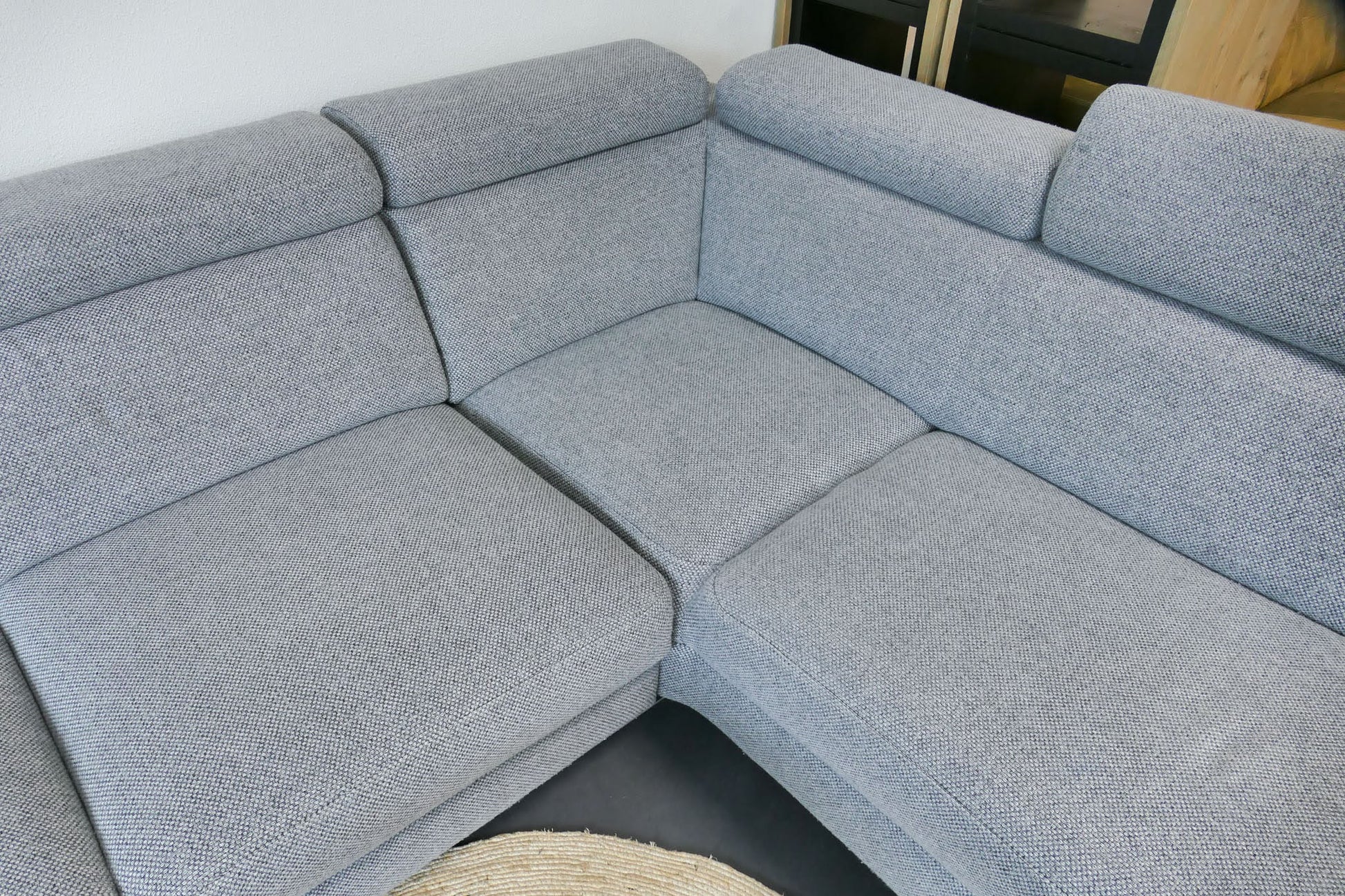 Lichtgrijze Montèl Chicago hoekbank met verstelbare armleuning, verstelbare hoofdsteunen en een uitschuifbaar zitgedeelte. De bank is opgevuld voor langdurig ondersteunend zitcomfort en voorzien van duurzame bonellvering. Verkeert in zeer goede staat met minimale gebruikssporen.