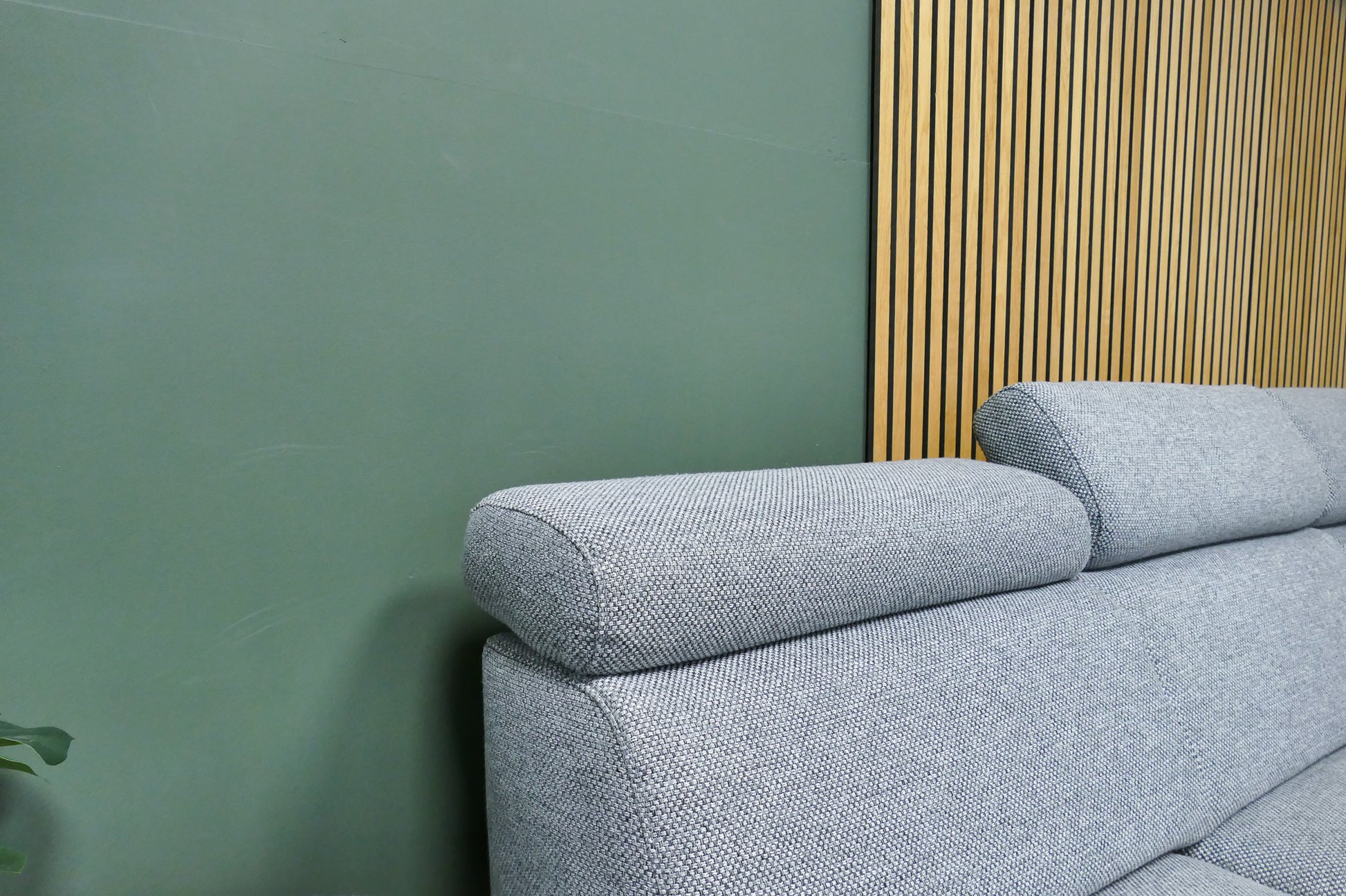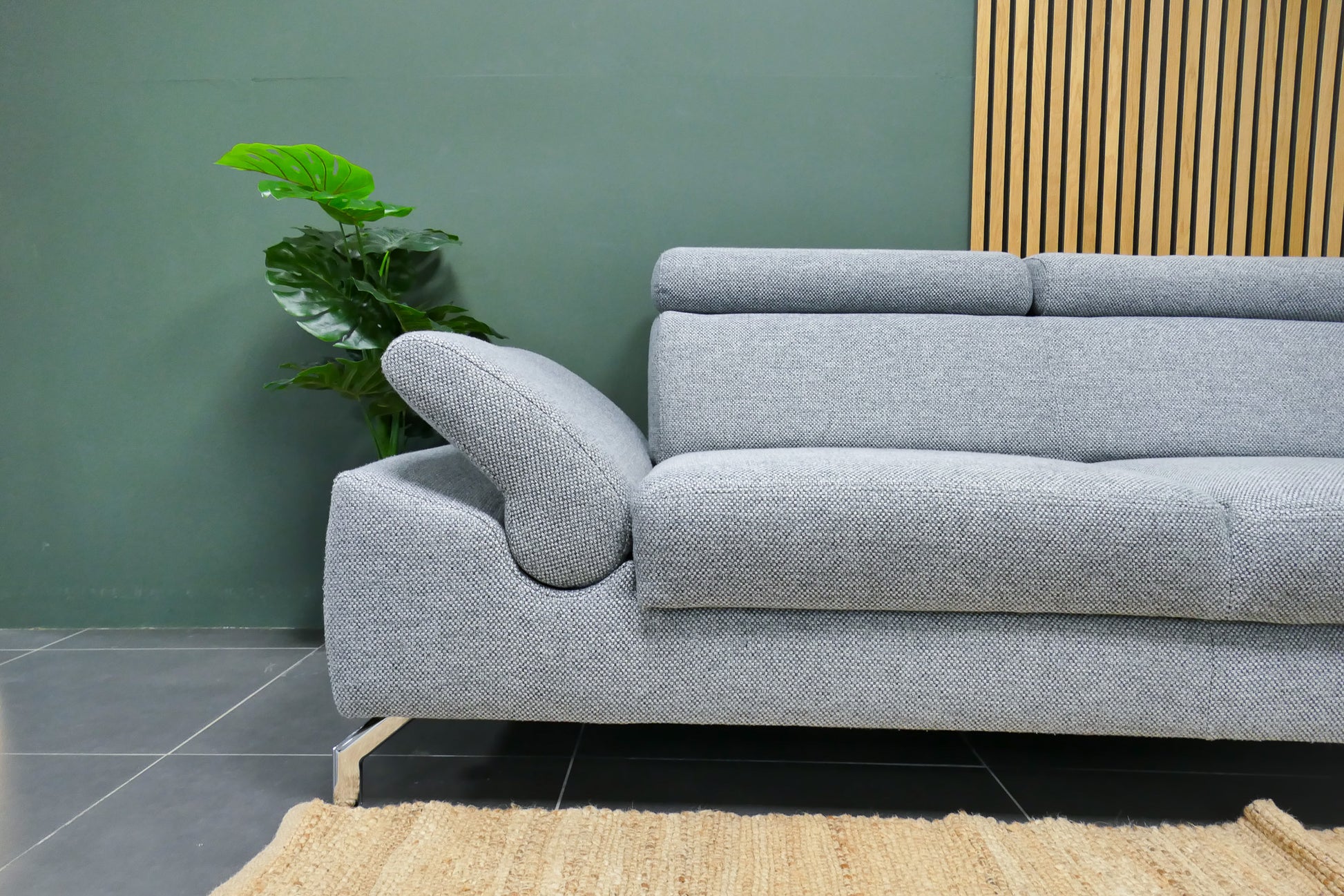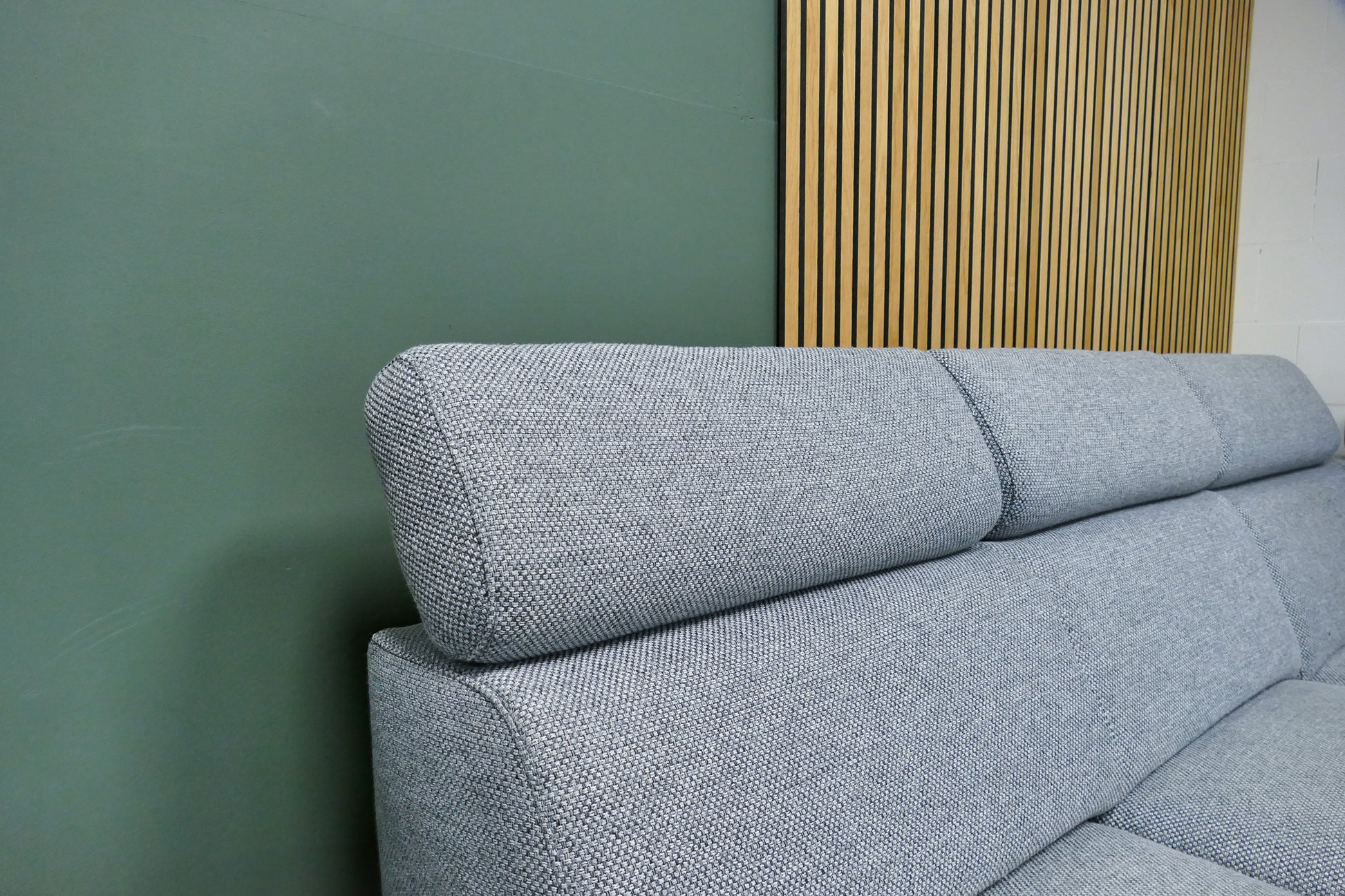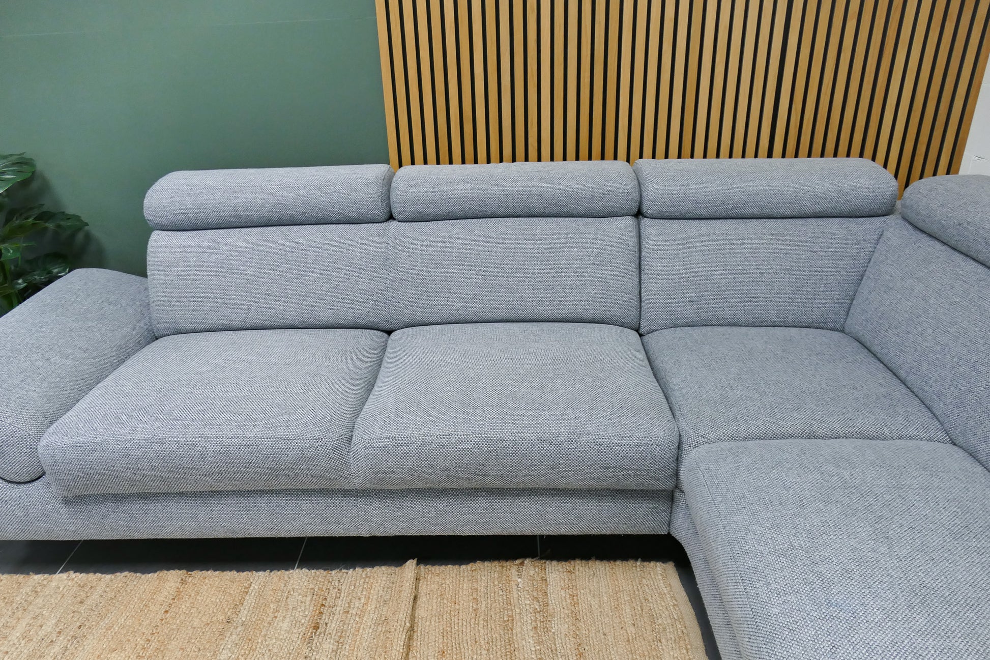Lichtgrijze Montèl Chicago hoekbank met verstelbare armleuning, verstelbare hoofdsteunen en een uitschuifbaar zitgedeelte. De bank is opgevuld voor langdurig ondersteunend zitcomfort en voorzien van duurzame bonellvering. Verkeert in zeer goede staat met minimale gebruikssporen.