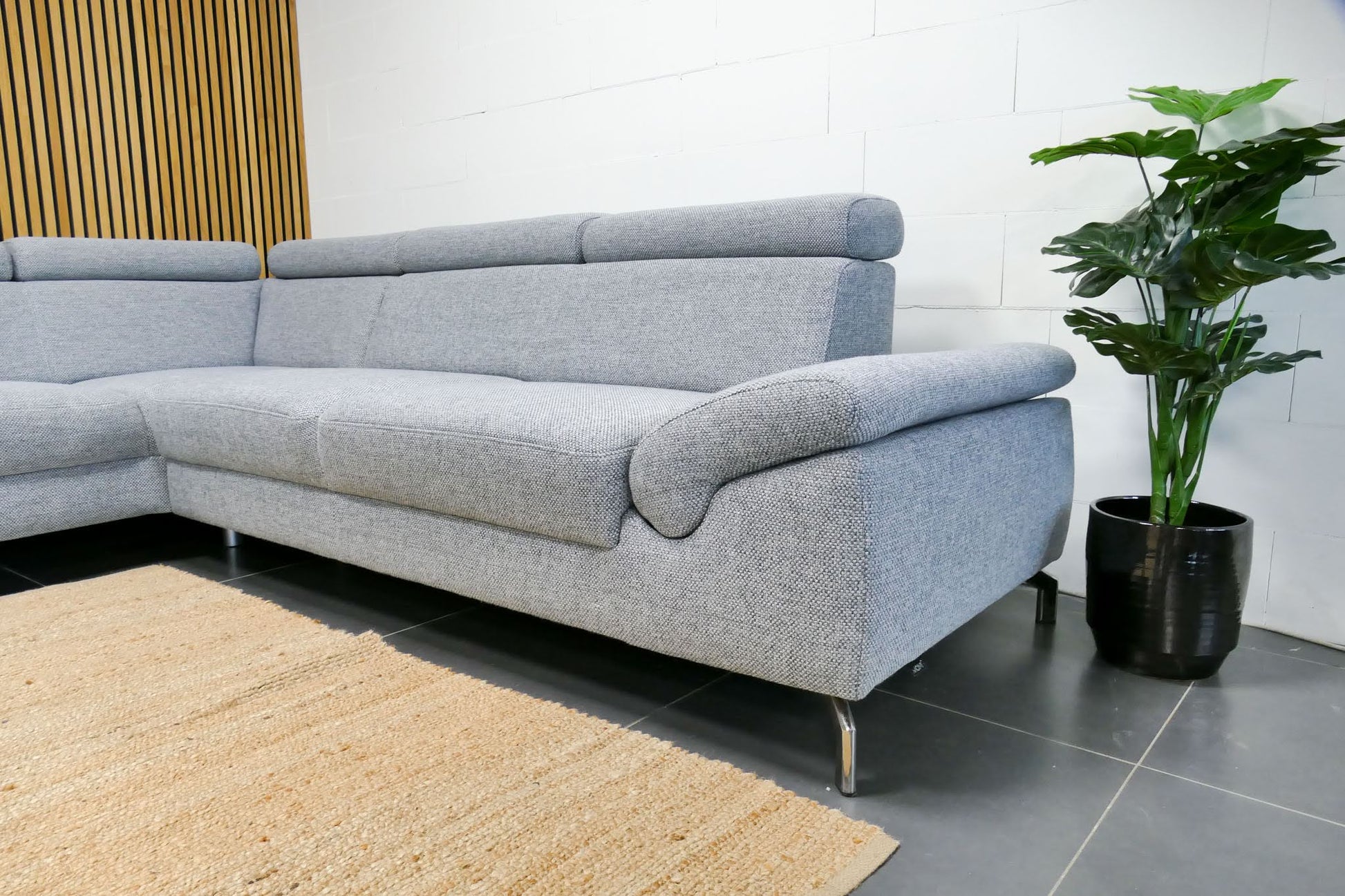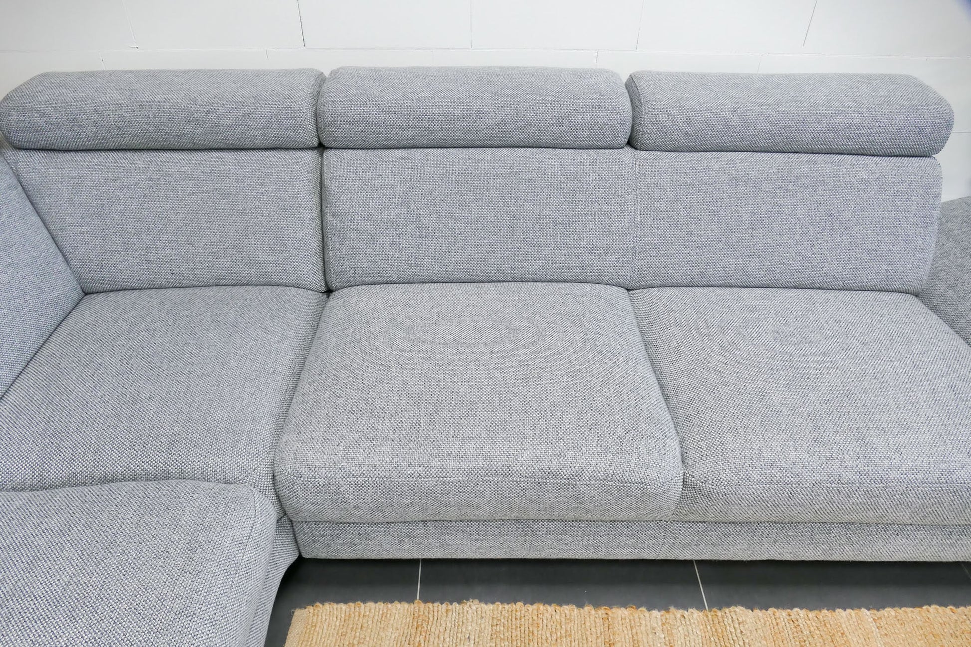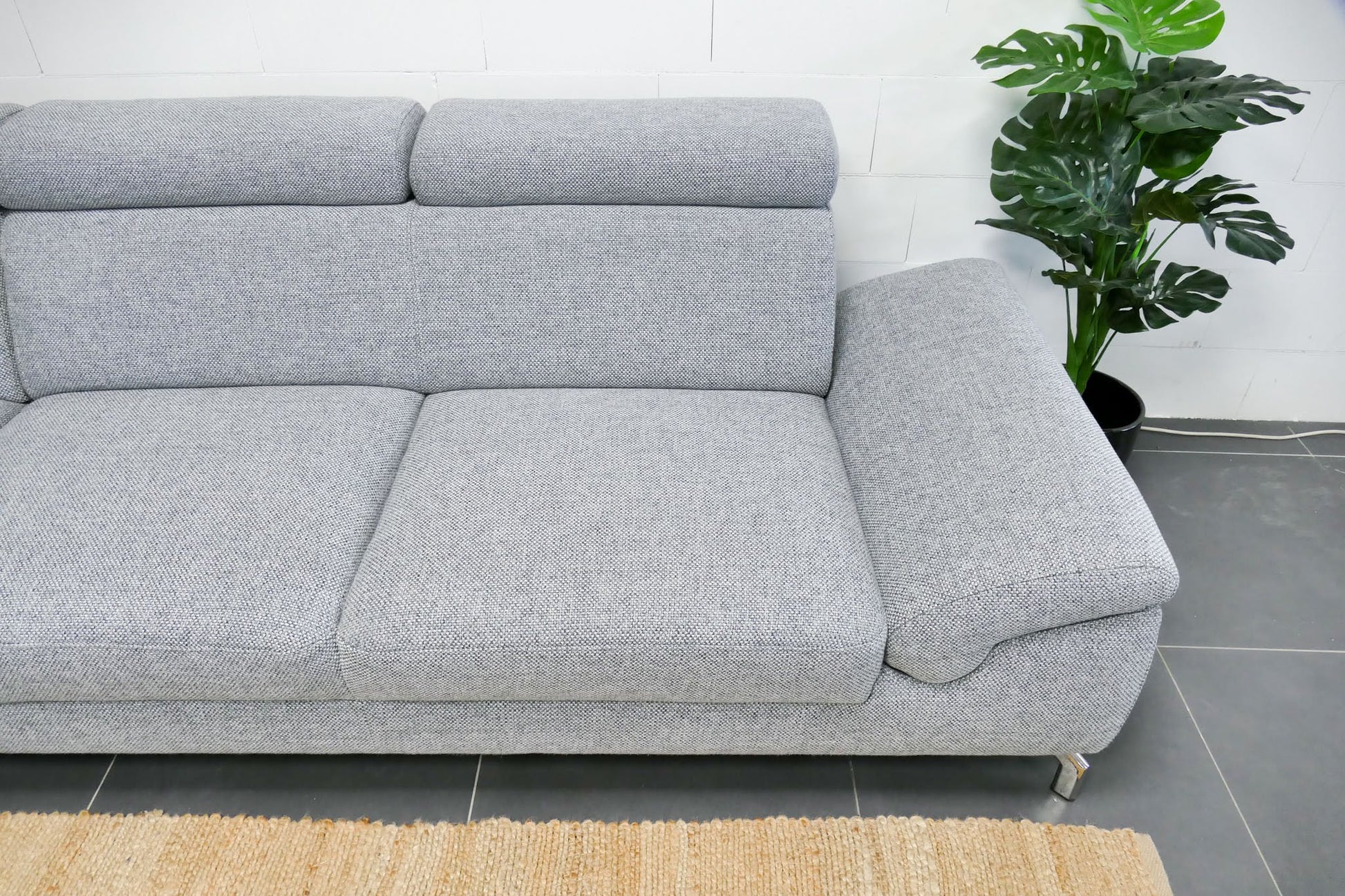 Lichtgrijze Montèl Chicago hoekbank met verstelbare rug- en hoofdsteunen en vaste rugkussens. De bank is opgevuld voor langdurig ondersteunend zitcomfort en verkeert in uitstekende staat.