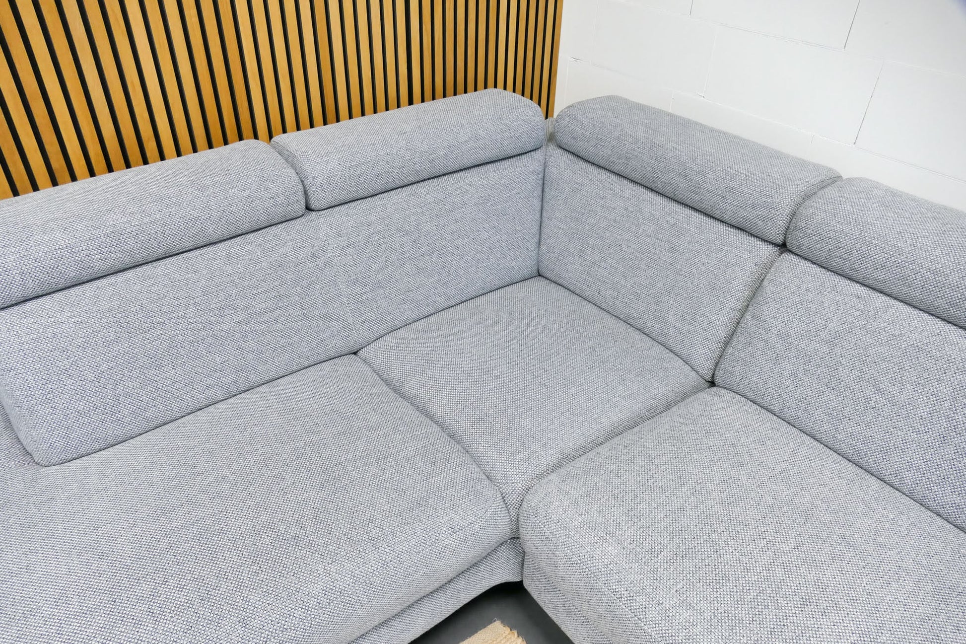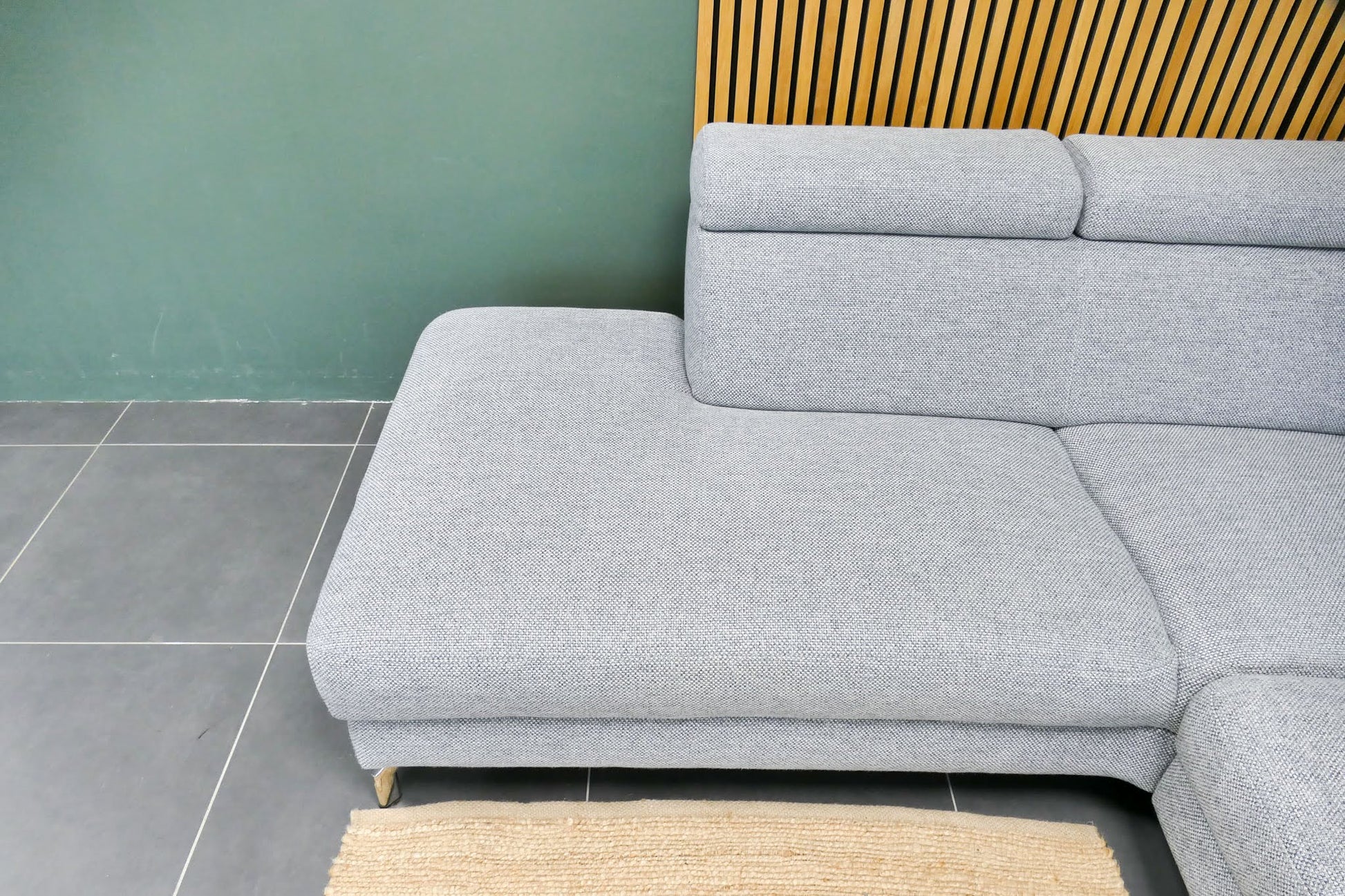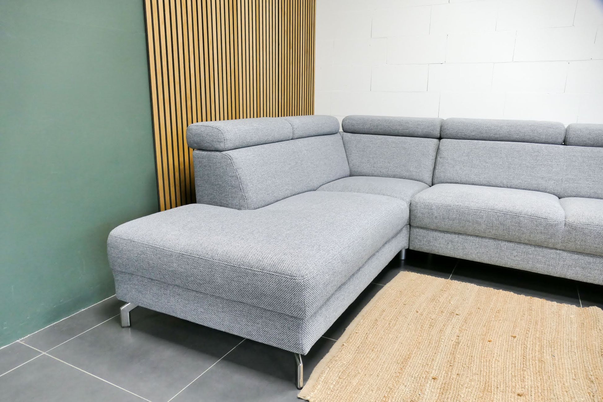 Lichtgrijze Montèl Chicago hoekbank met verstelbare rug- en hoofdsteunen en vaste rugkussens. De bank is opgevuld voor langdurig ondersteunend zitcomfort en verkeert in uitstekende staat.